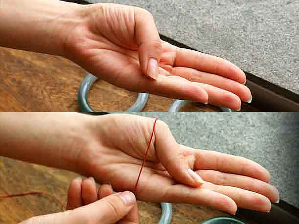 2) 把手自然放平,不要繃緊,用一根線圍著手掌最寬處的周長,量的時候如果手很軟的女士可以量緊點,手骨偏硬的可以量到剛好把線拉緊的程度即可,最後量出線的長度就是你的手寸大小了。量出的周長除以3.14,再加1~2mm即是適合您的手鐲的內徑。例如:您測量的周長是170mm,那麼170/3.14+1~2=55~56mm。