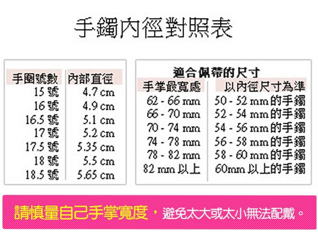 1) 選擇手鐲的尺寸時是需看手鐲的內圈直徑而定的。各位可以按圖中的方式,將姆指和尾指儘量緊緊靠近,請朋友幫忙用軟尺量出mm長度,除以3.14,即是適合你的手鐲內圈直徑。喜歡略鬆或略緊的朋友,可以前後加減10~20mm,不宜過鬆或過緊。