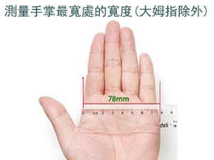 使用直尺(軟尺)量手掌寬處(大拇指除外)的寬度,測量出的尺碼按照以下相應資料,選擇合適內徑尺寸的手鐲。