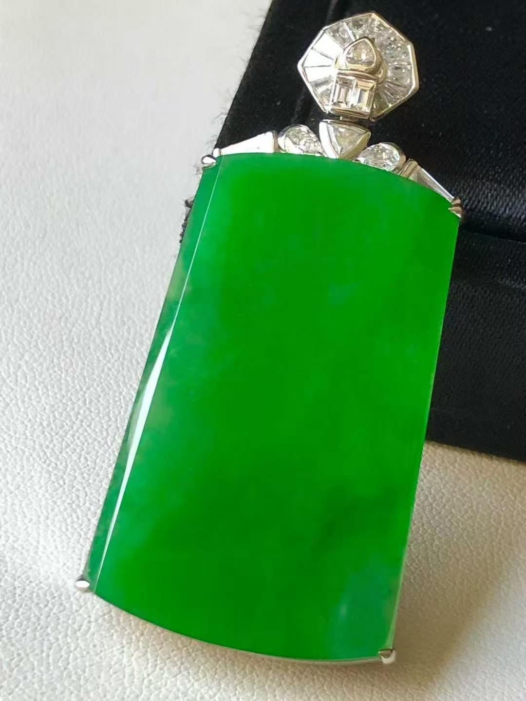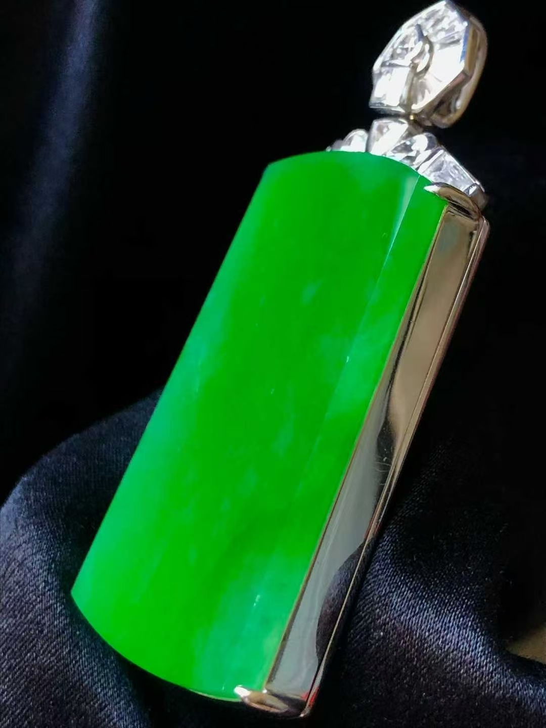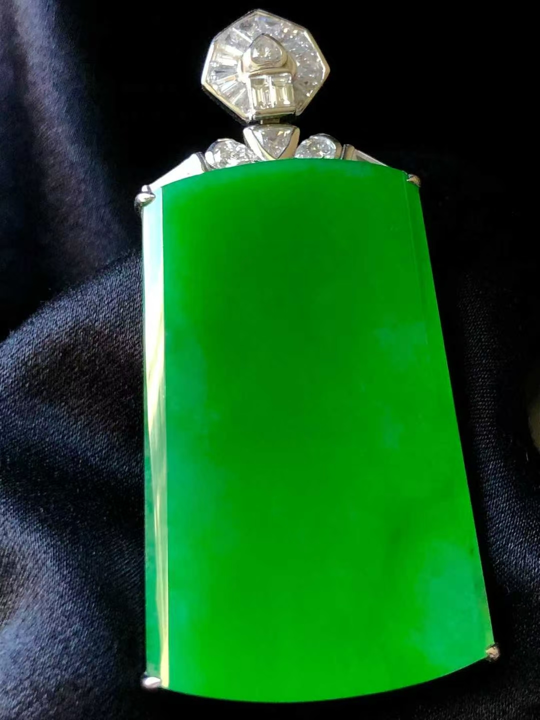 天然翡翠A玉,種老細膩,色陽濃郁起膠,18K金配鑽鑲嵌。