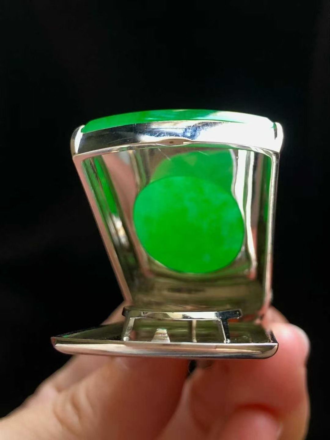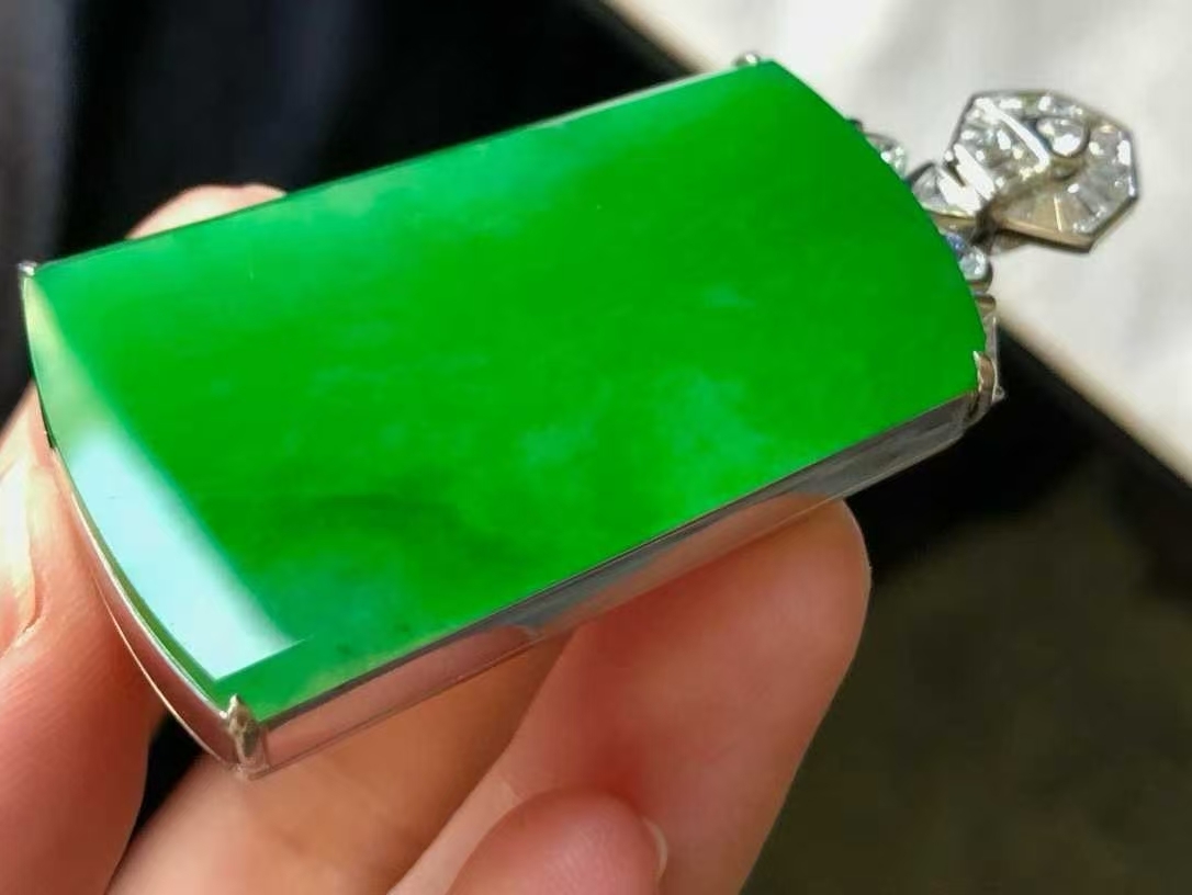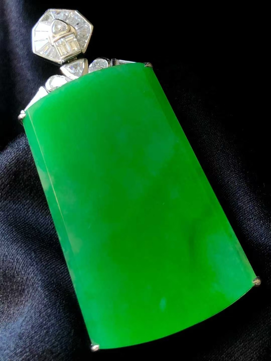 天然翡翠A玉,種老細膩,色陽濃郁起膠,18K金配鑽鑲嵌。