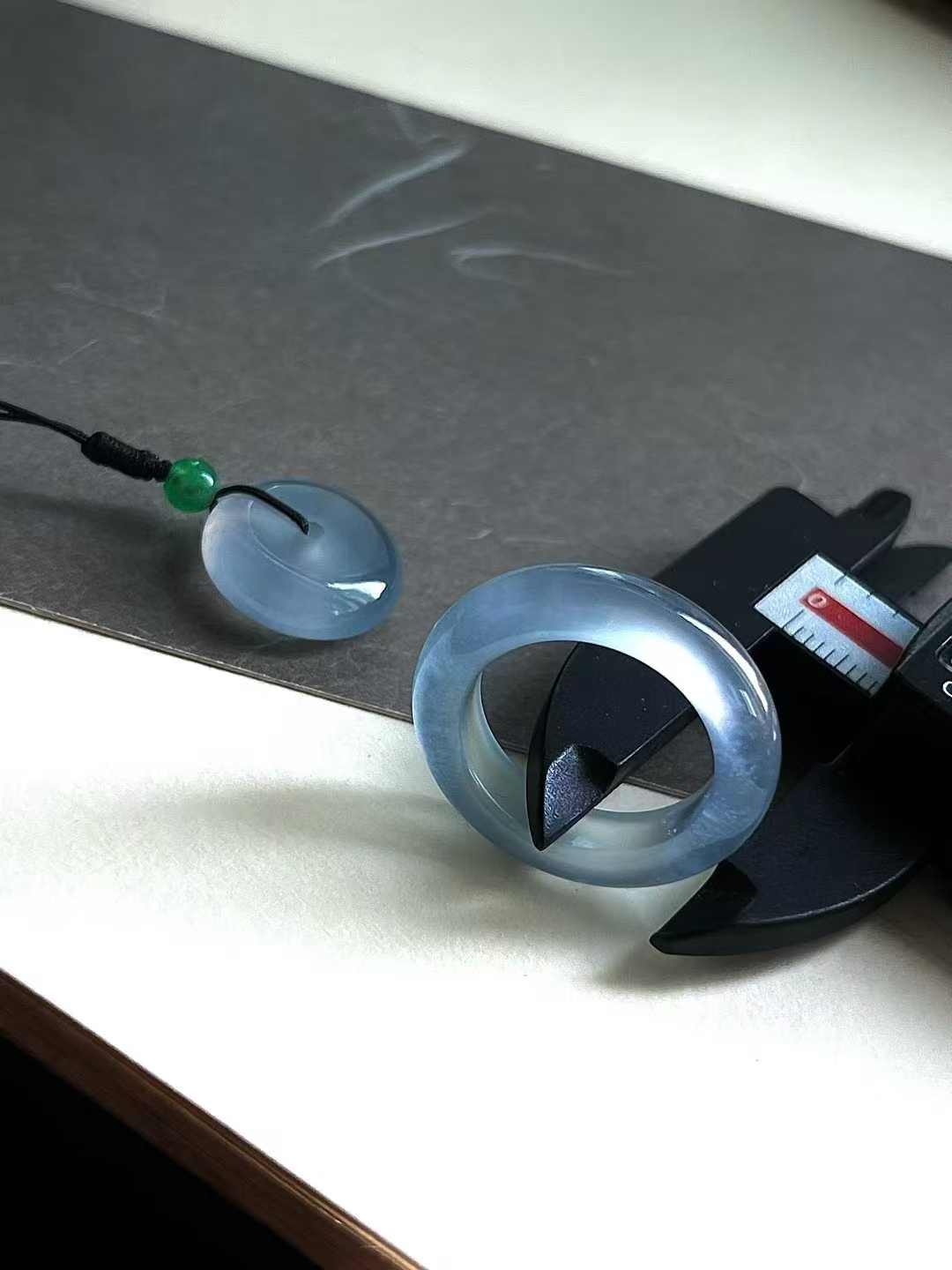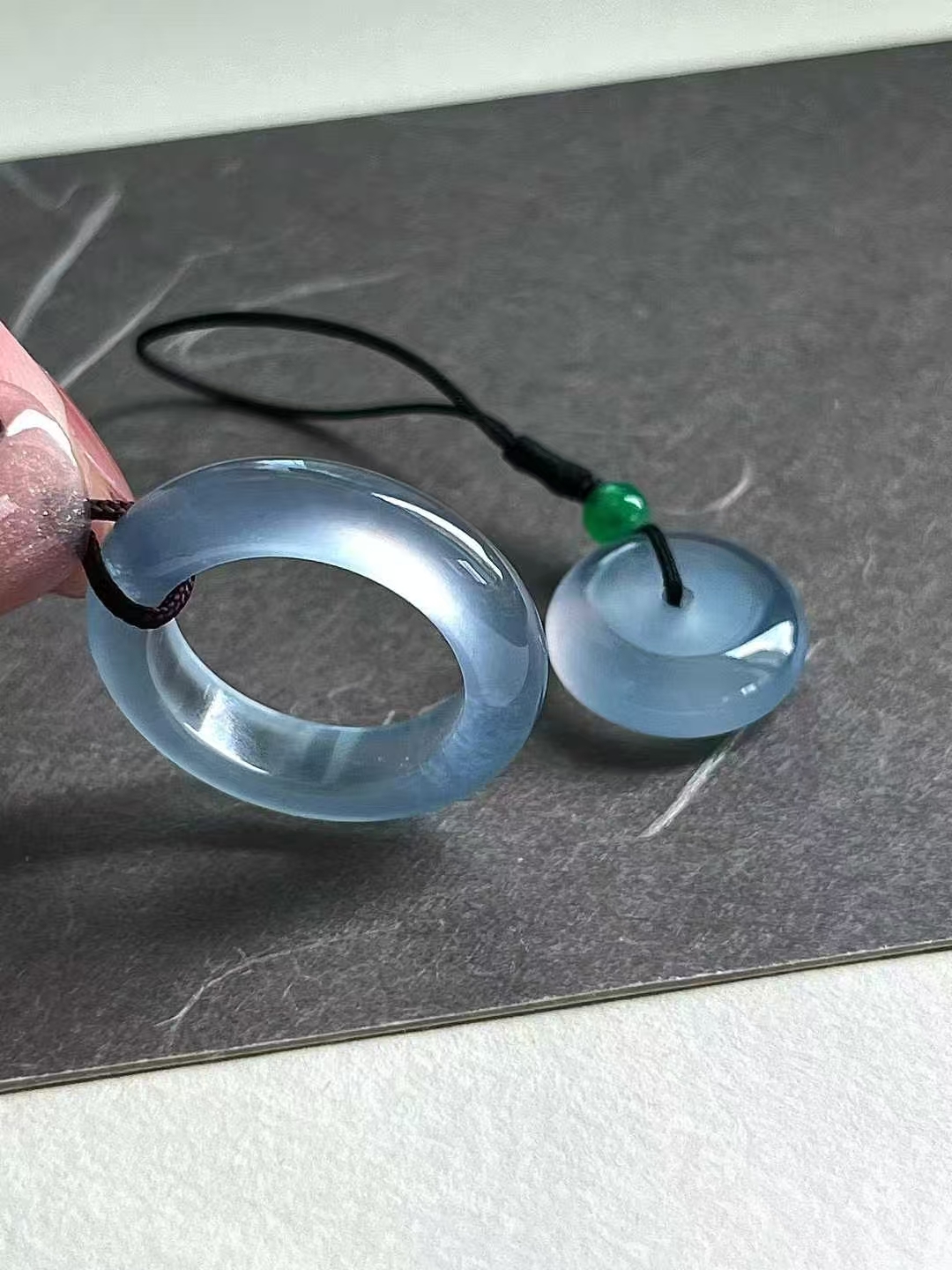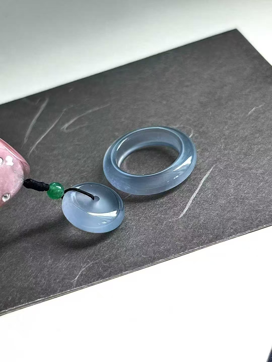 天然翡翠A玉,冰潤水透,種老細膩起熒,可當做母子平安扣,或戒圈+平安扣。