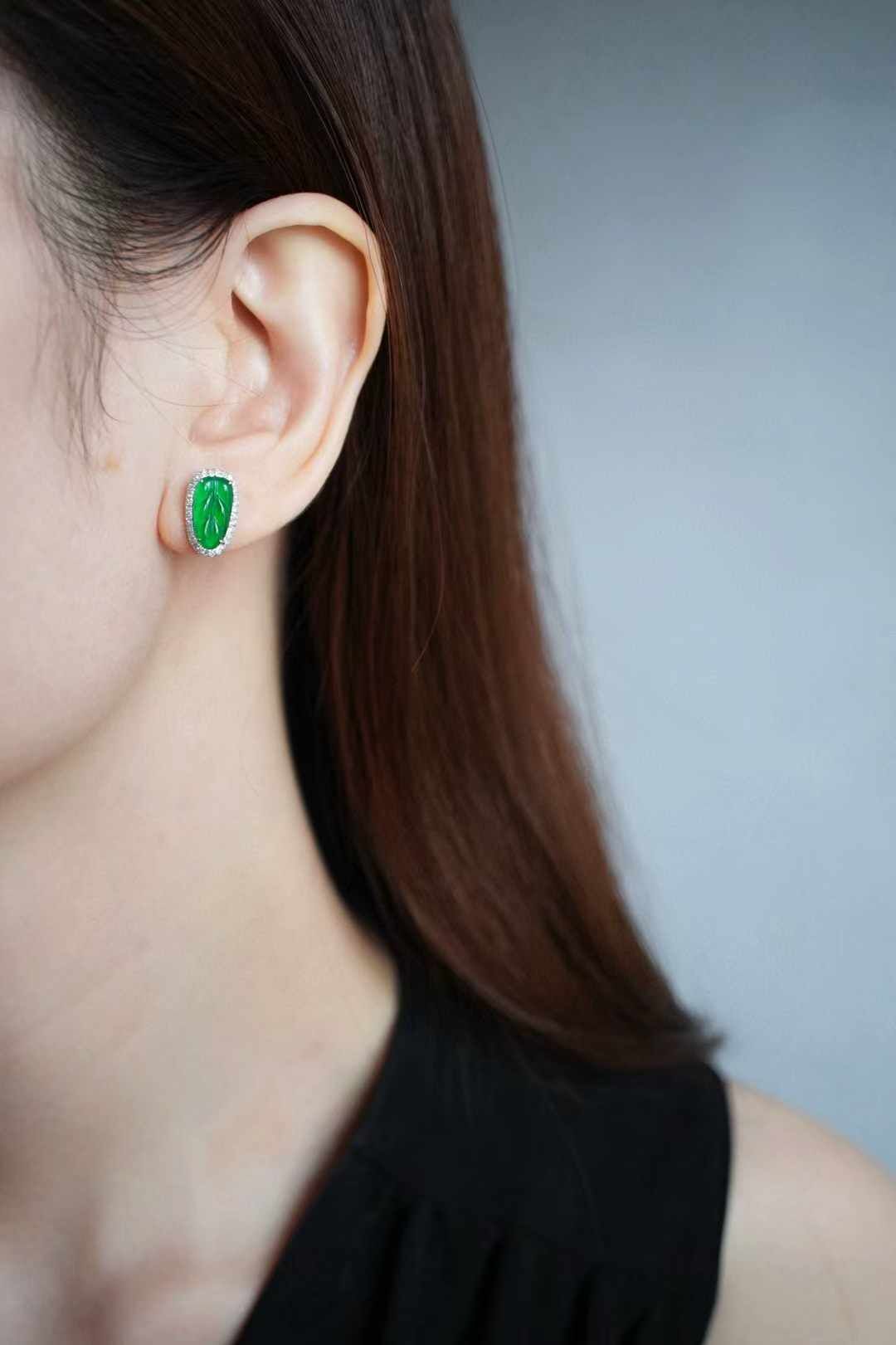 • 翡翠冰陽綠葉子耳釘,天然翡翠A玉, 緬甸玉, Jade, Jadeite