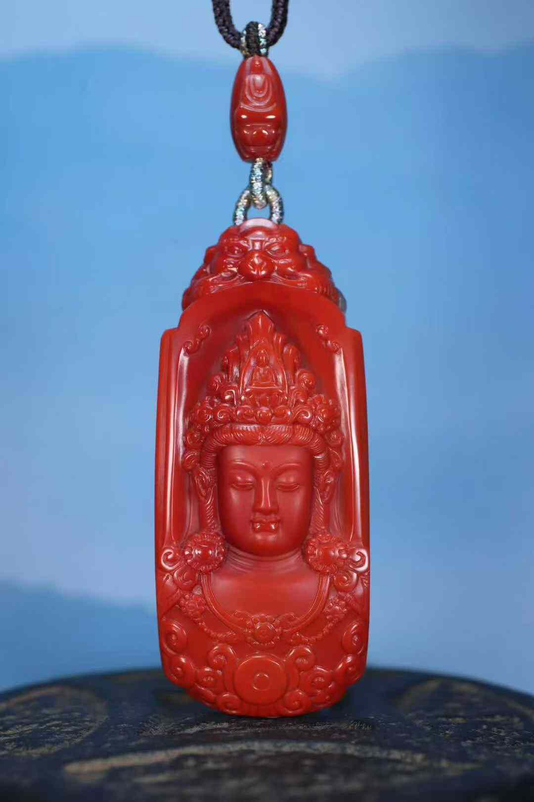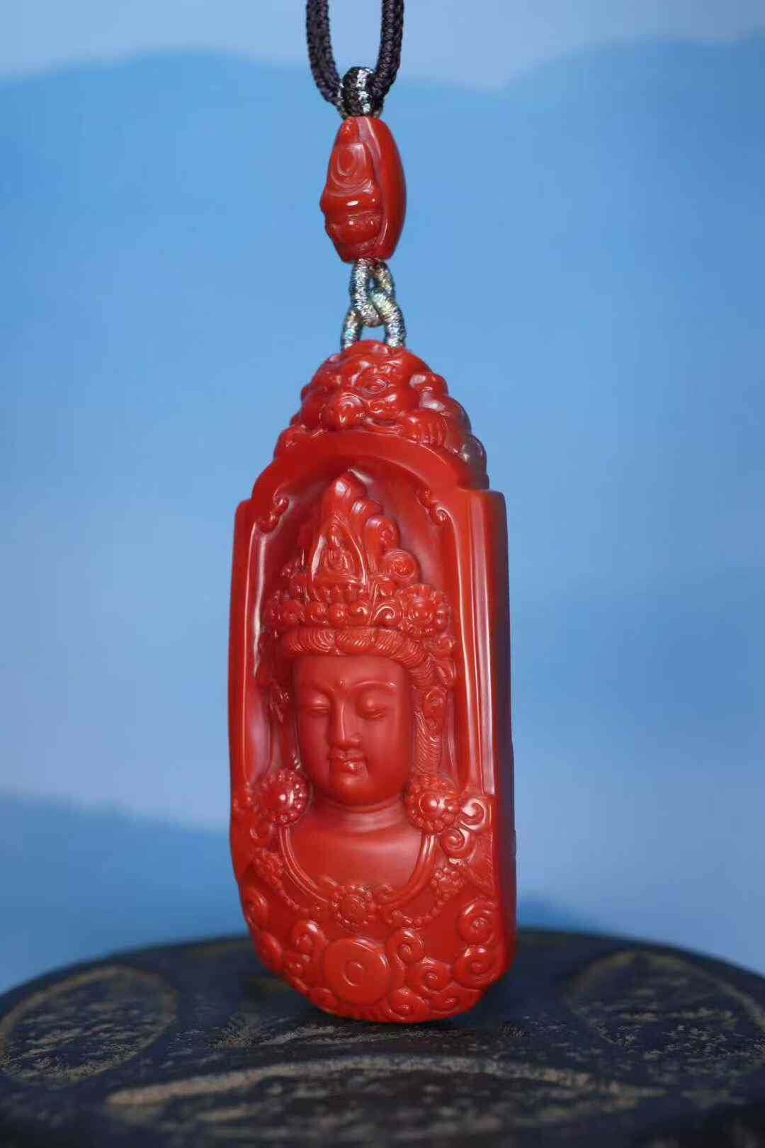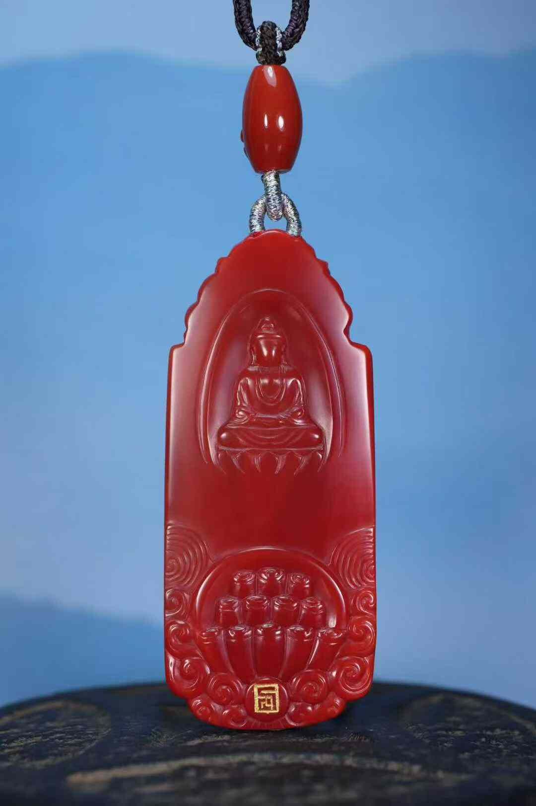 收藏級天然南紅瑪瑙,雙色系代表作品:柿子紅+玫瑰紅,此類雙色系列顏色紅,肉質細膩溫潤,雙面純色,前純色柿子紅做觀音菩薩,後純色玫瑰紅做無相佛,全品簡單、大氣。