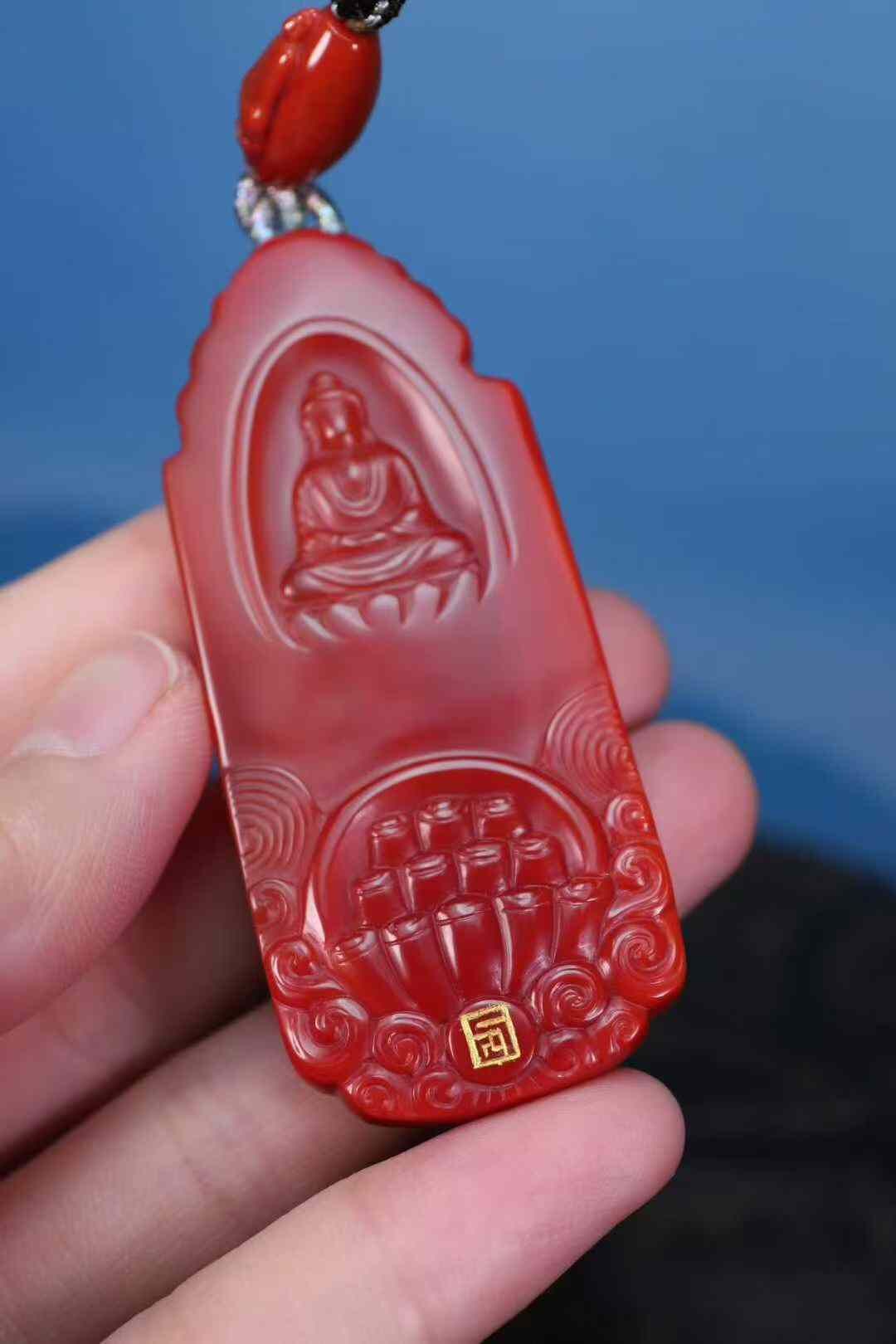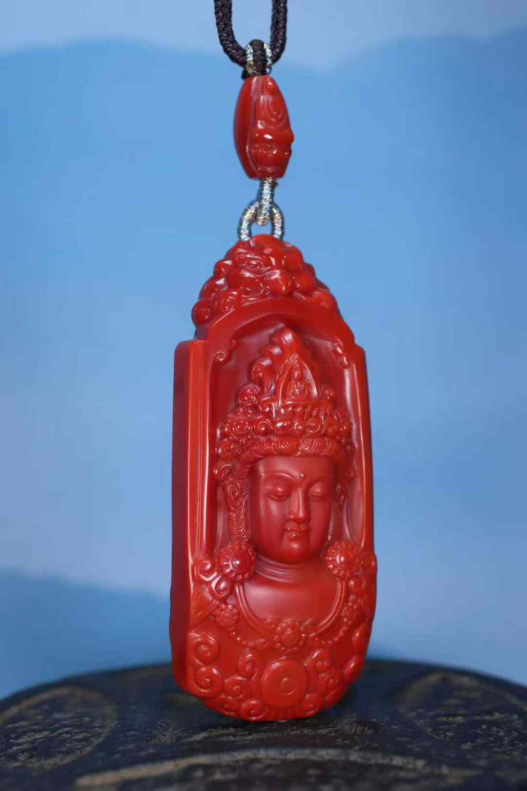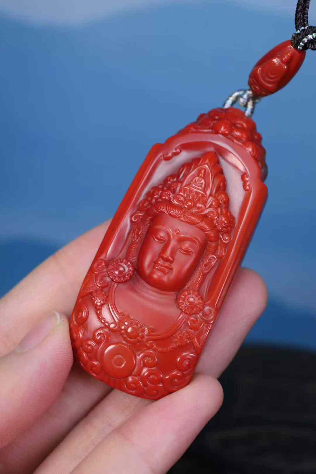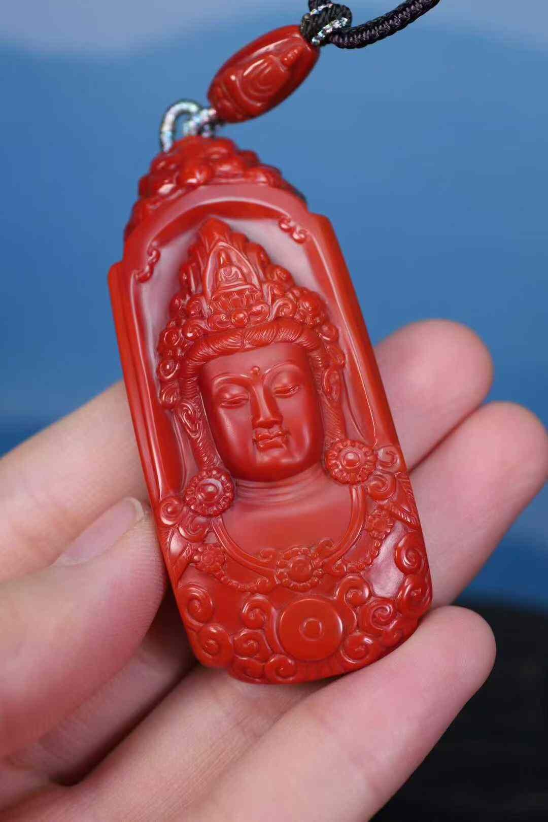 收藏級天然南紅瑪瑙,雙色系代表作品:柿子紅+玫瑰紅,此類雙色系列顏色紅,肉質細膩溫潤,雙面純色,前純色柿子紅做觀音菩薩,後純色玫瑰紅做無相佛,全品簡單、大氣。