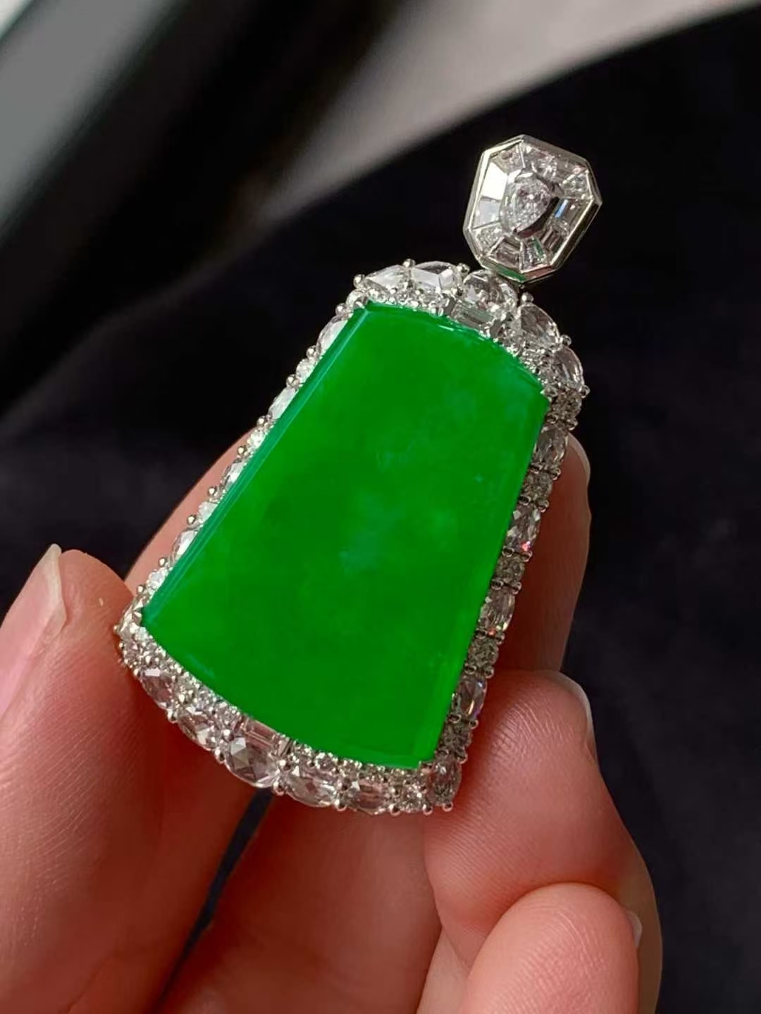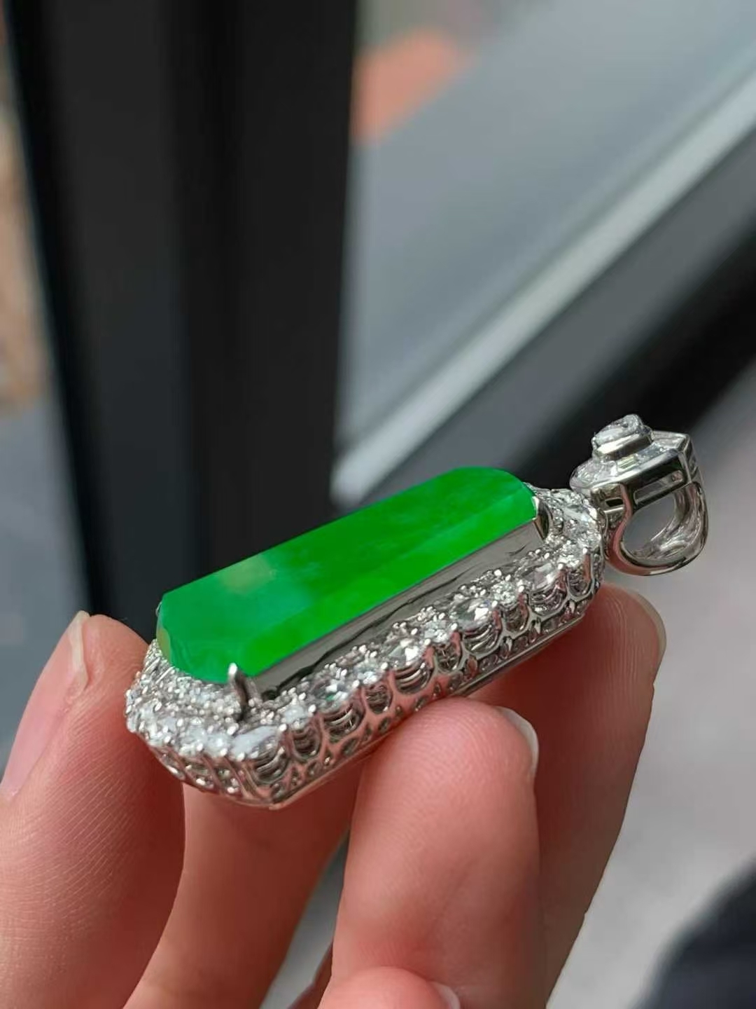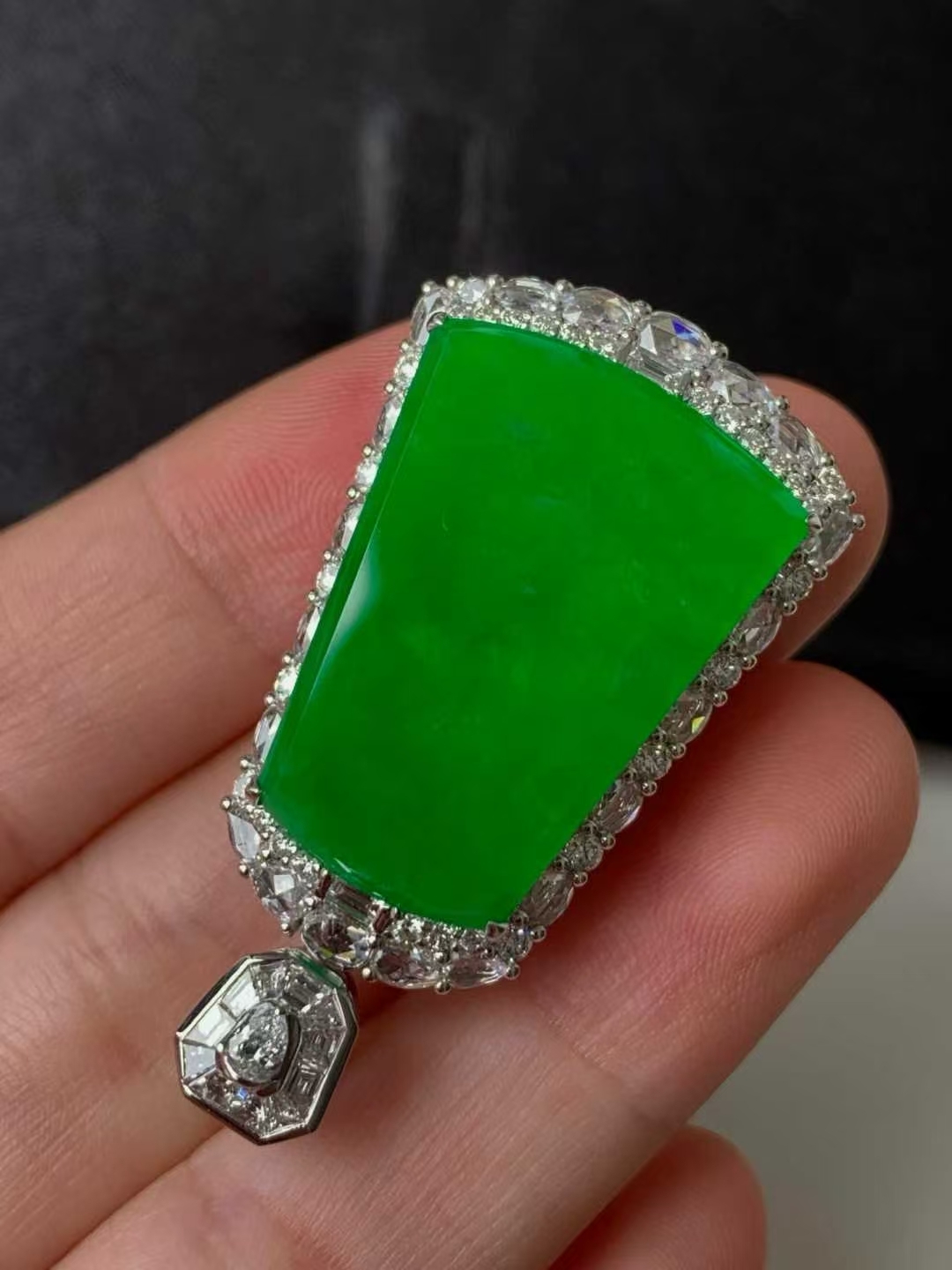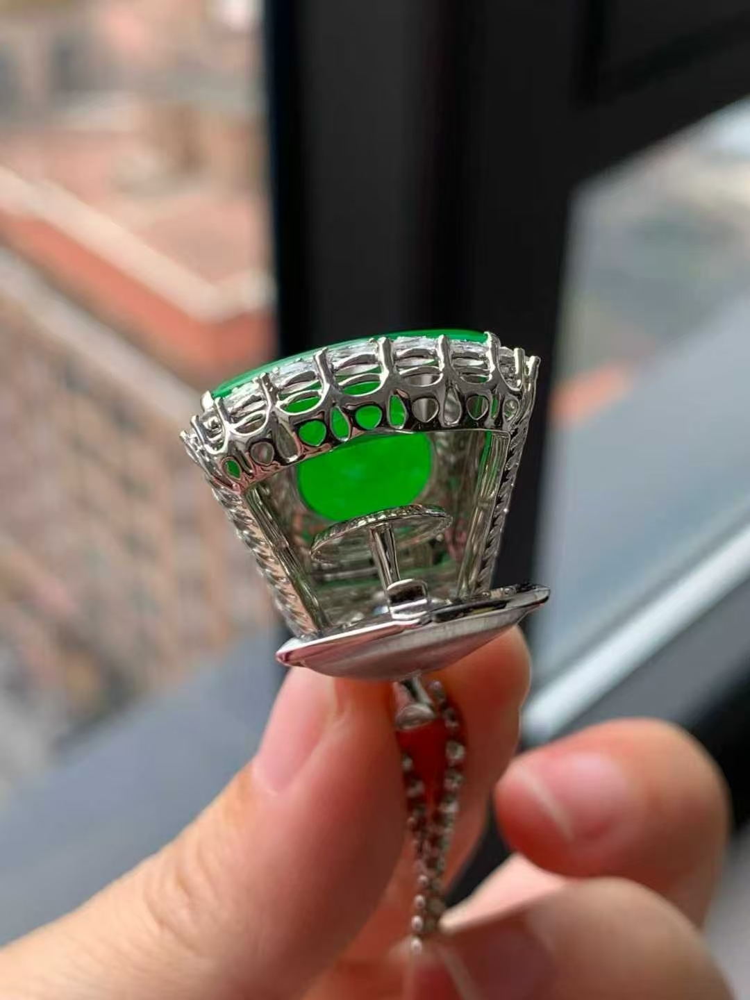 天然翡翠A玉,種老細膩,色陽濃郁起膠,18K金鑲嵌。