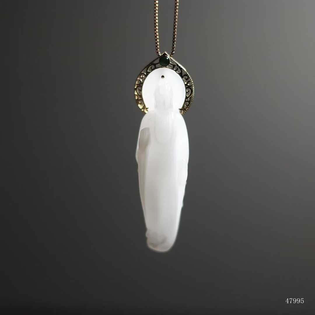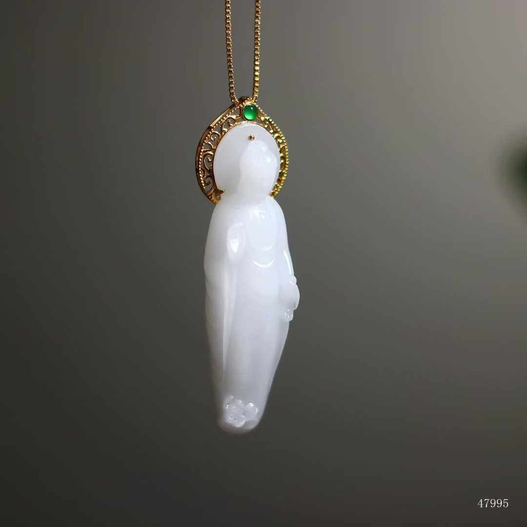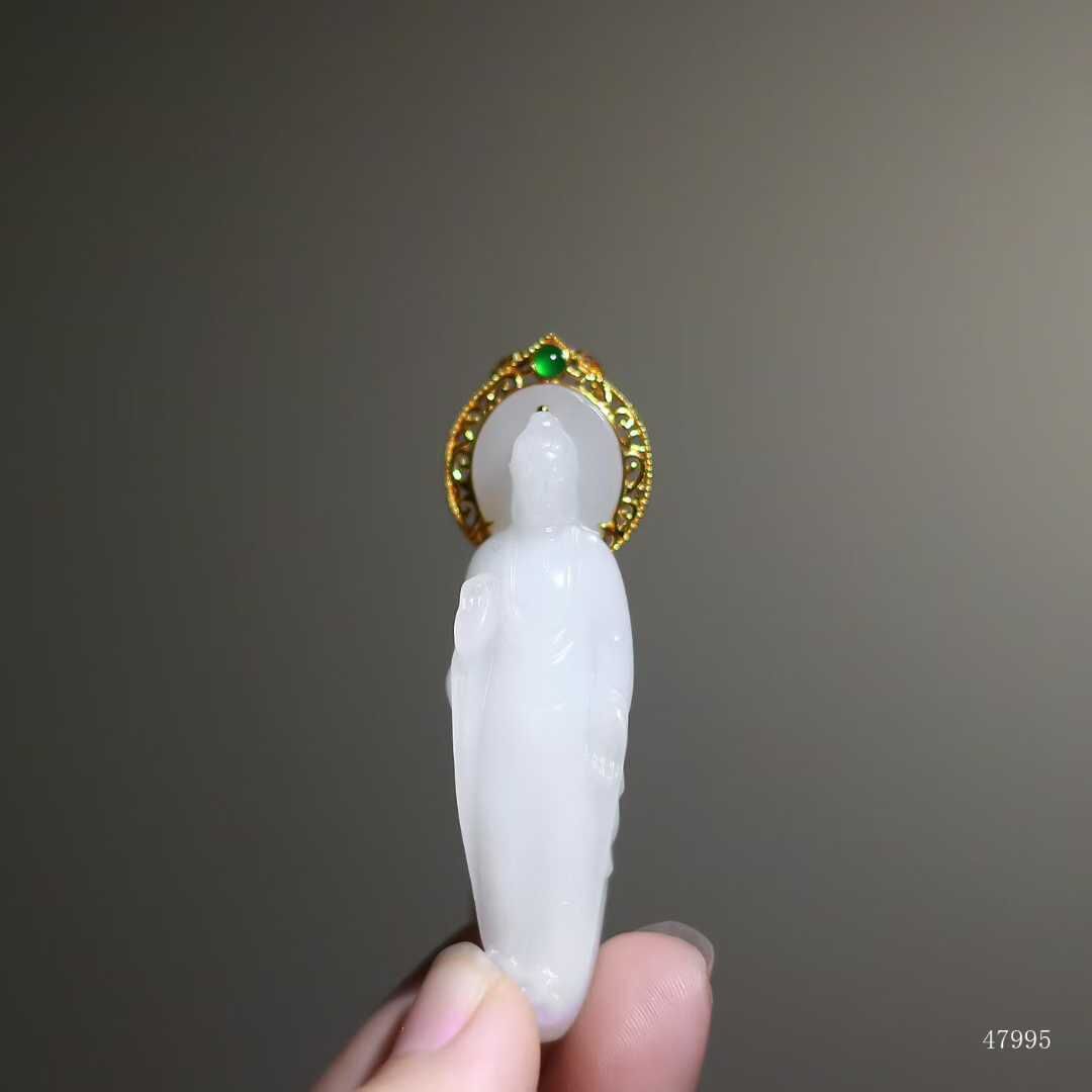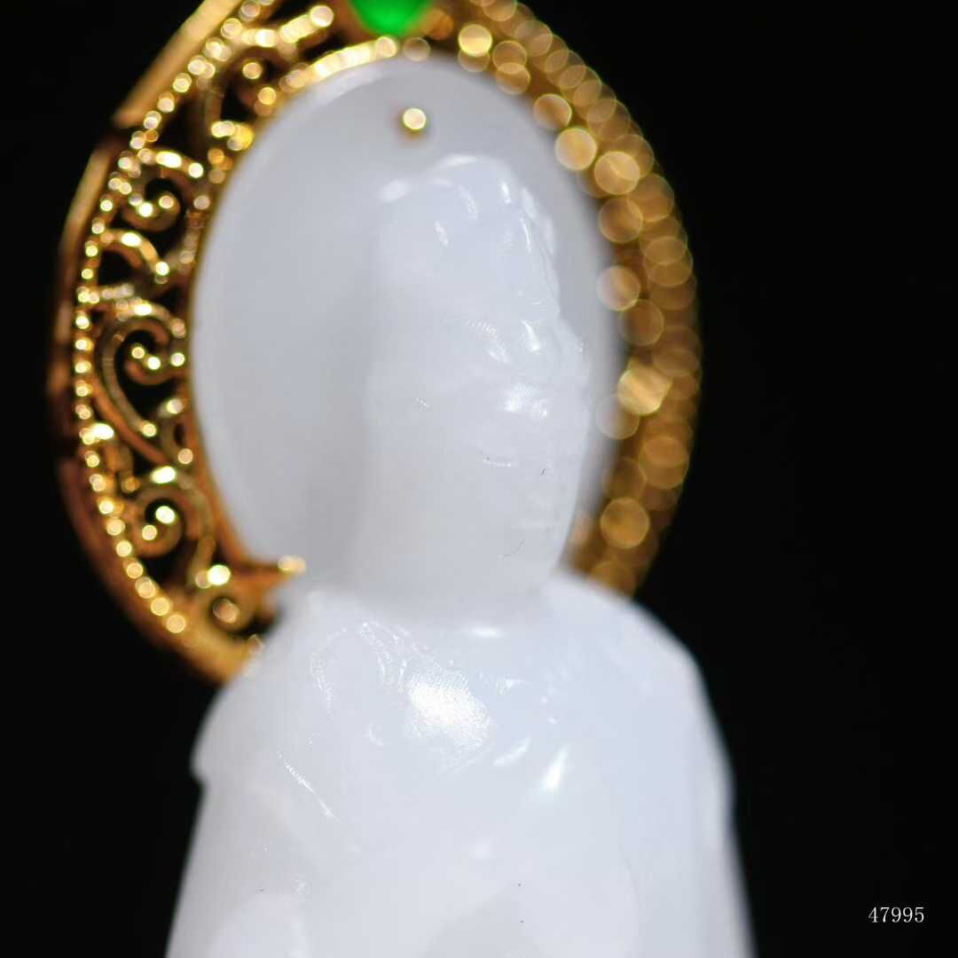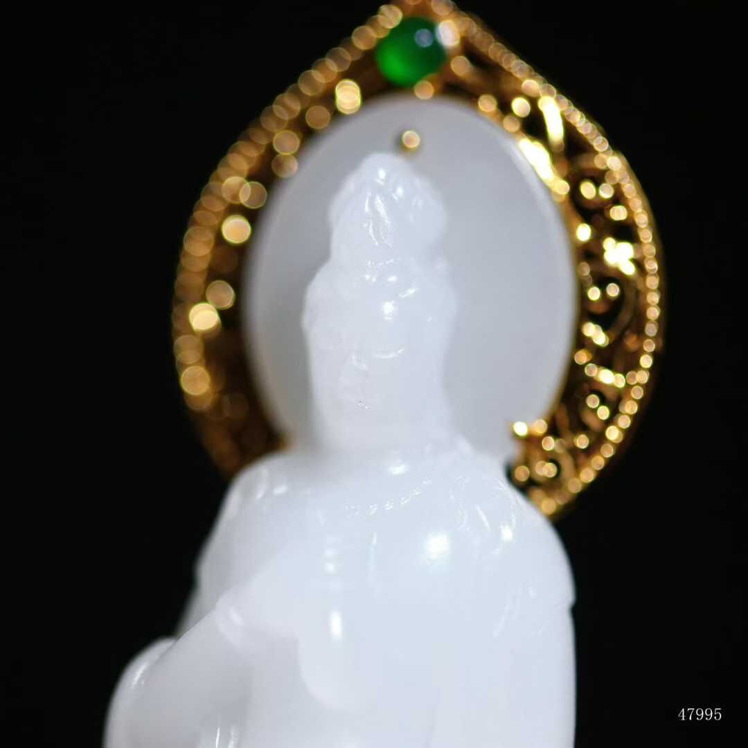 和田玉羊脂白玉立雕觀音,玉色皎皎透熟糯脂光,通體素潔不琢繁紋。鑲佛光層疊如旭日初昇,陽綠翡翠點綴恰似金輪託碧珠。