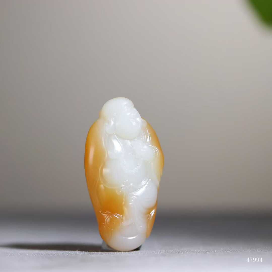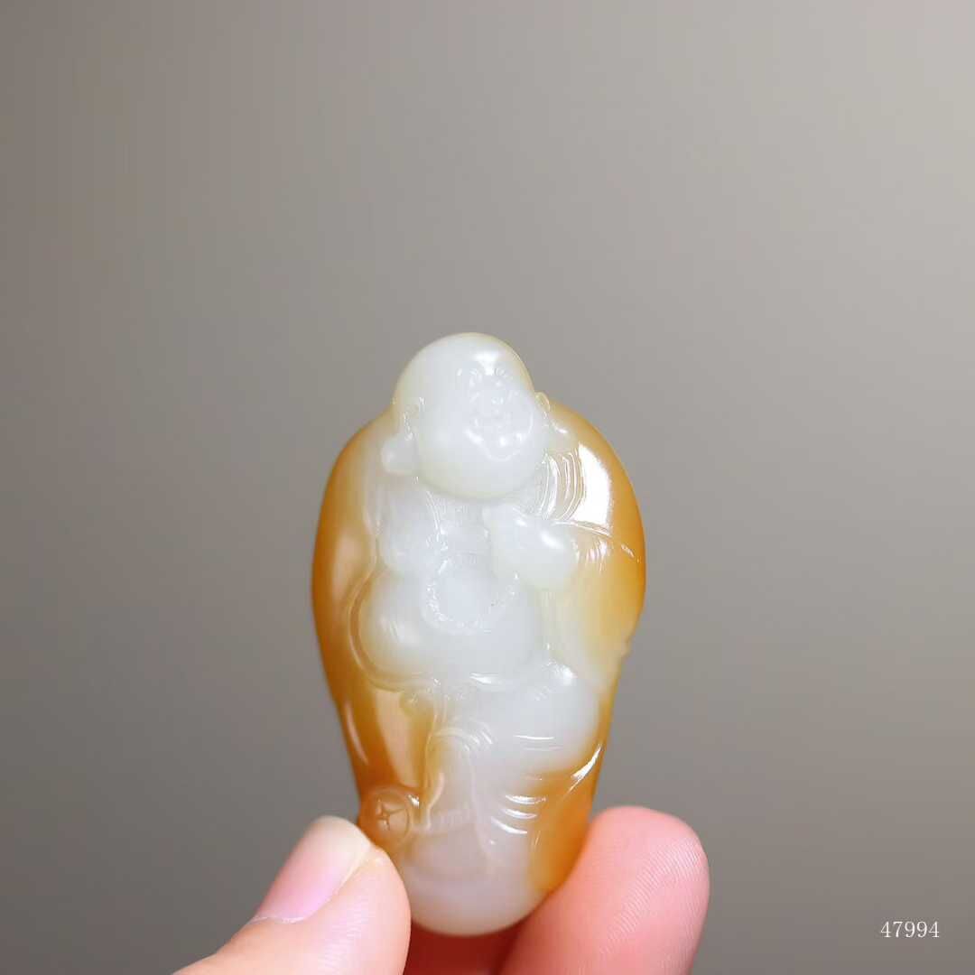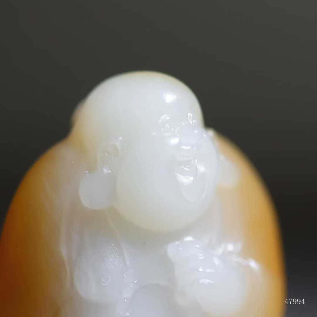 彌勒笑紋在糖白過渡處自然生輝,玉質油潤如浸透酥油,雙色交融處似蜜入酪漿,油潤玉質令衣紋褶皺漫溢暖意,福相在糖玉共舞中愈顯豐盈,方寸間盡顯大地恩賜的甜蜜福蘊。