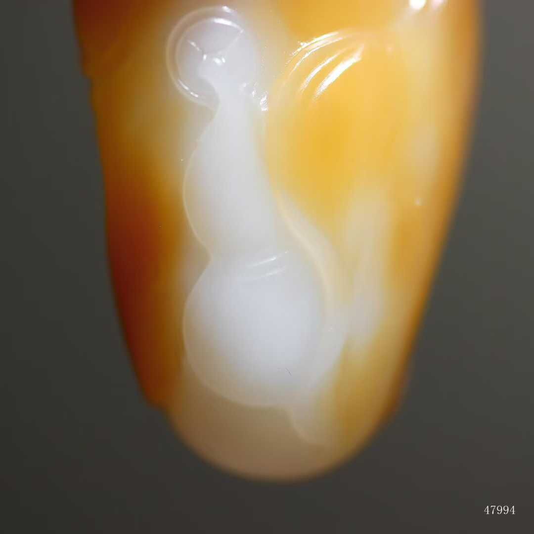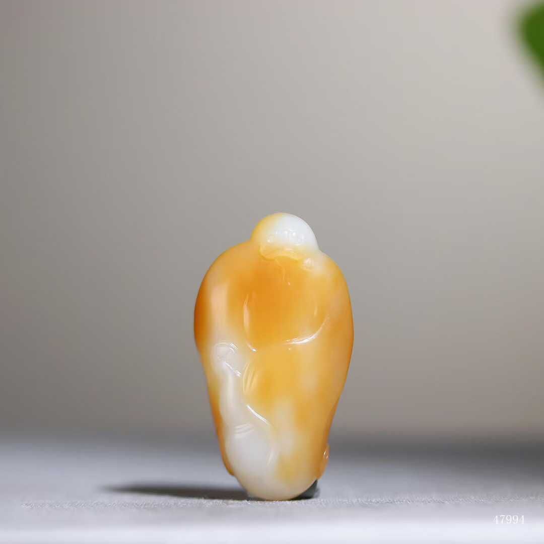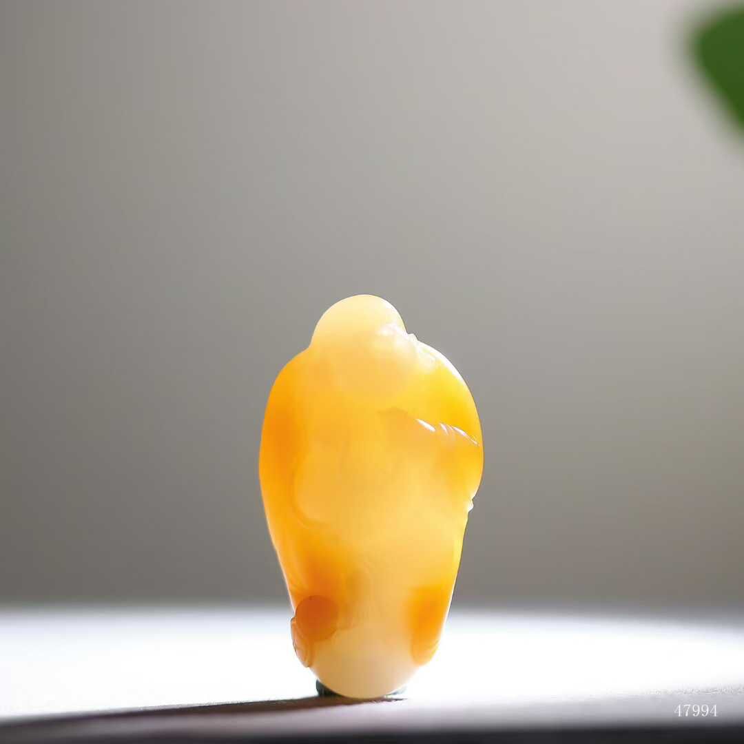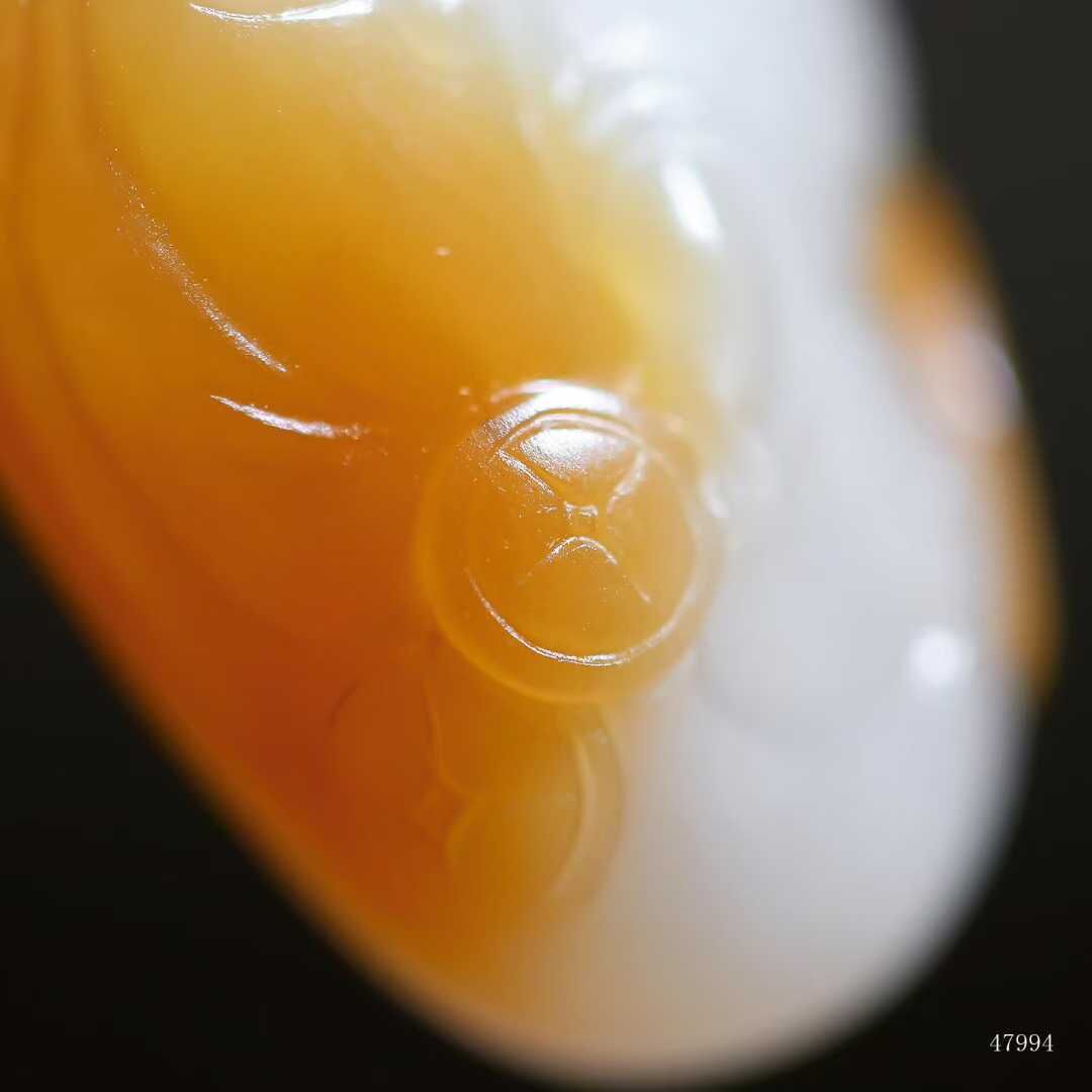 彌勒笑紋在糖白過渡處自然生輝,玉質油潤如浸透酥油,雙色交融處似蜜入酪漿,油潤玉質令衣紋褶皺漫溢暖意,福相在糖玉共舞中愈顯豐盈,方寸間盡顯大地恩賜的甜蜜福蘊。