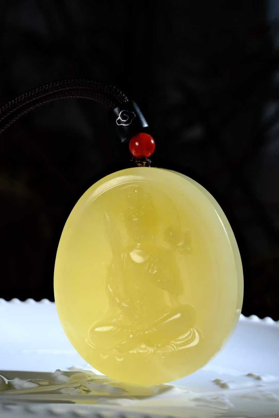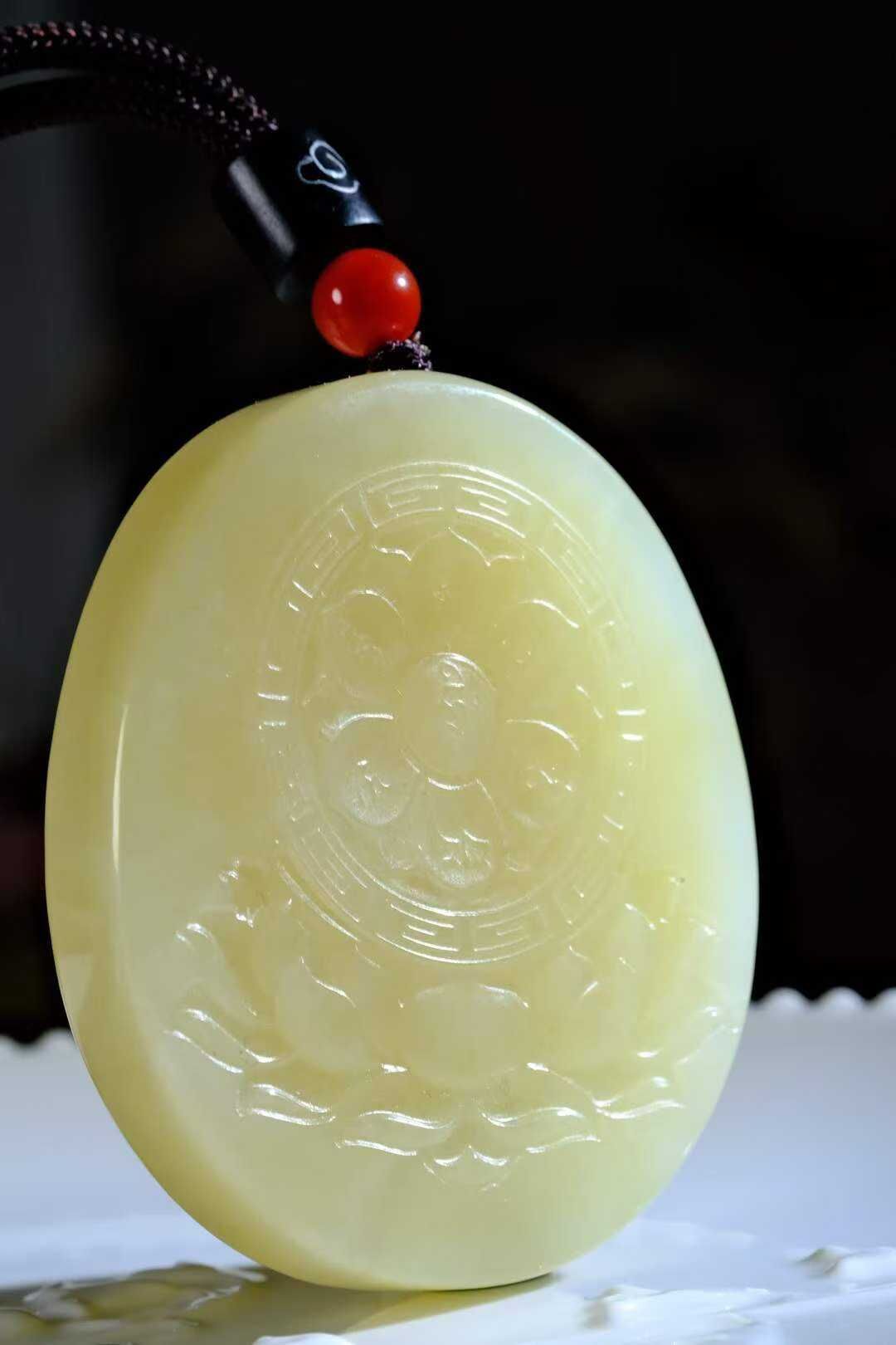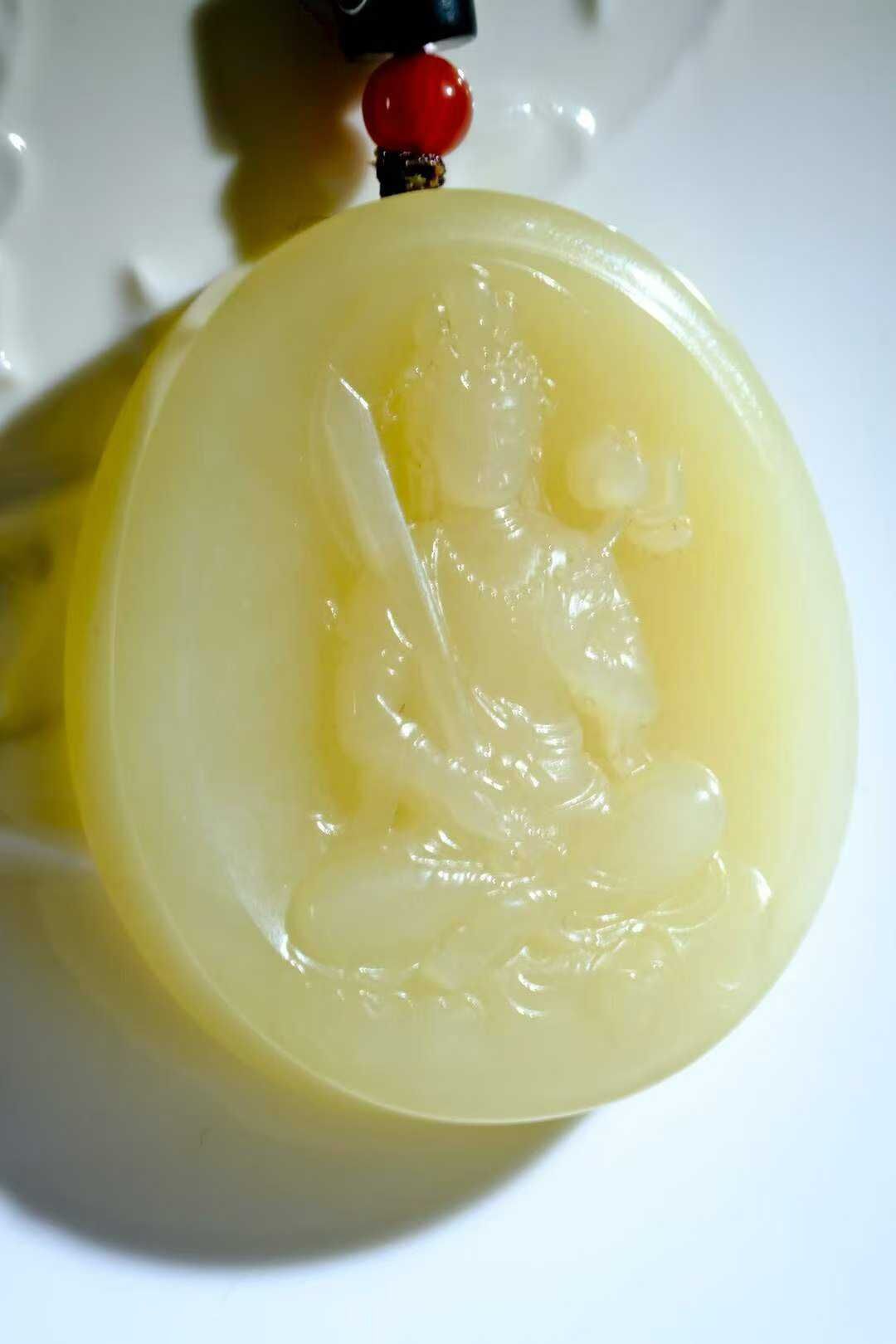 和田玉老坑細料黃口,玉質油潤豐盈,玉面精雕觀音手持寶劍與蓮花法器,神態端莊,此件寓意觀音送福、無災無禍、吉祥護身。