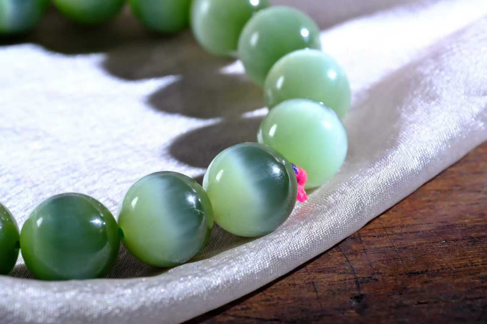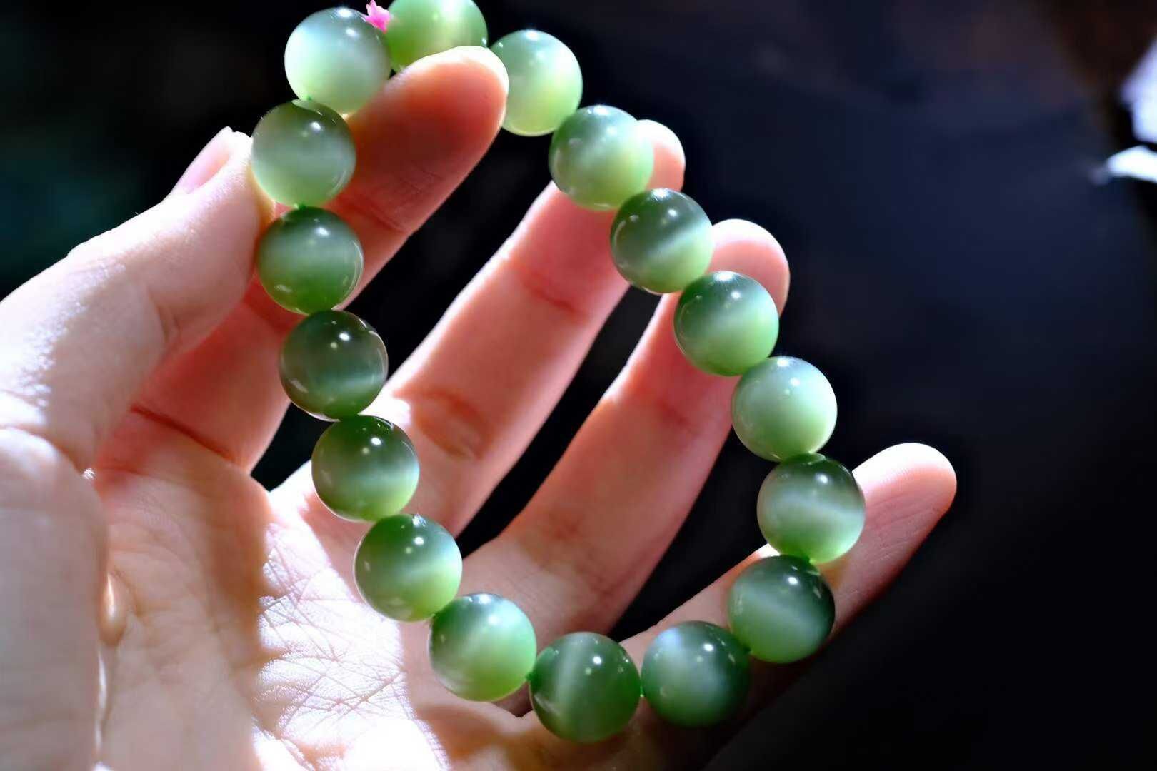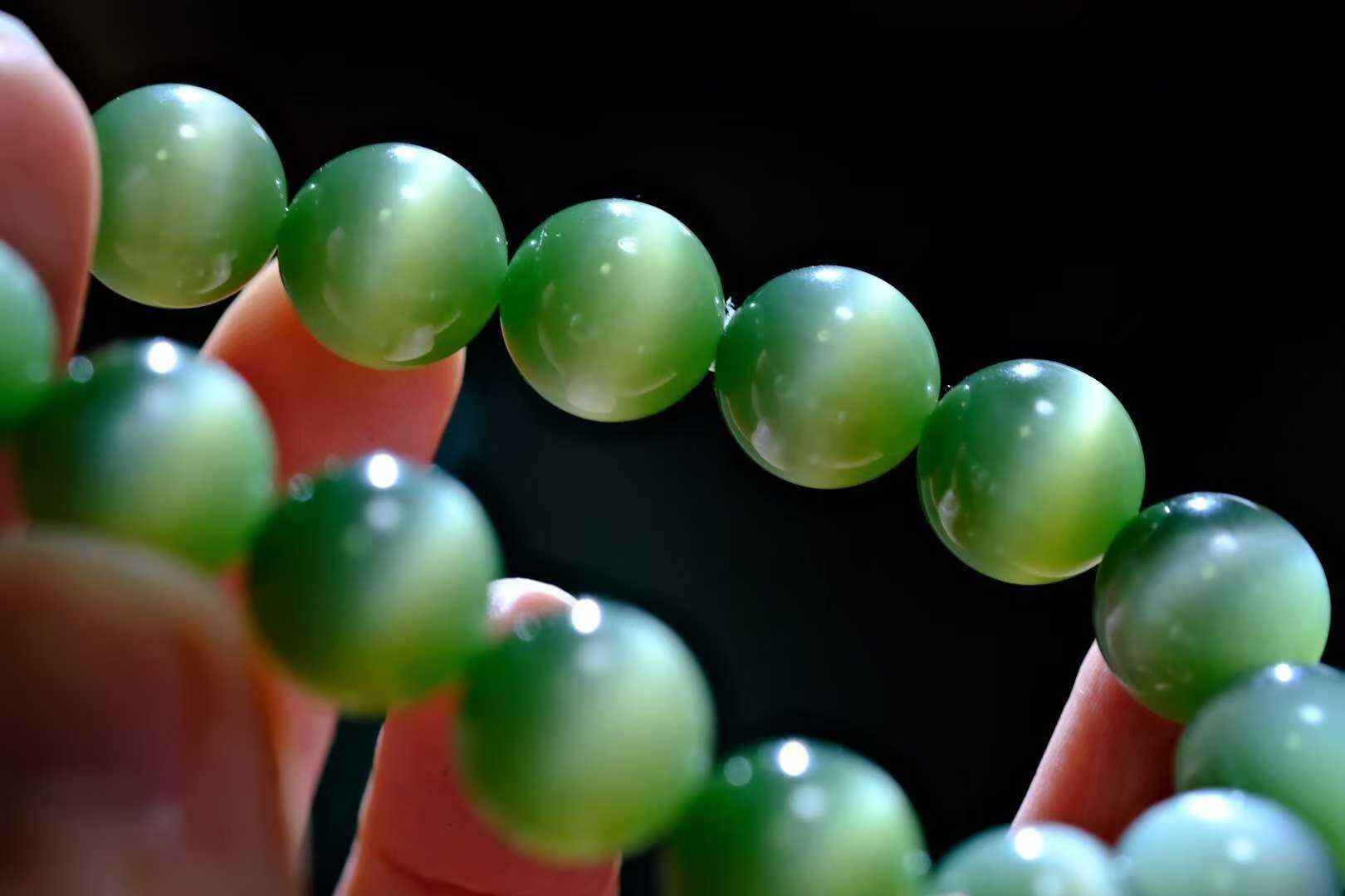 和田玉碧玉,強貓眼!碧影流光,極品一線貓眼,顆顆活眼在自然光下,光帶聚光!如同星河清晰明亮,流轉靈動,美不勝收,無論收藏還是佩戴,都具有極高的價值,和田玉中的珍品!