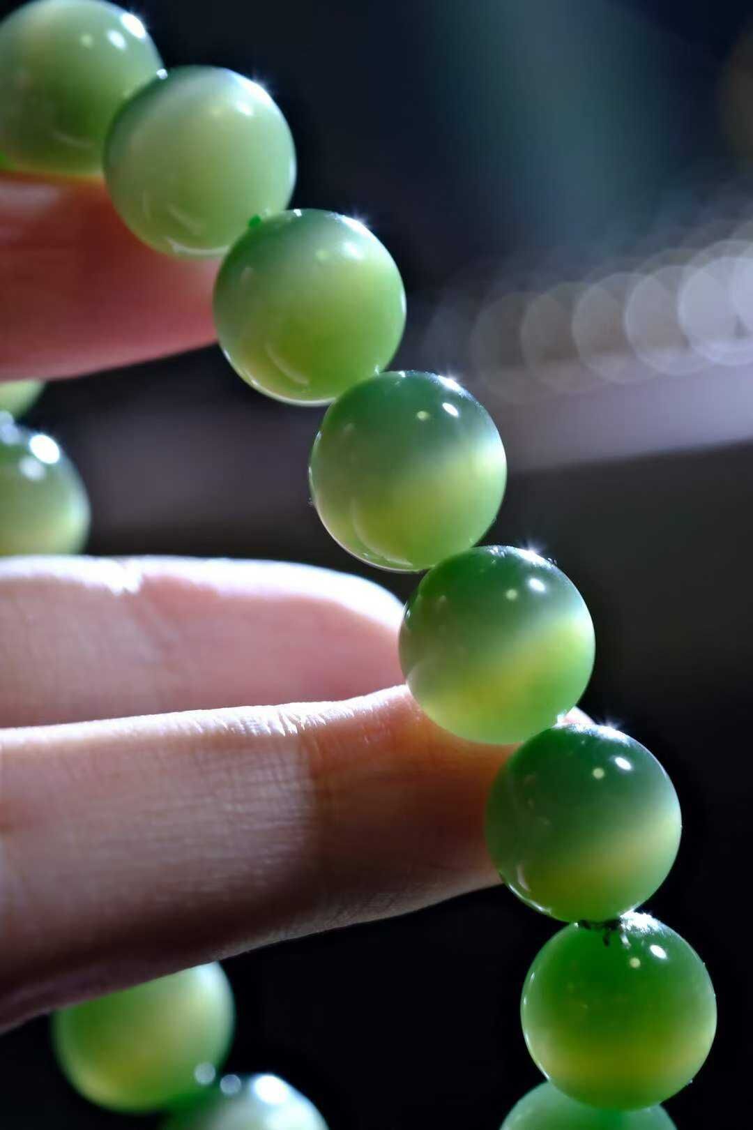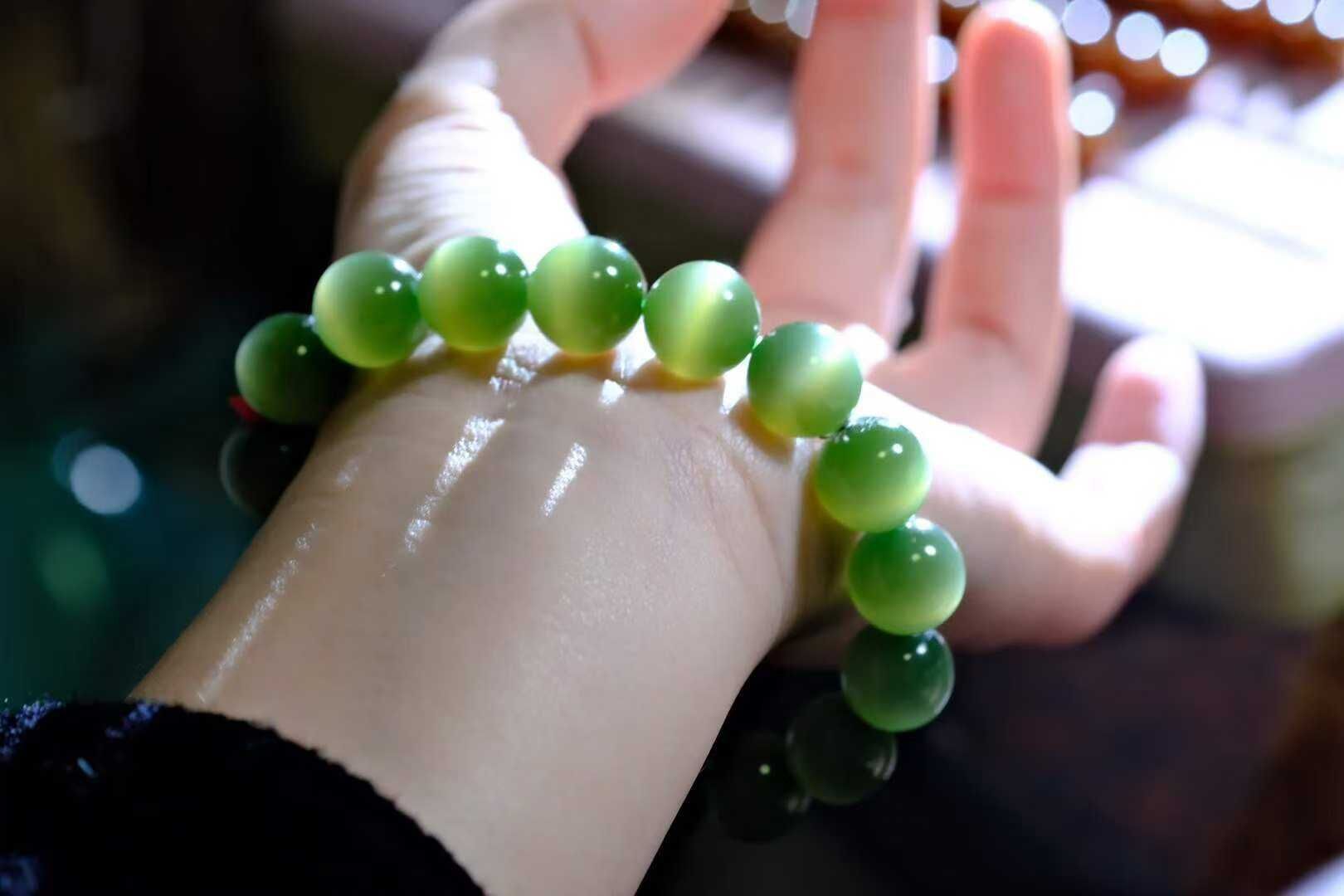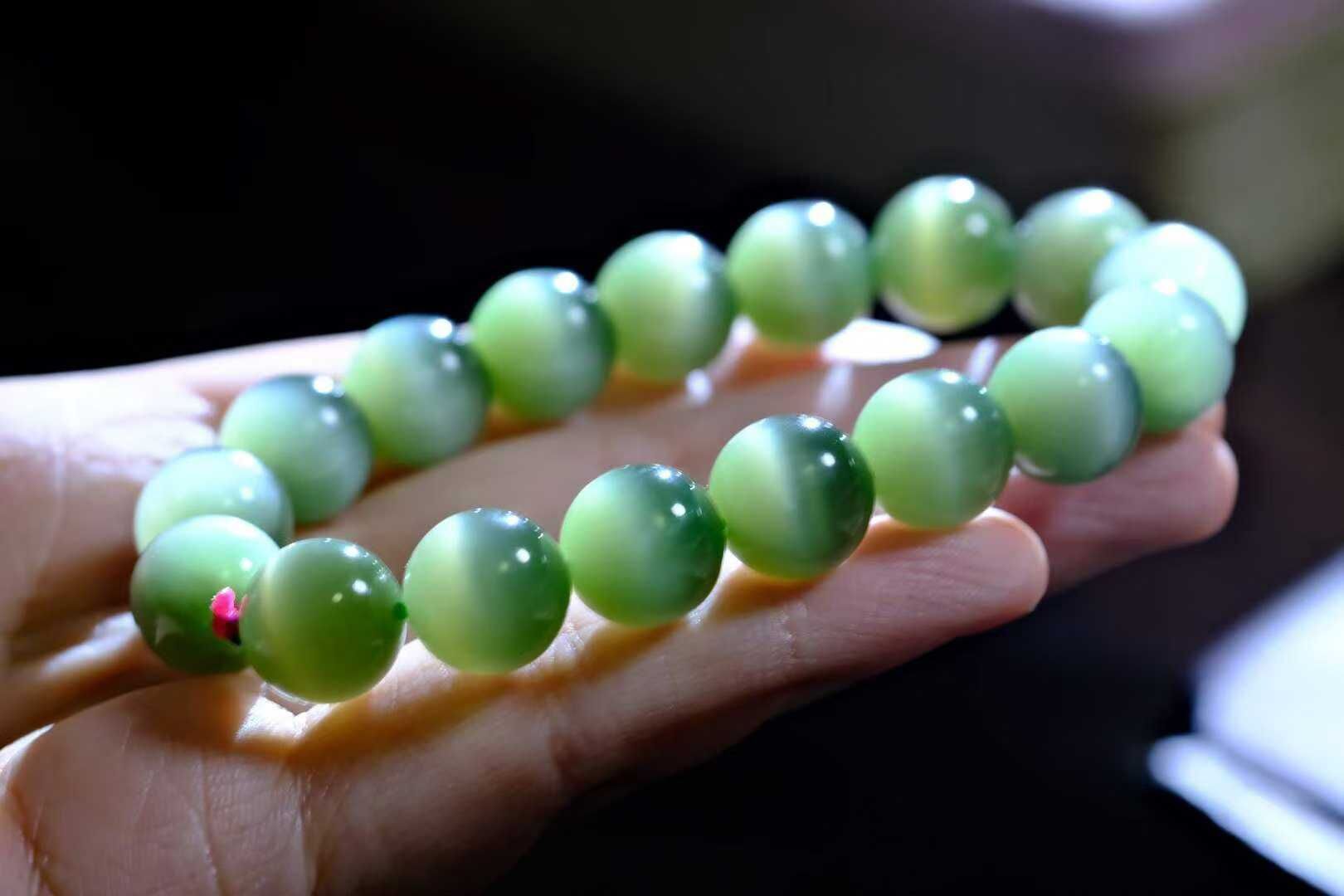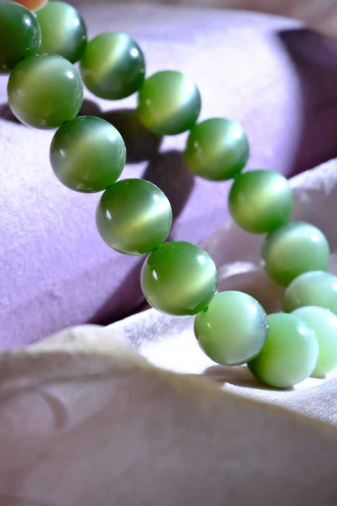 和田玉碧玉,強貓眼!碧影流光,極品一線貓眼,顆顆活眼在自然光下,光帶聚光!如同星河清晰明亮,流轉靈動,美不勝收,無論收藏還是佩戴,都具有極高的價值,和田玉中的珍品!