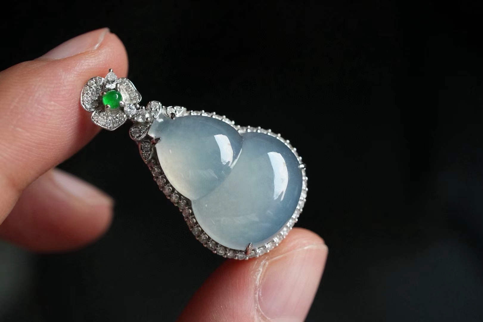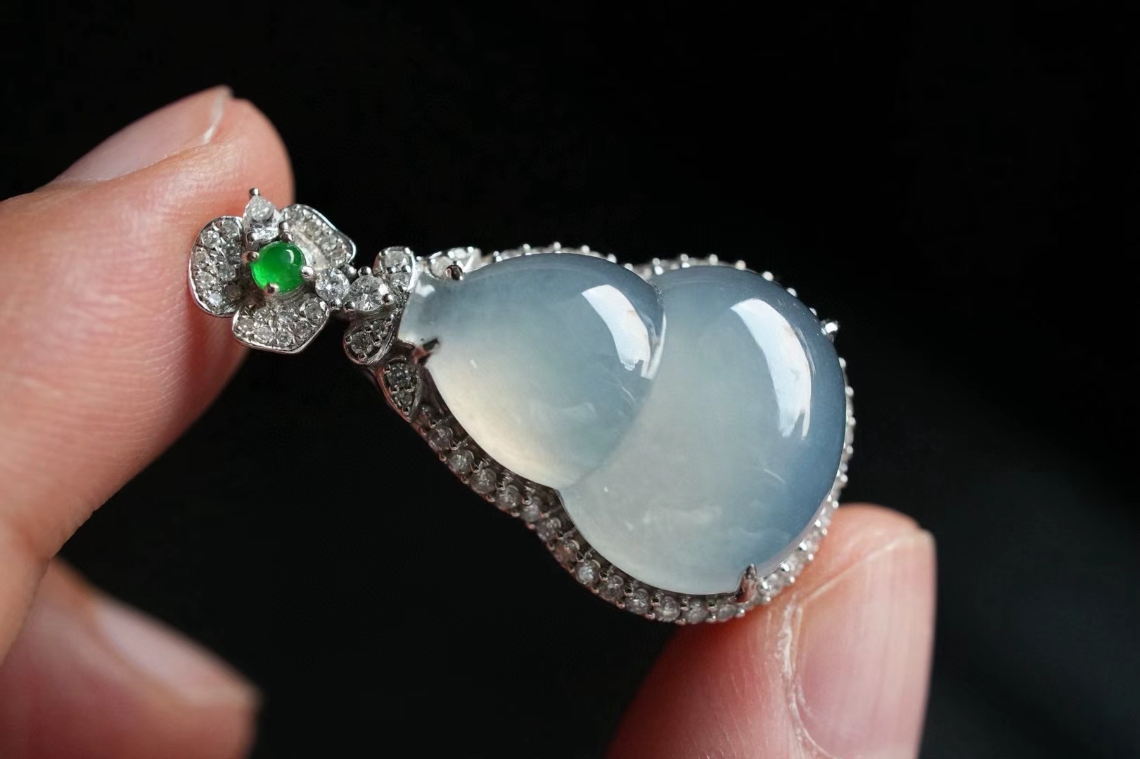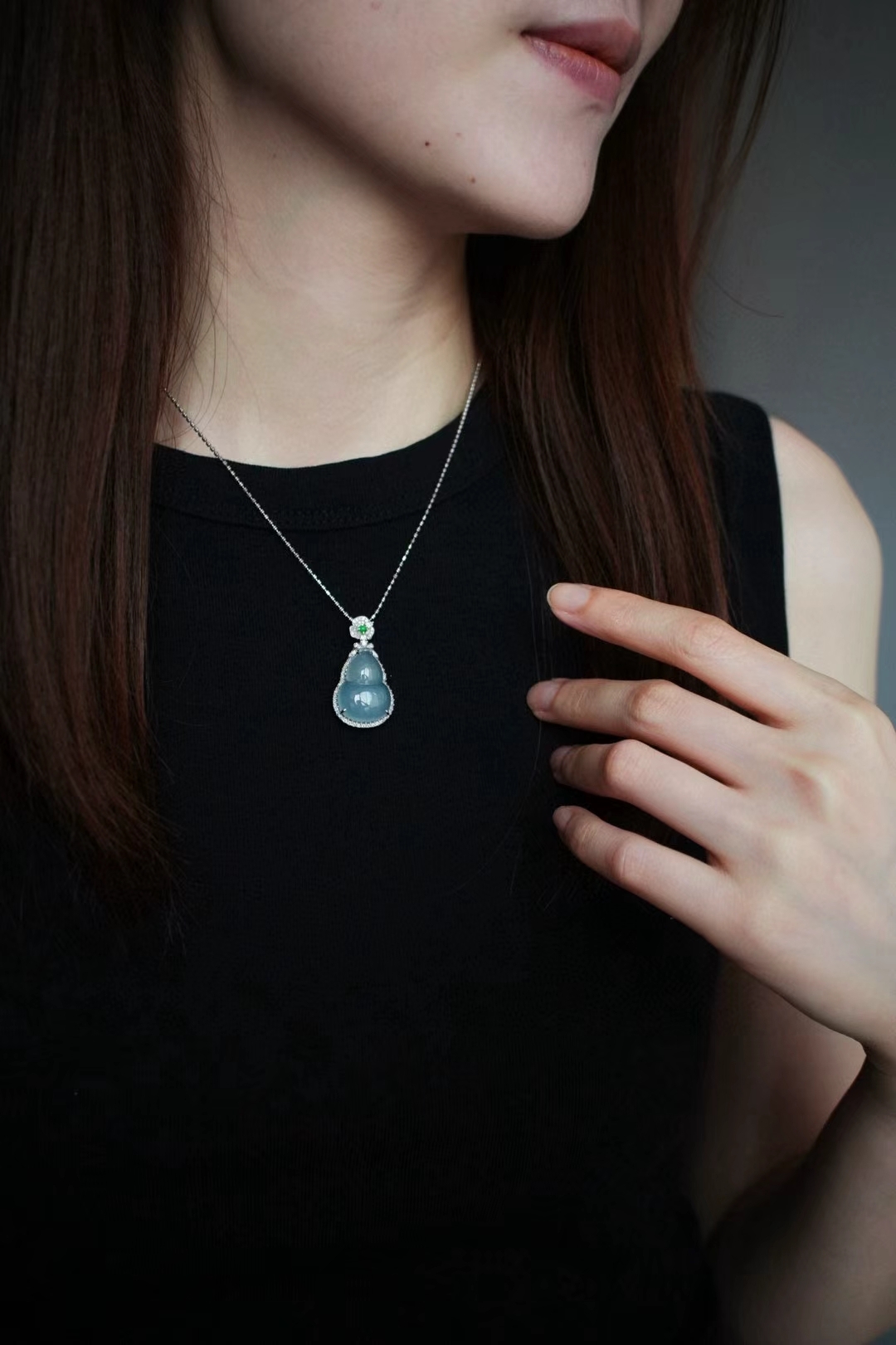 天然翡翠A玉,葫蘆完美起熒光,種水一流,底子細膩厚實,品相極佳!18K金鑽石設計,優美靈動,鑽石點綴精緻有珠寶感,佩戴精緻時尚,落落大方的氣質款。