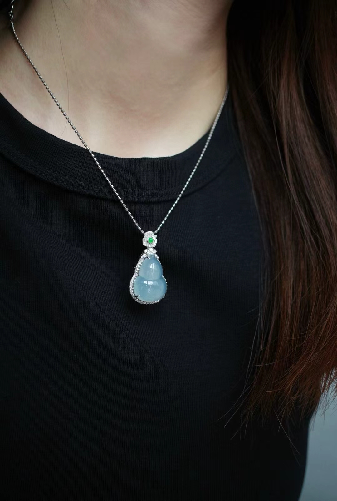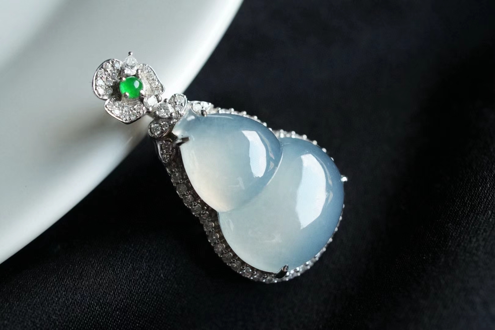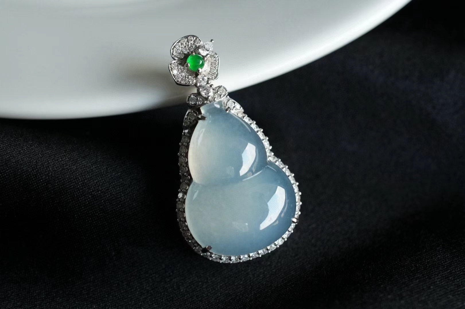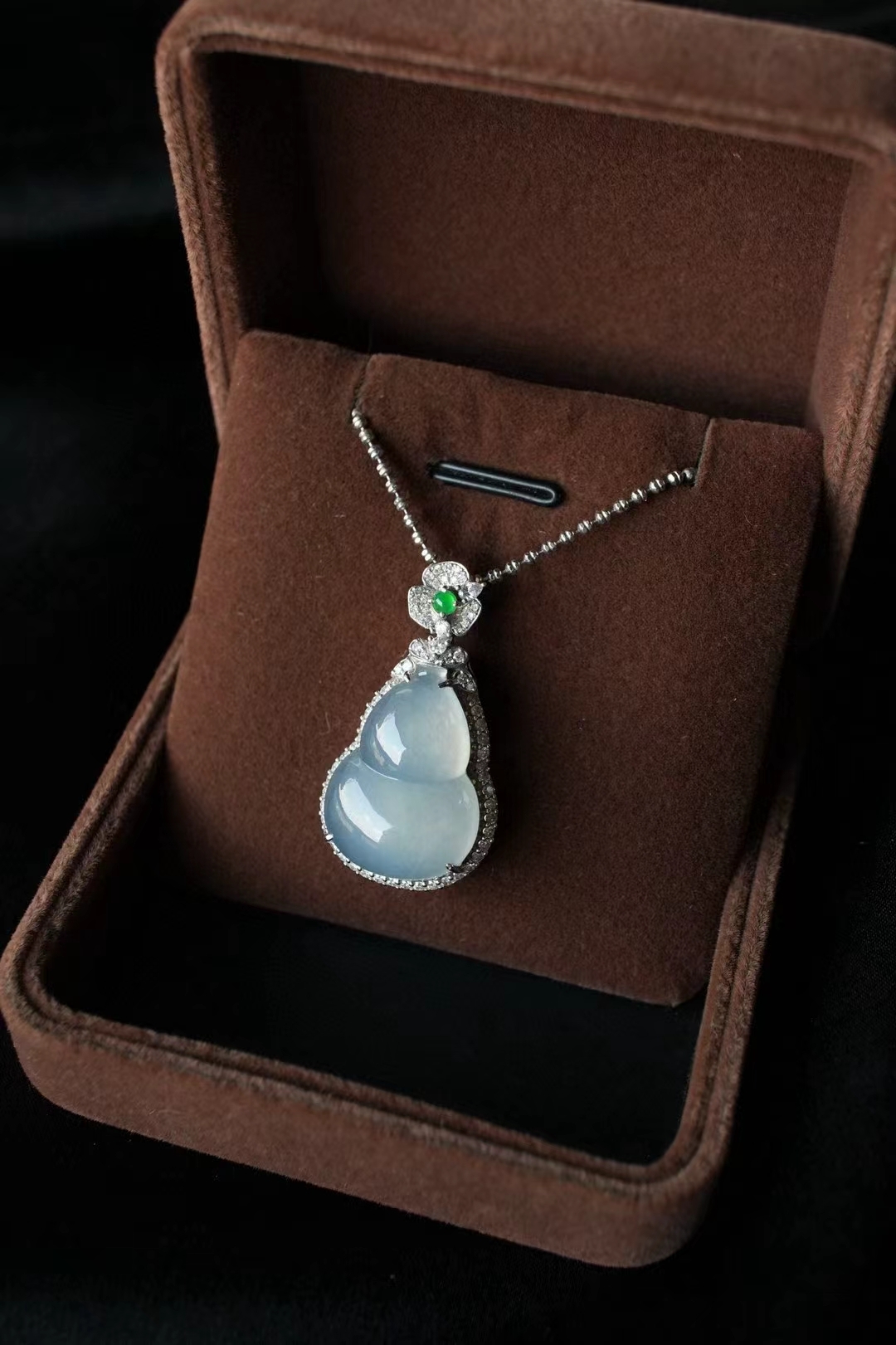 天然翡翠A玉,葫蘆完美起熒光,種水一流,底子細膩厚實,品相極佳!18K金鑽石設計,優美靈動,鑽石點綴精緻有珠寶感,佩戴精緻時尚,落落大方的氣質款。