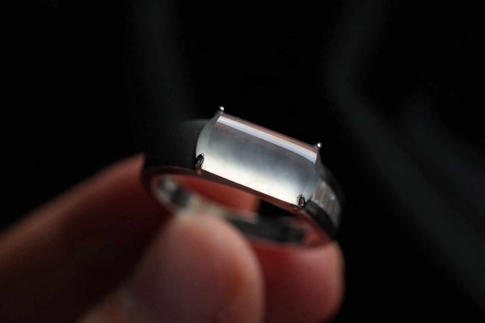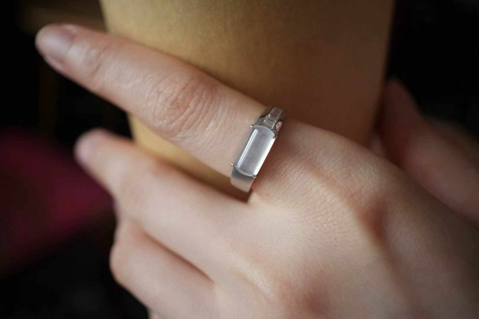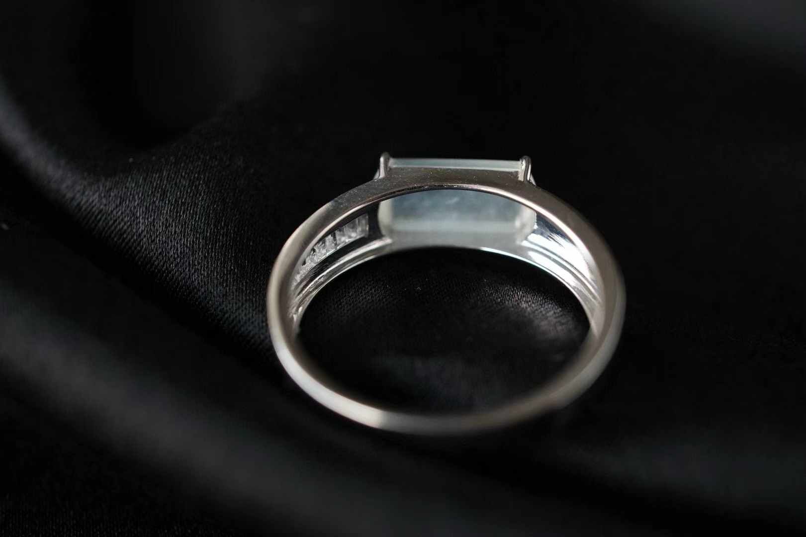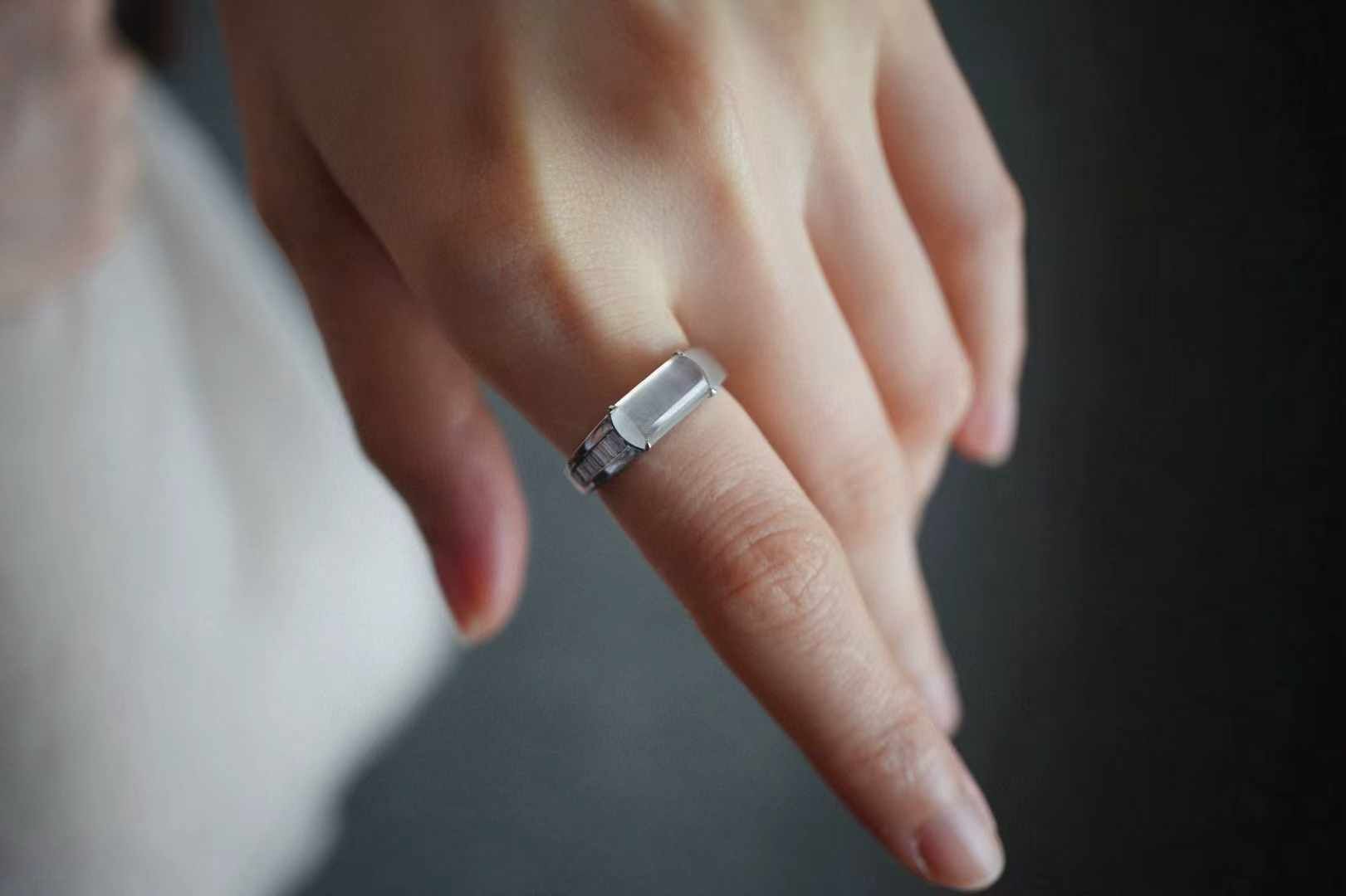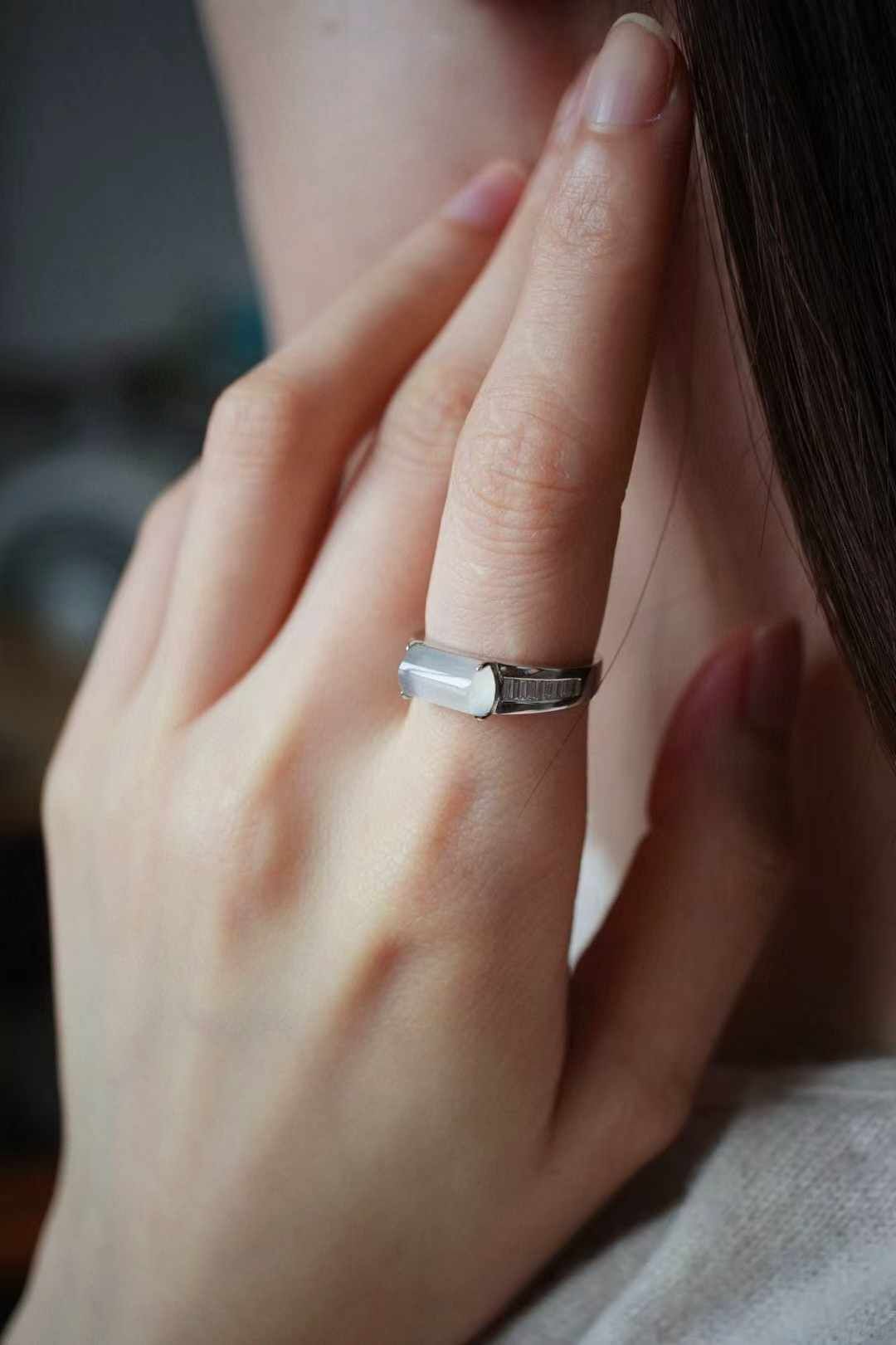 天然翡翠A玉,喜歡簡鑲設計,刪繁就簡,鬆弛時尚,18K金鑲嵌,戒臂一面磨砂,一面鑲鑽,裸石冰種起光,馬鞍戒的利落大方,很有獨特魅力。