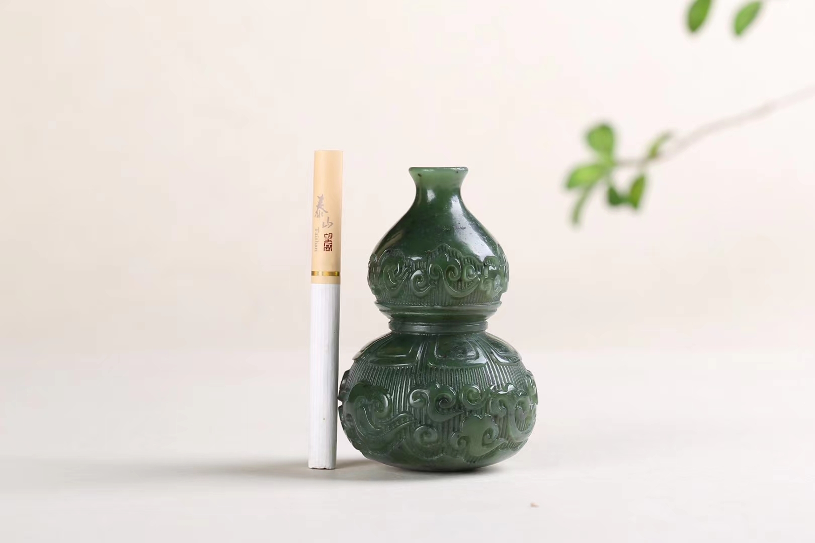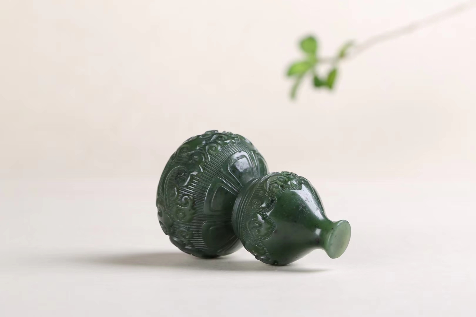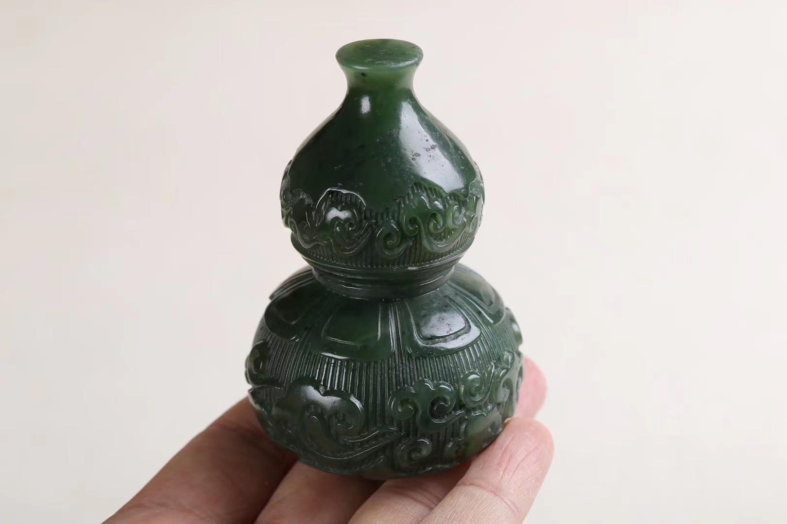 和田玉碧玉立體葫蘆小擺件。玉質細膩油潤,器型優美流暢,隨形雕琢葫蘆,圓潤飽滿,藤絲纏繞,葉子及藤蔓蔓延,雕刻繁簡有致;蝙蝠縈繞一側,