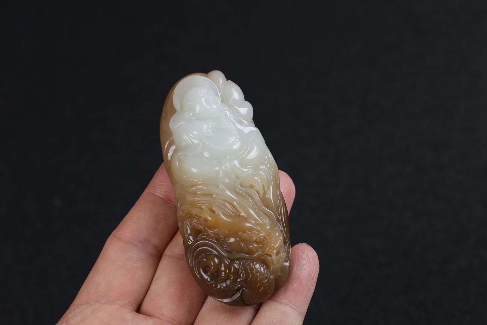 和田玉糖白玉彌勒佛蓮花生肖龍掛件手把件。