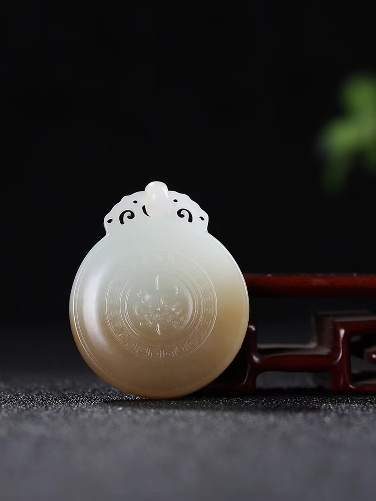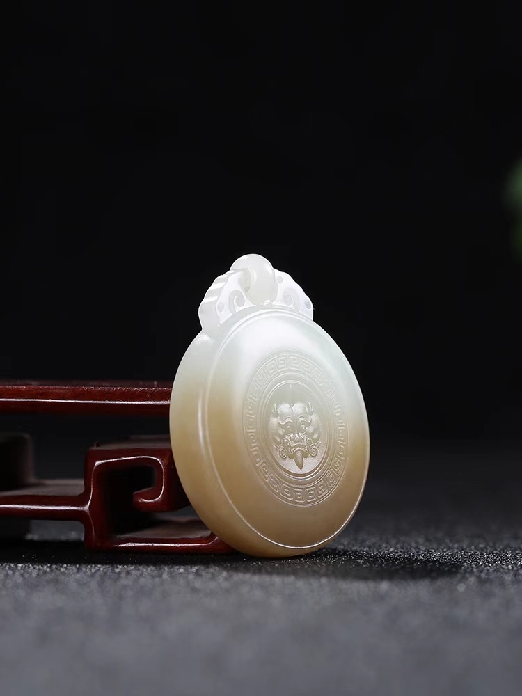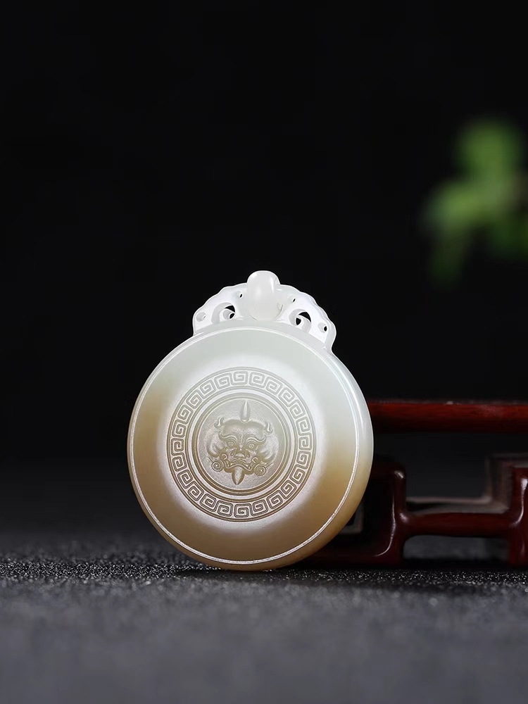 質地溫潤細糯,品質高貴大氣,雕仿古獸面牌子,獸面威嚴肅穆,給人寧列、威懾之感,造型獨特古樸,古韻生輝,具有浪漫主義色彩和感染力