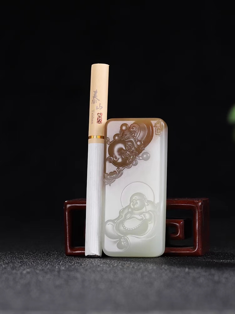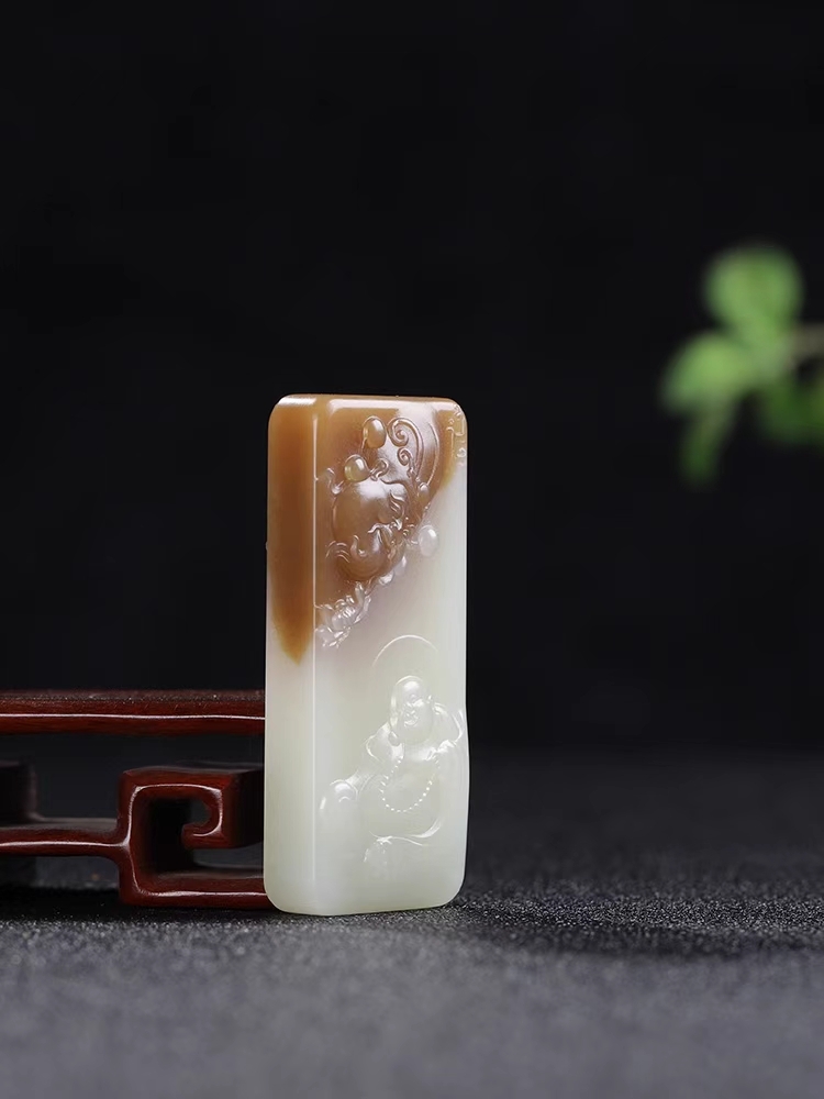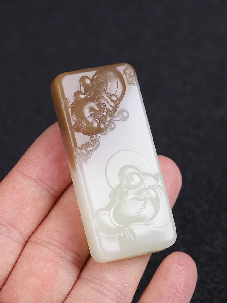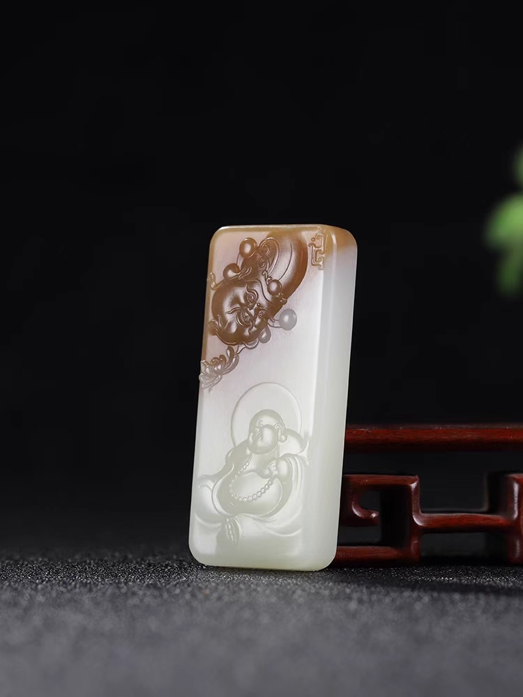玉面浮雕彌勒佛和財神,悠然愜意,體態豐腴,福耳垂肩,笑逐顏開,身穿袈裟,坦胸露腹,怡然自樂刻畫傳神生動,大肚能容常人難容之事,忍得住心中煩惱,耐住歲月寂寞,不爭一時之氣,方免百日之憂。