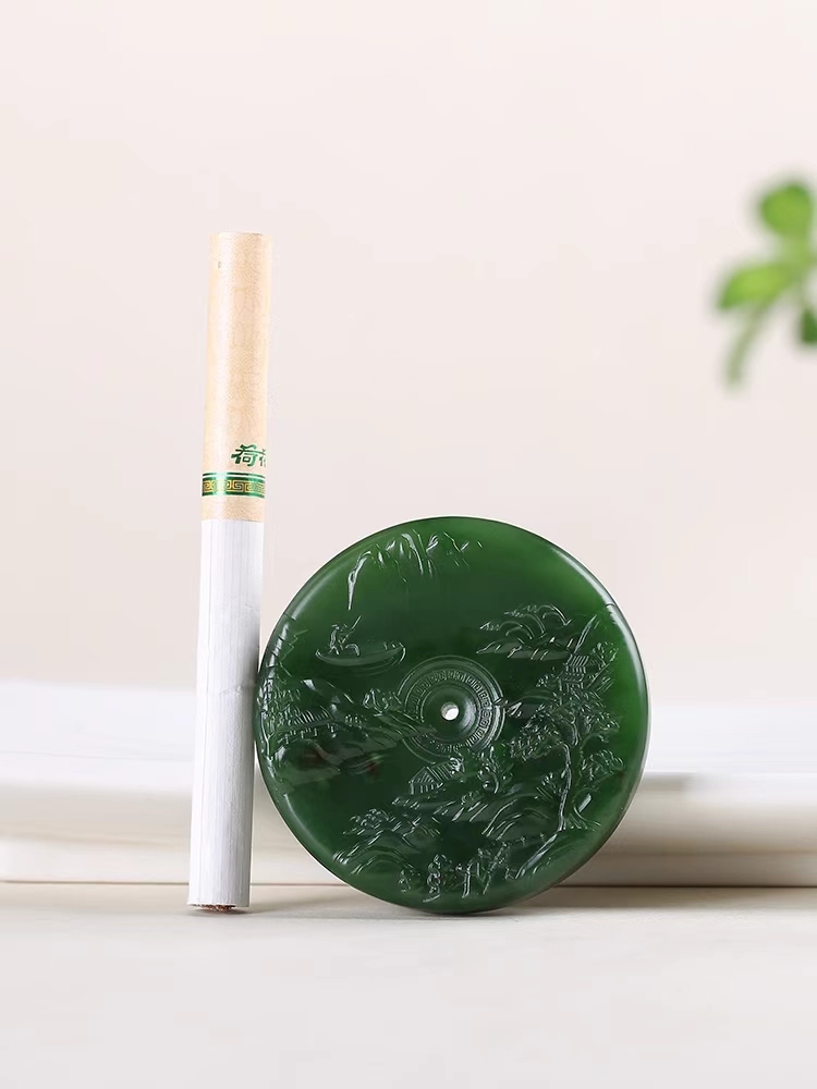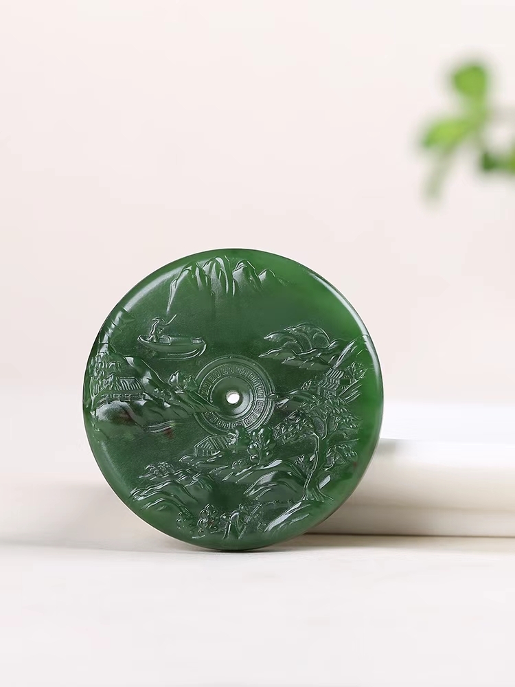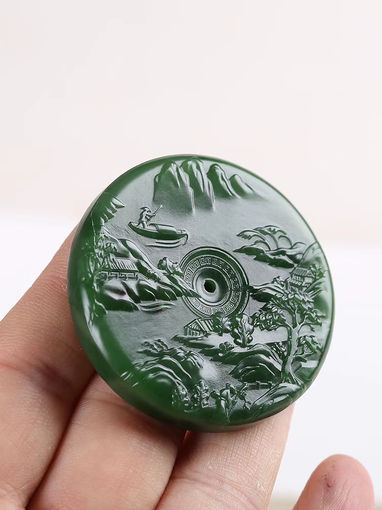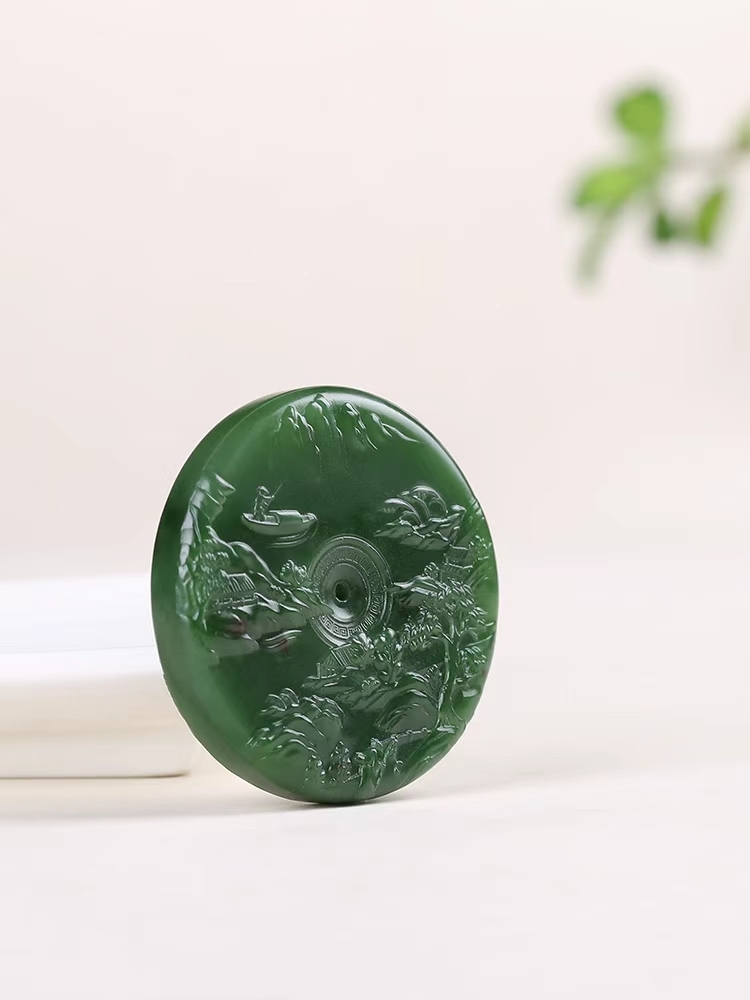 和田玉碧玉山水雙面雕刻圓牌掛件吊墜。玉質溫潤細膩,色澤大氣典雅,巧雕山水之景,山石綿延起伏,江水浩淼廣闊,房屋依山傍水,古鬆生於崖畔,蒼勁挺拔,江流無際,令人心生嚮往,讓人沉醉在山間靜謐深遠的意境之中,遠離喧囂,與世無爭。