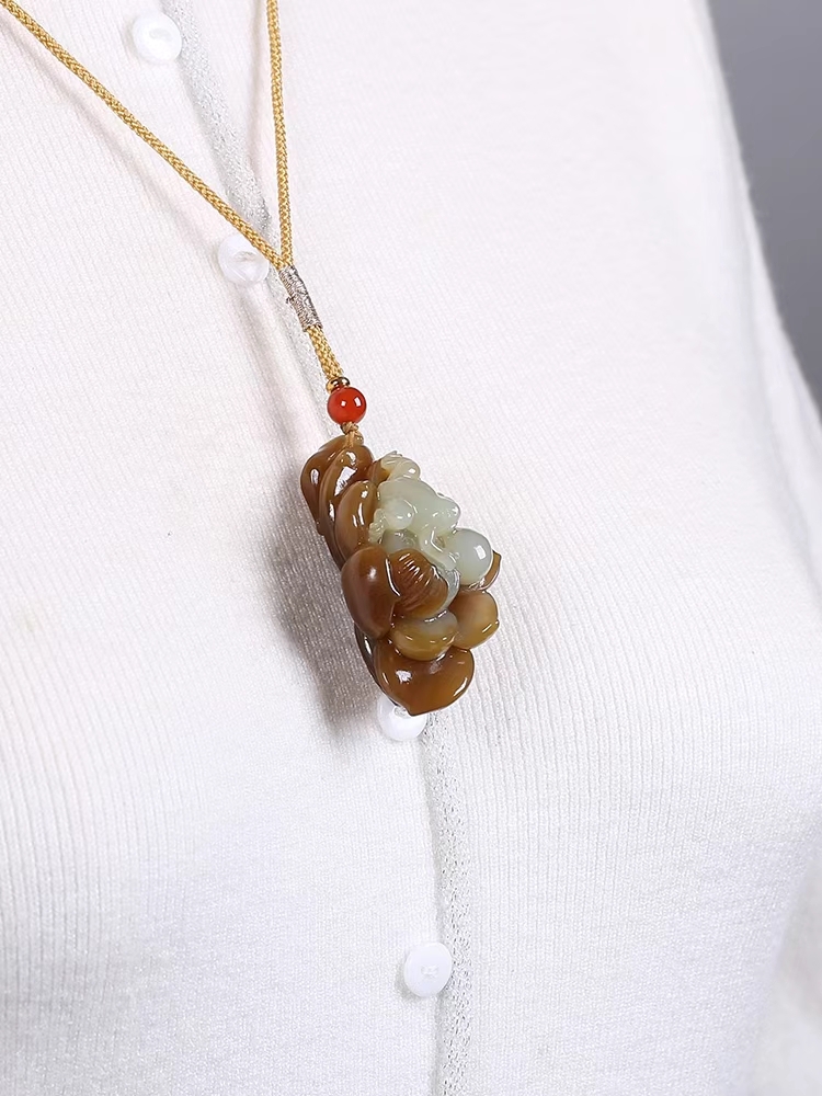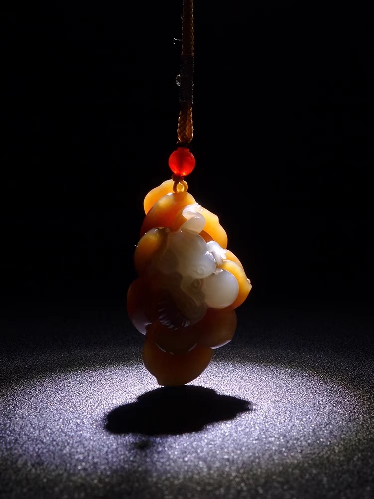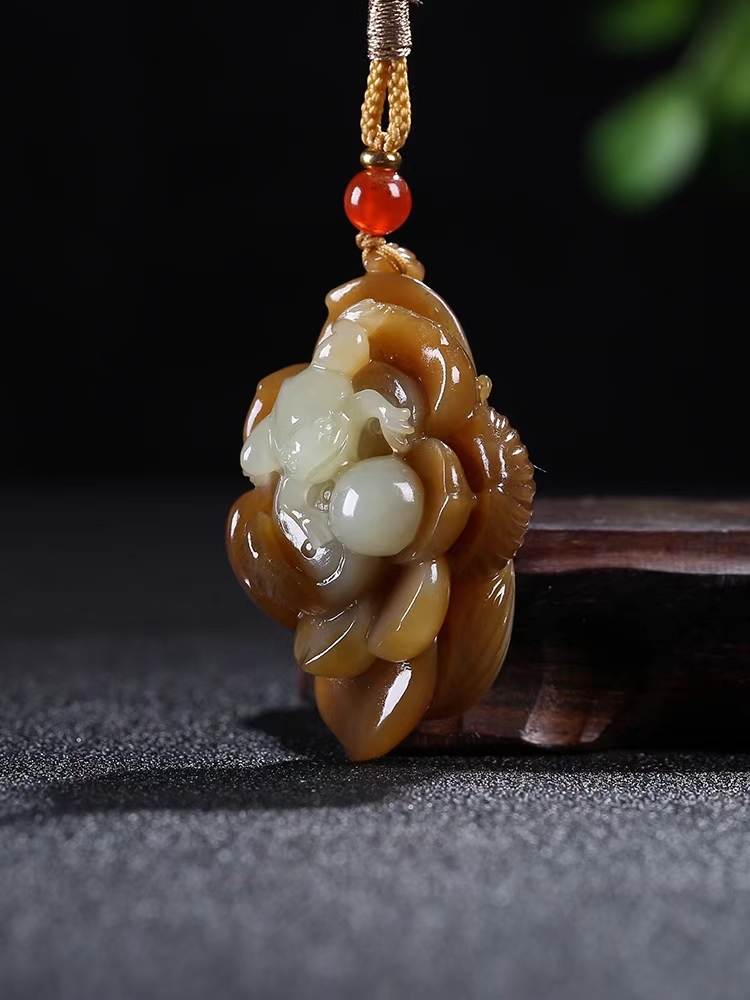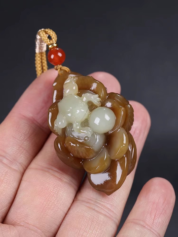 和田玉呱呱來財掛件,器型小巧致,巧雕青蛙伏於蓮蓬之上,雙眼圓鼓,炯炯有神,體態圓潤,躍躍欲跳,俏皮可愛,一動一靜,動蘊靜中,整器頗具趣味,體現呱呱來財的吉祥寓意