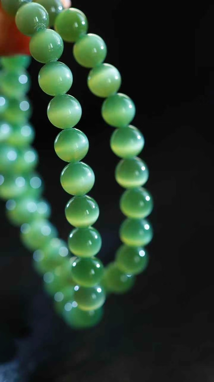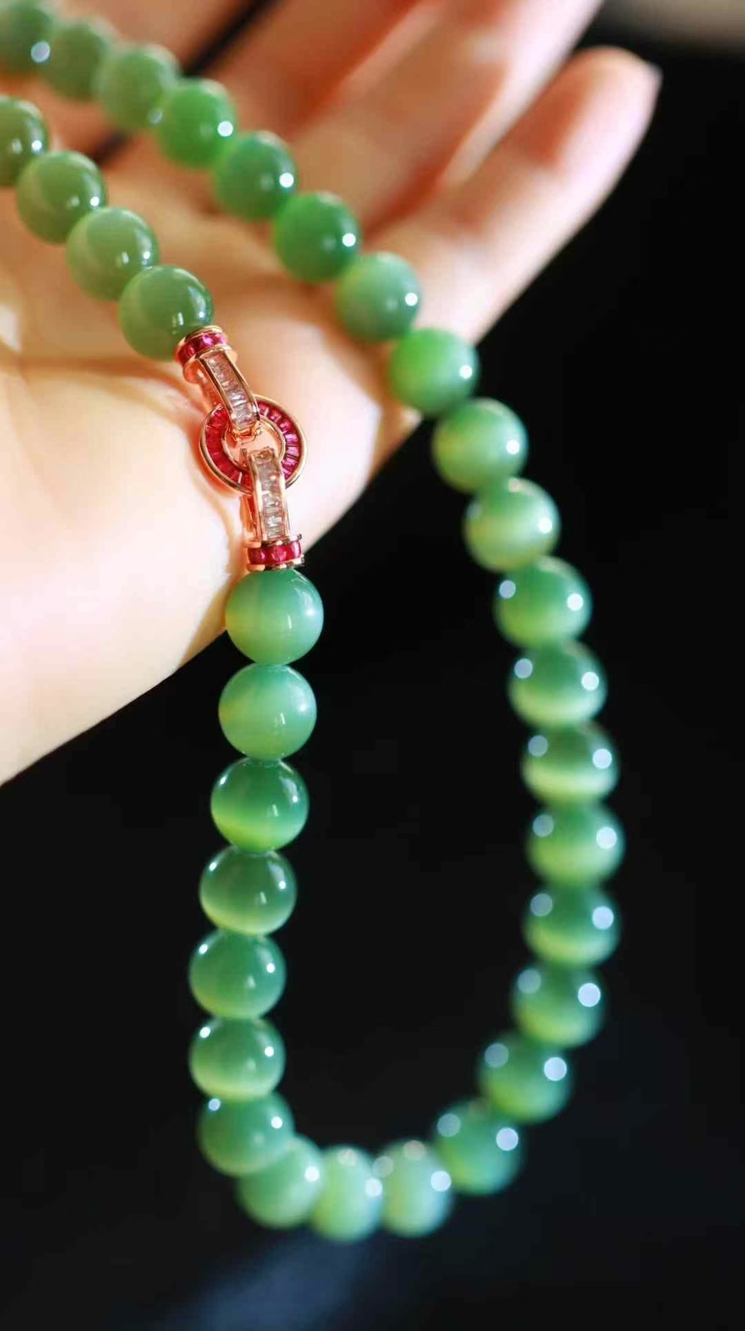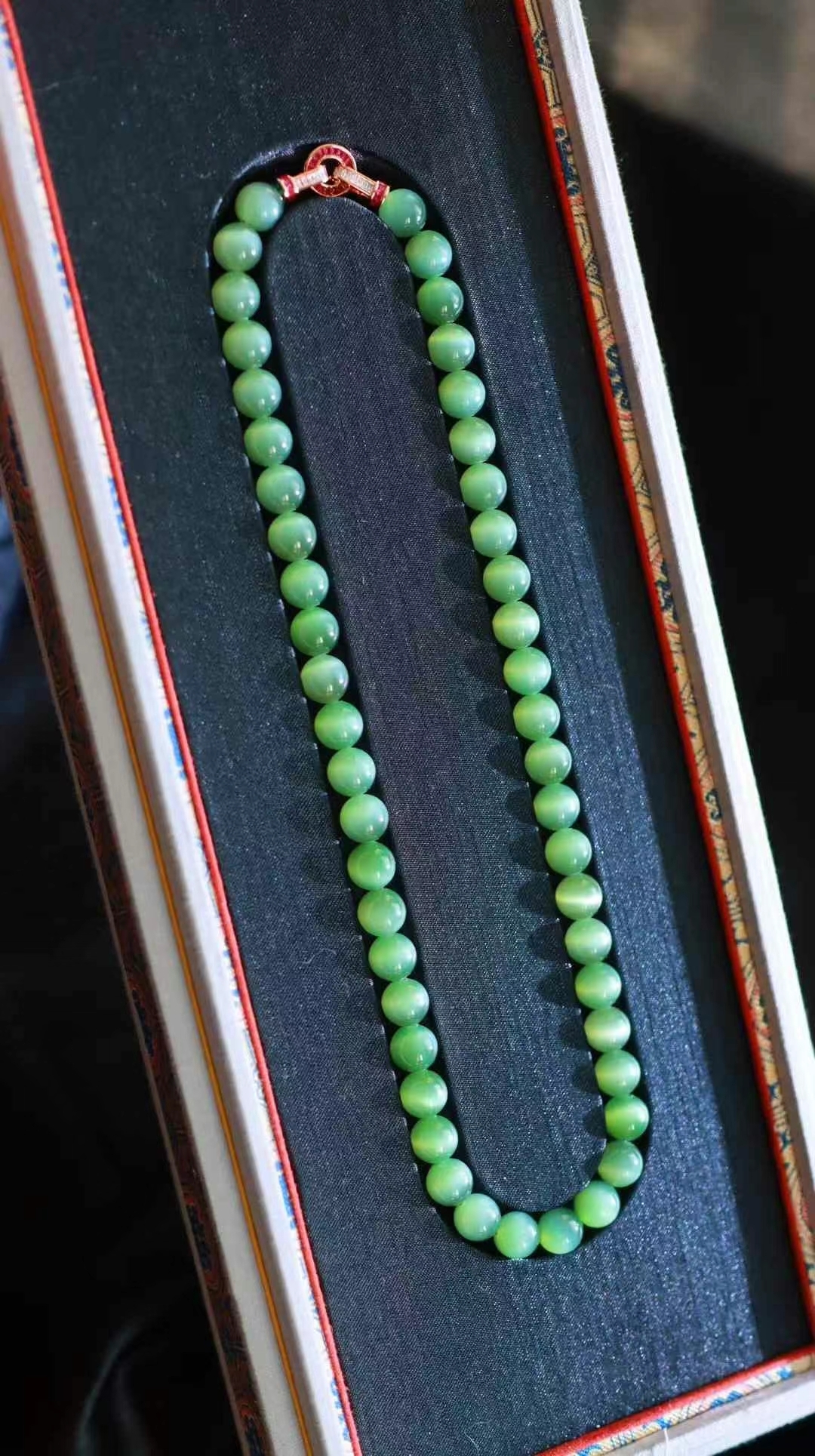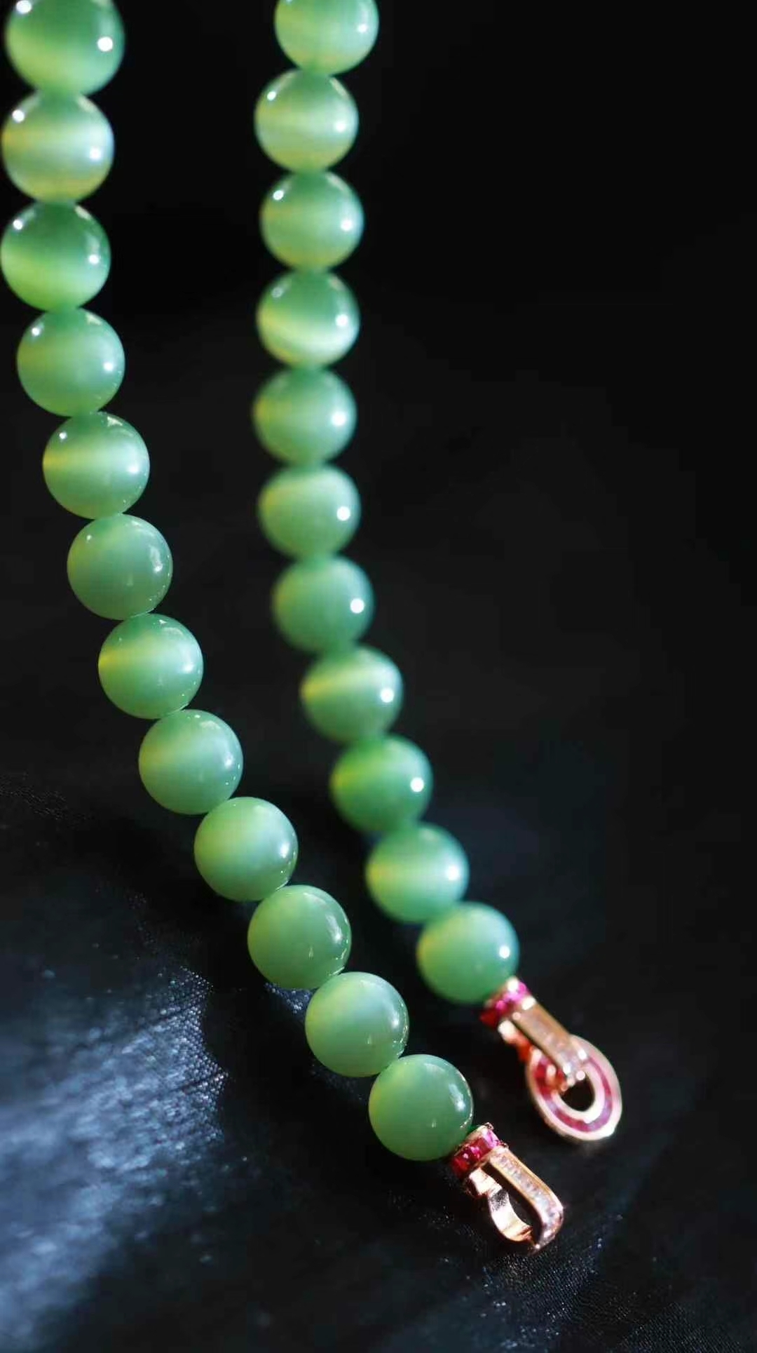 「揉碎一枚月亮,化作萬千星辰。」收藏品•和田碧玉冰底貓眼項鏈 ,水靈通透,熒光閃閃似星火閃耀,每一顆都是活貓眼。