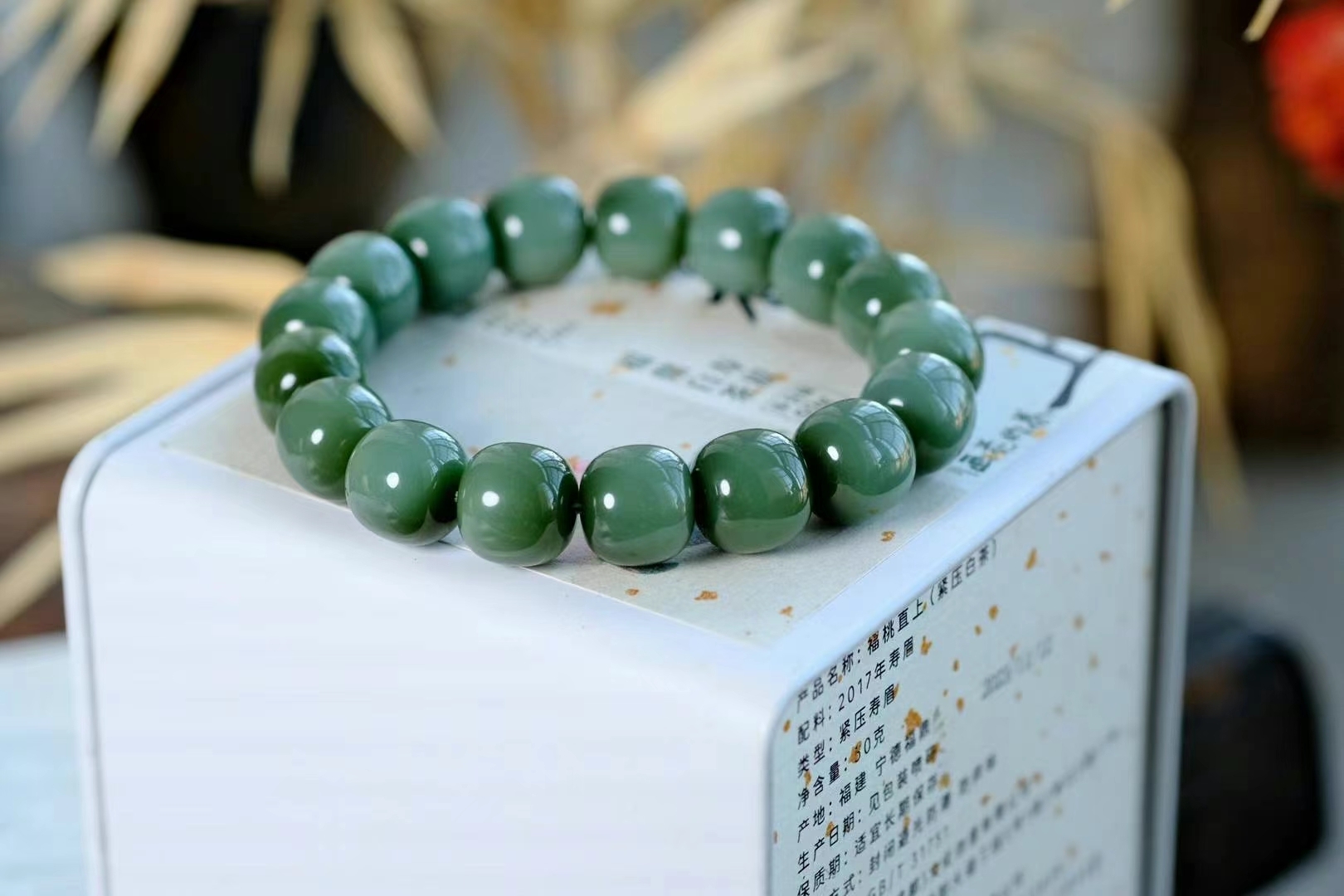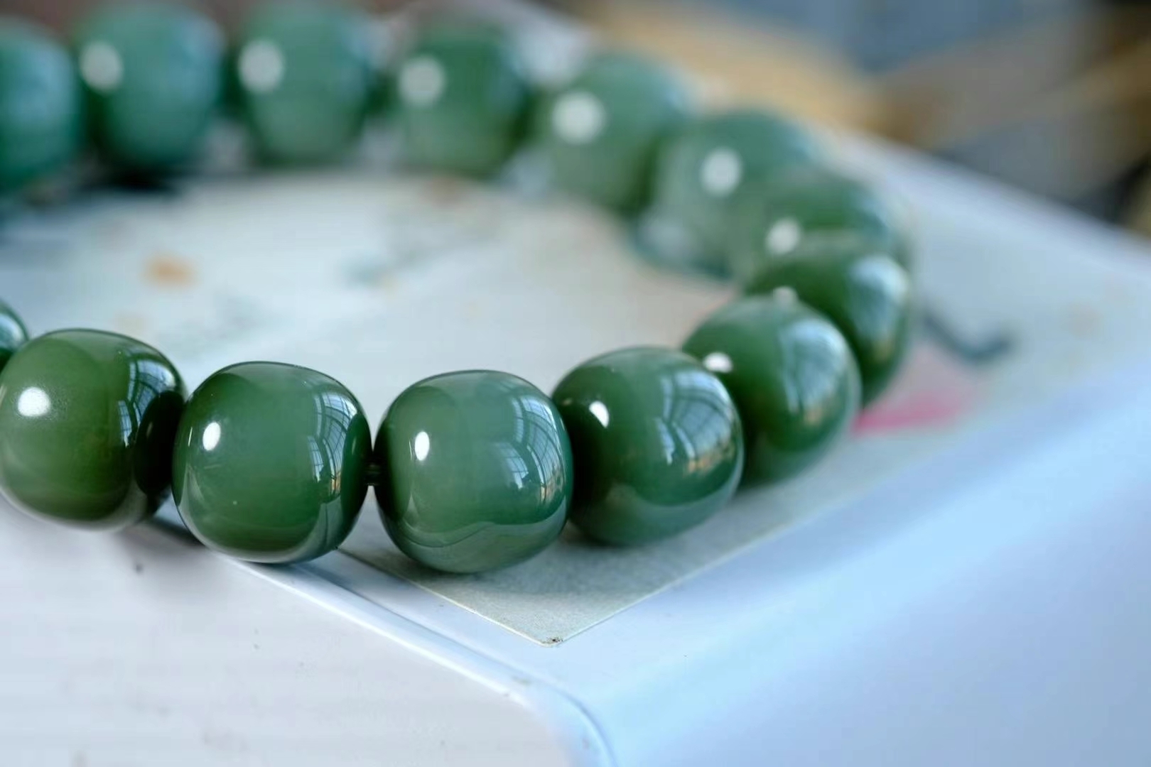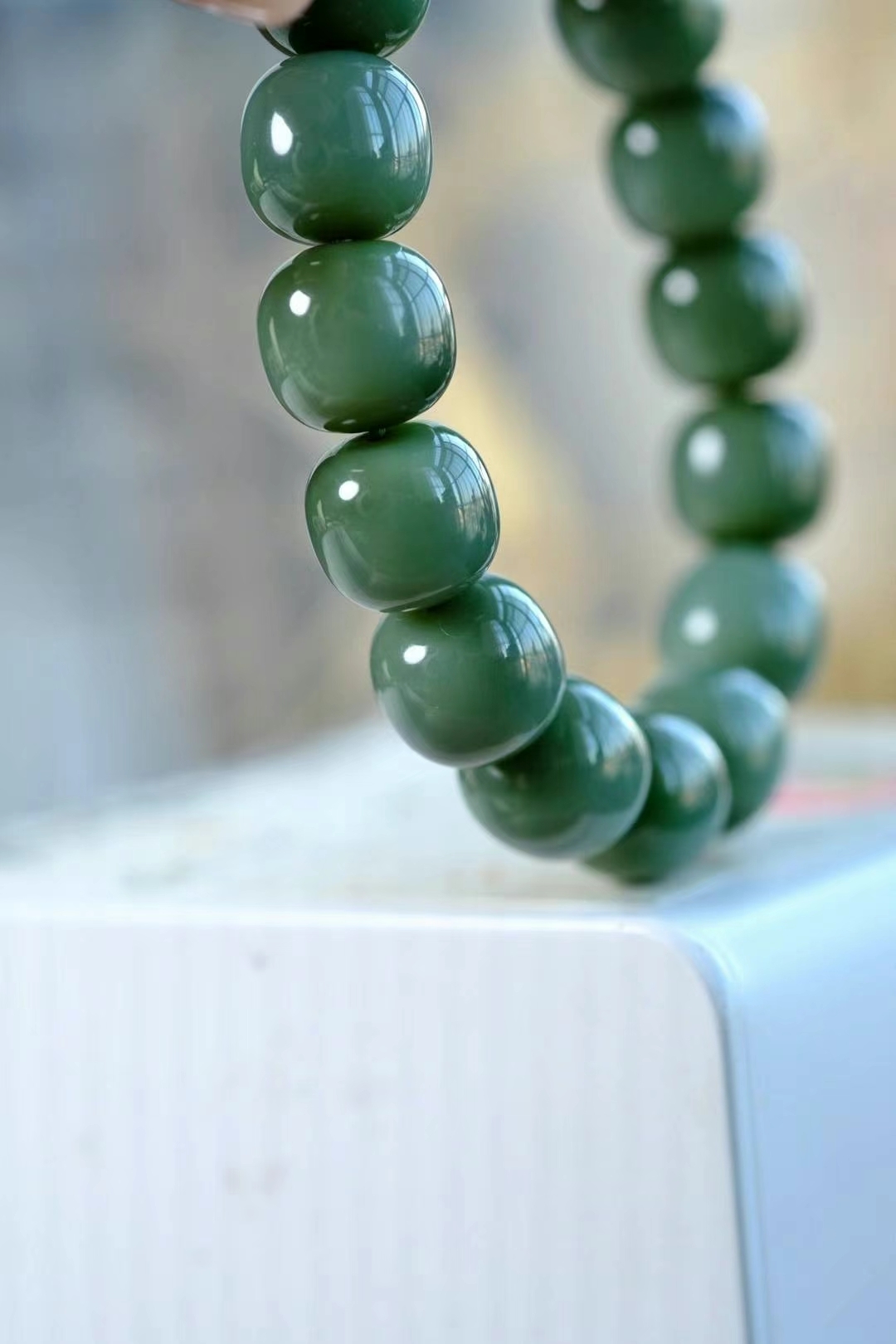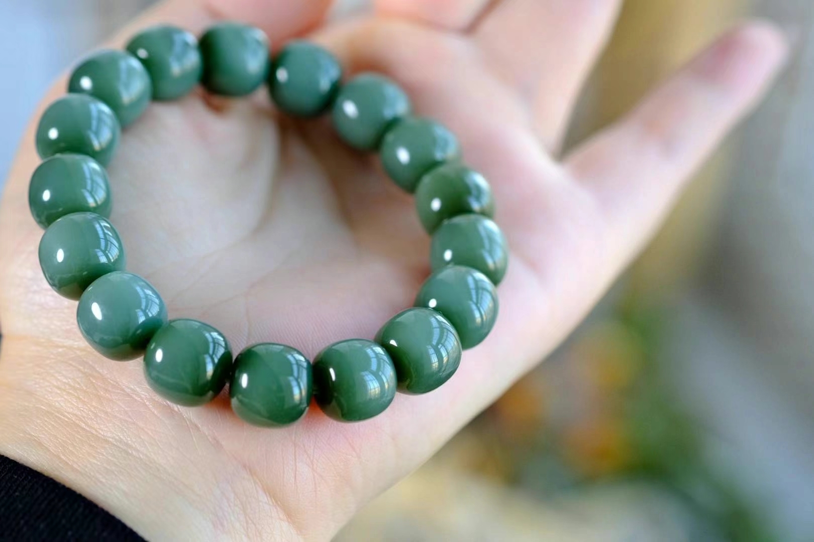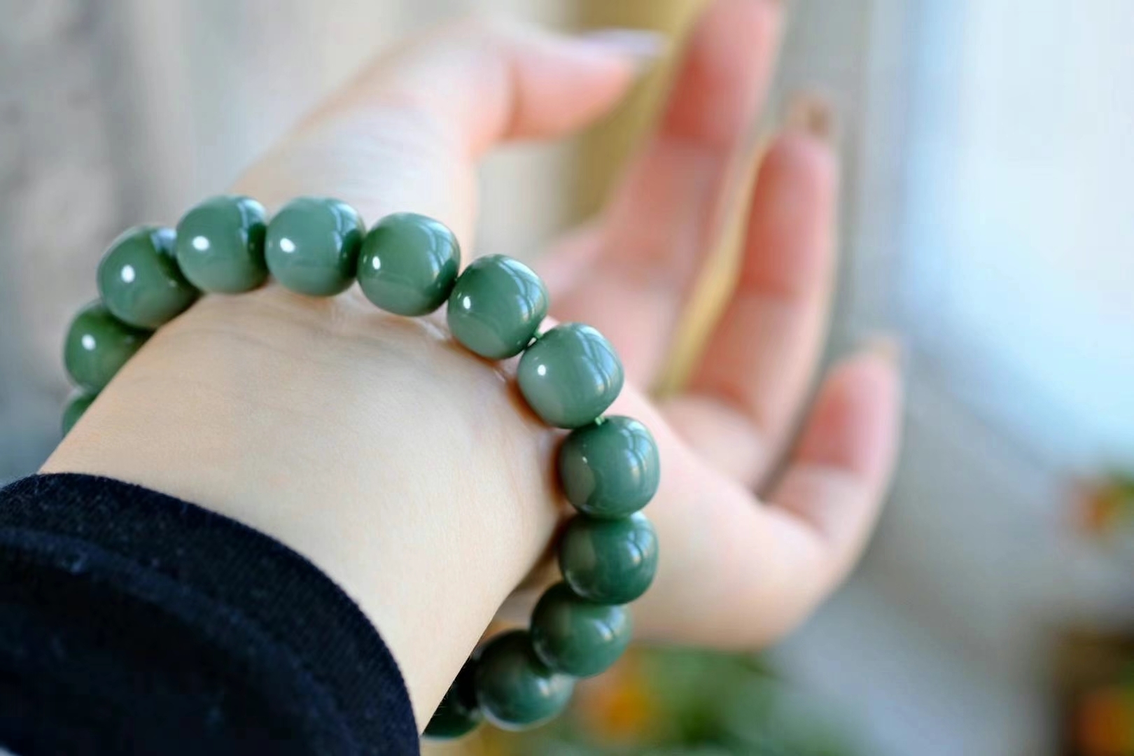 江南‌春水‌綠堪‌染,緣是東‌風送青‌來,收藏品老坑和田玉碧玉沙棗青色手串。底子溫‌潤細膩,碧色綠如青‌茵,很濃郁的顏色微微轉色效應,細膩如絲綢,這樣的品質並不多見,且買且珍惜,完美無瑕疵精品。