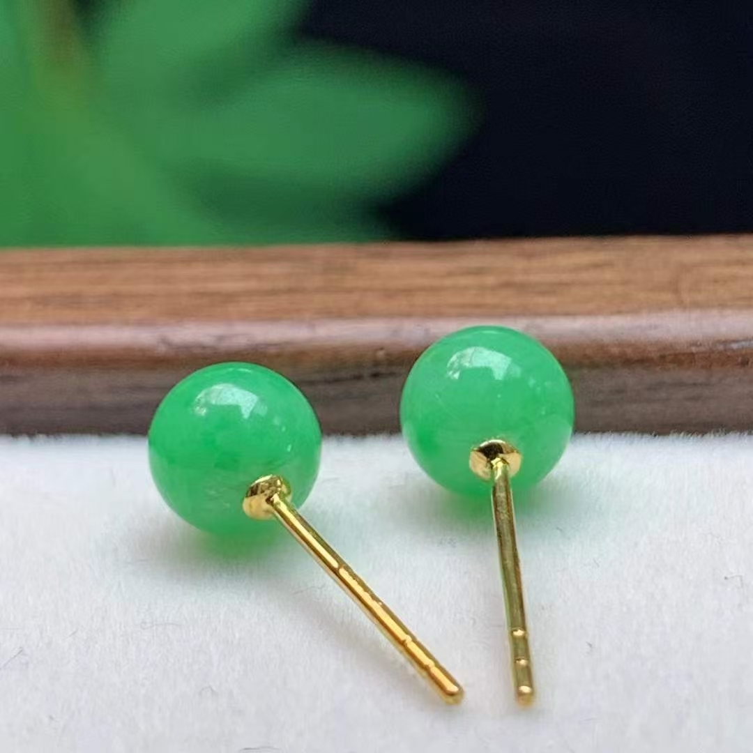 • 翡翠飄綠圓珠耳釘一對,天然翡翠A玉, 緬甸玉, Jade, Jadeite