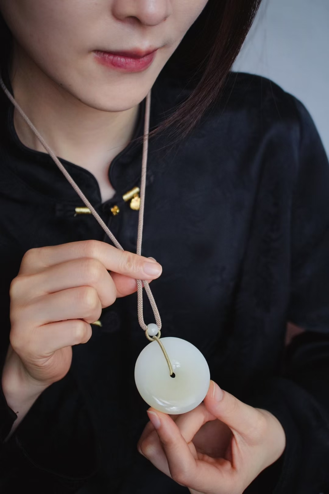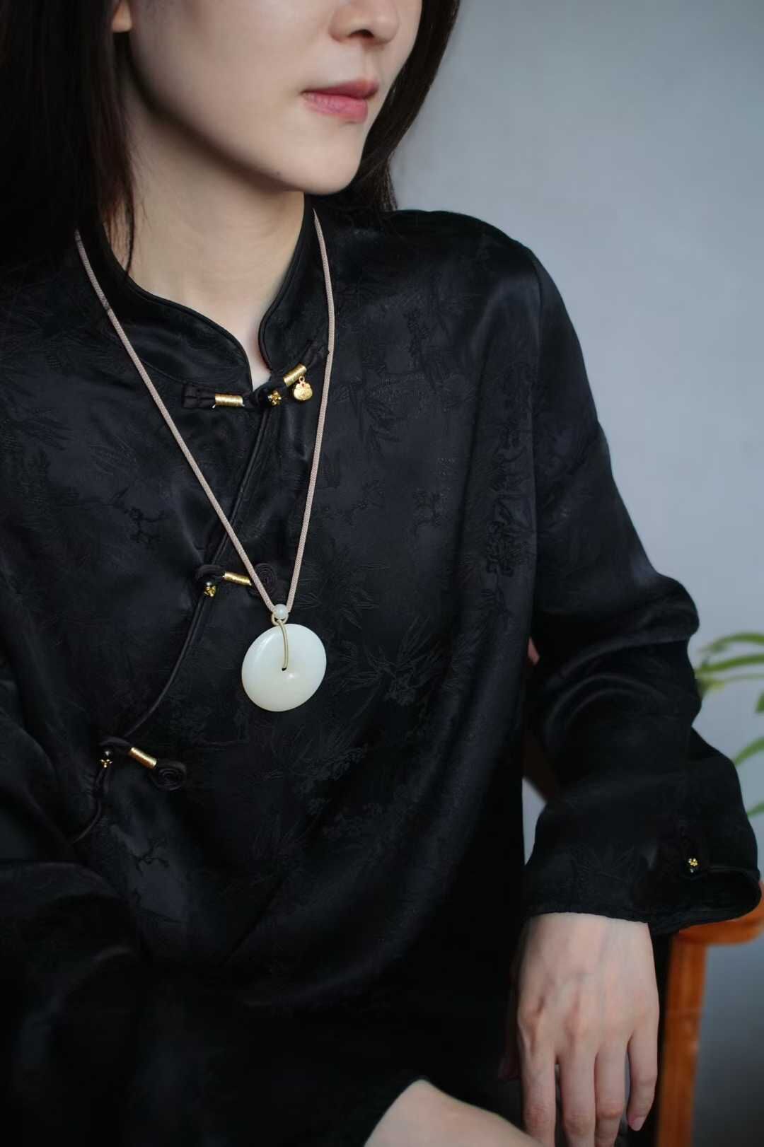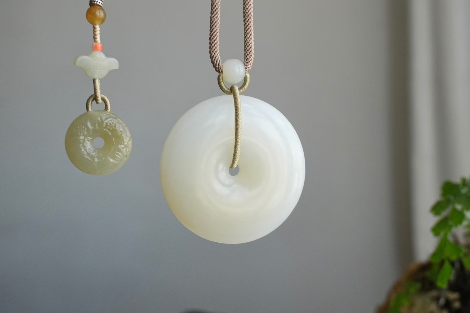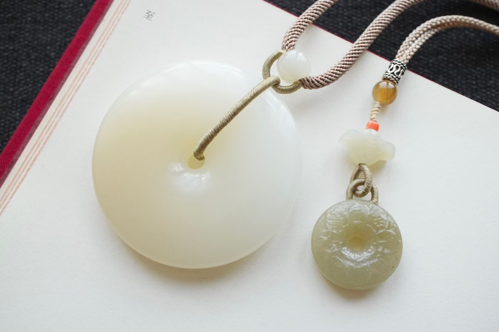 搭配純手工製作繩,糖白雕刻復古平安扣做尾墜,白玉蝙蝠做背雲,白玉路路通連接純銀小配件、糖白圓珠等點綴,雙面皆可佩戴,上身大氣典雅!