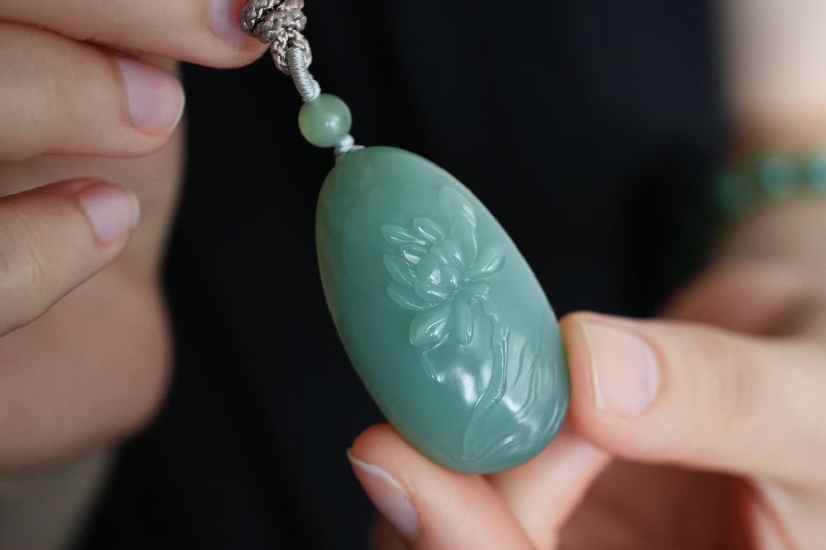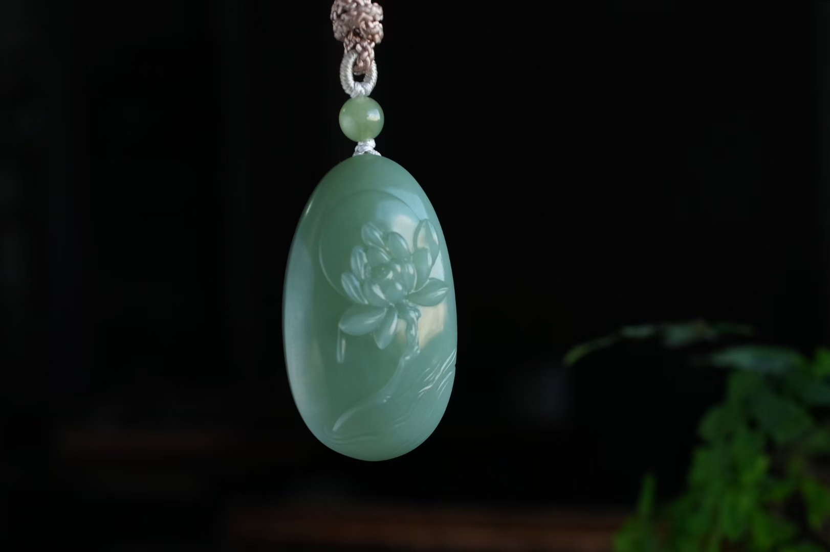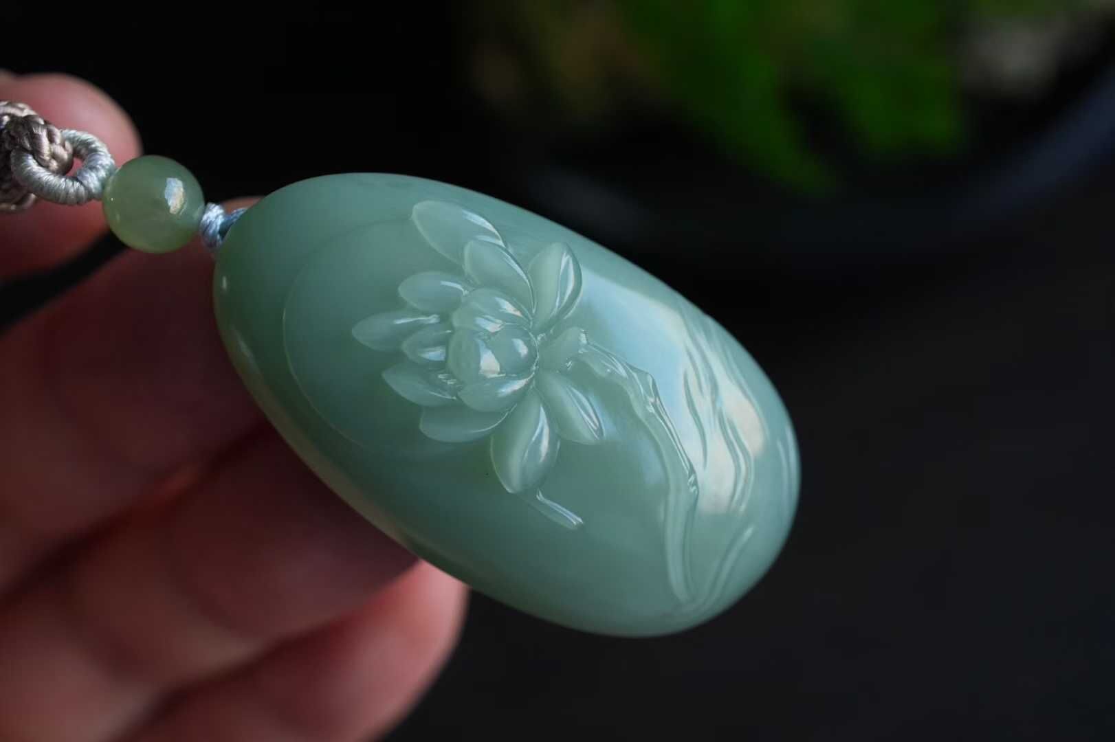 正面純手工蘇工雕刻一株荷花,蓮瓣飽滿柔美,荷花芳心吐露,背面精雕荷葉前後呼應主題,線條流暢精緻,搭配手工編織繩,碧玉圓珠點綴,寓意好運連連,和和美美。