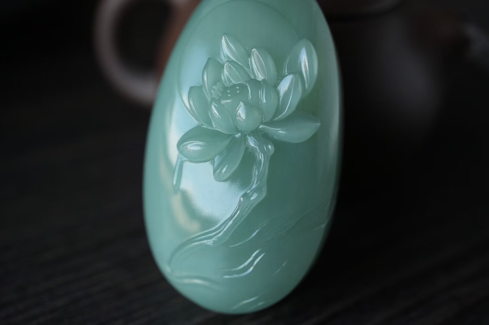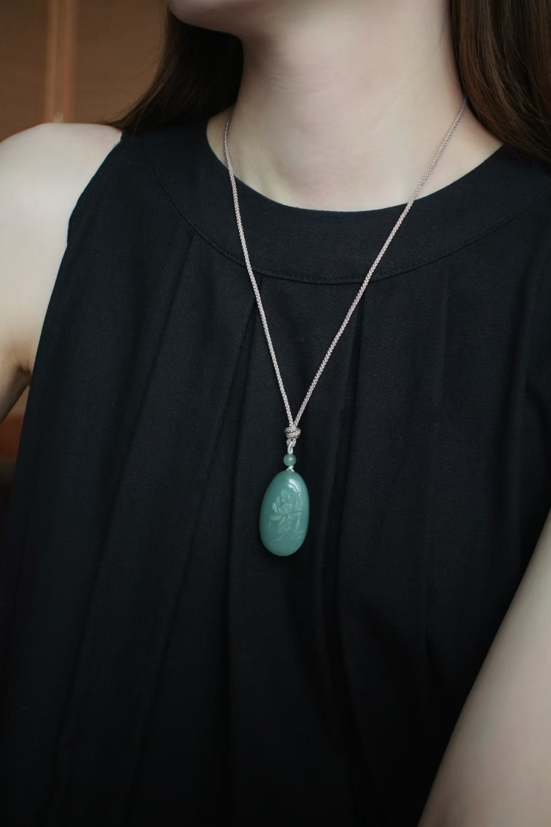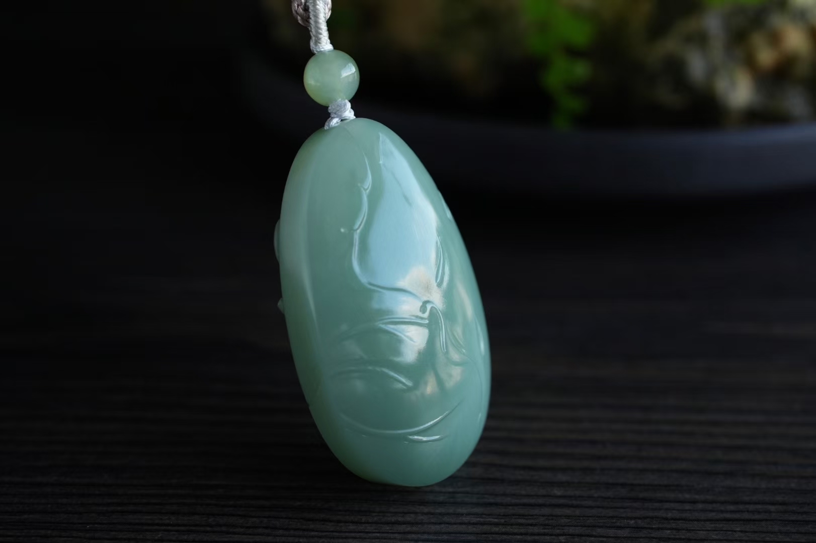 正面純手工蘇工雕刻一株荷花,蓮瓣飽滿柔美,荷花芳心吐露,背面精雕荷葉前後呼應主題,線條流暢精緻,搭配手工編織繩,碧玉圓珠點綴,寓意好運連連,和和美美。