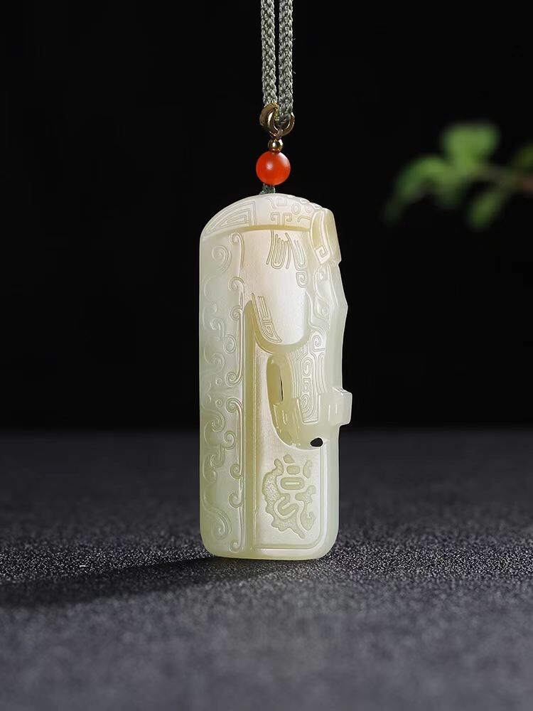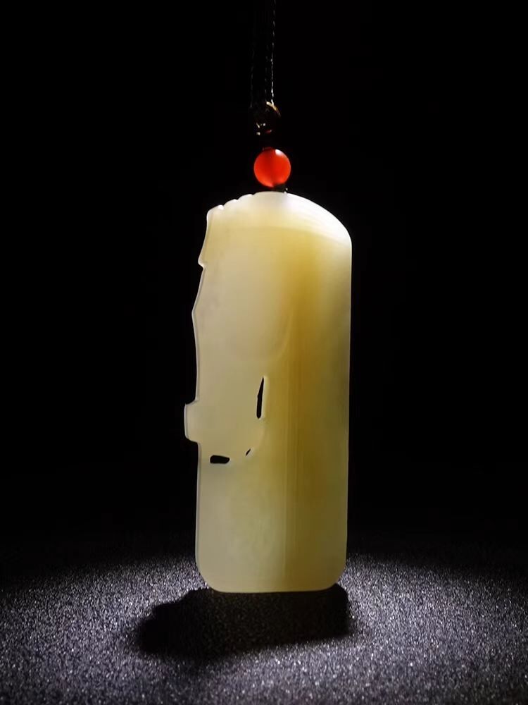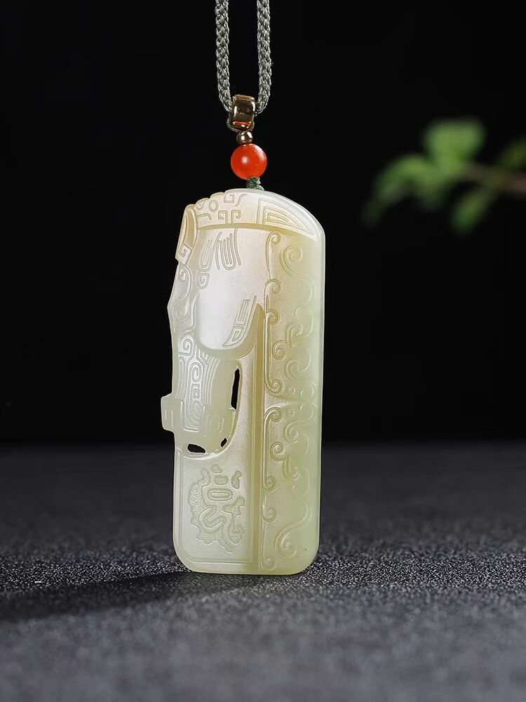 1117126 和田玉糖白玉帶翠仿古生肖馬牌子掛件