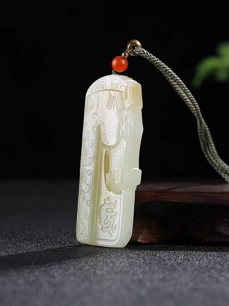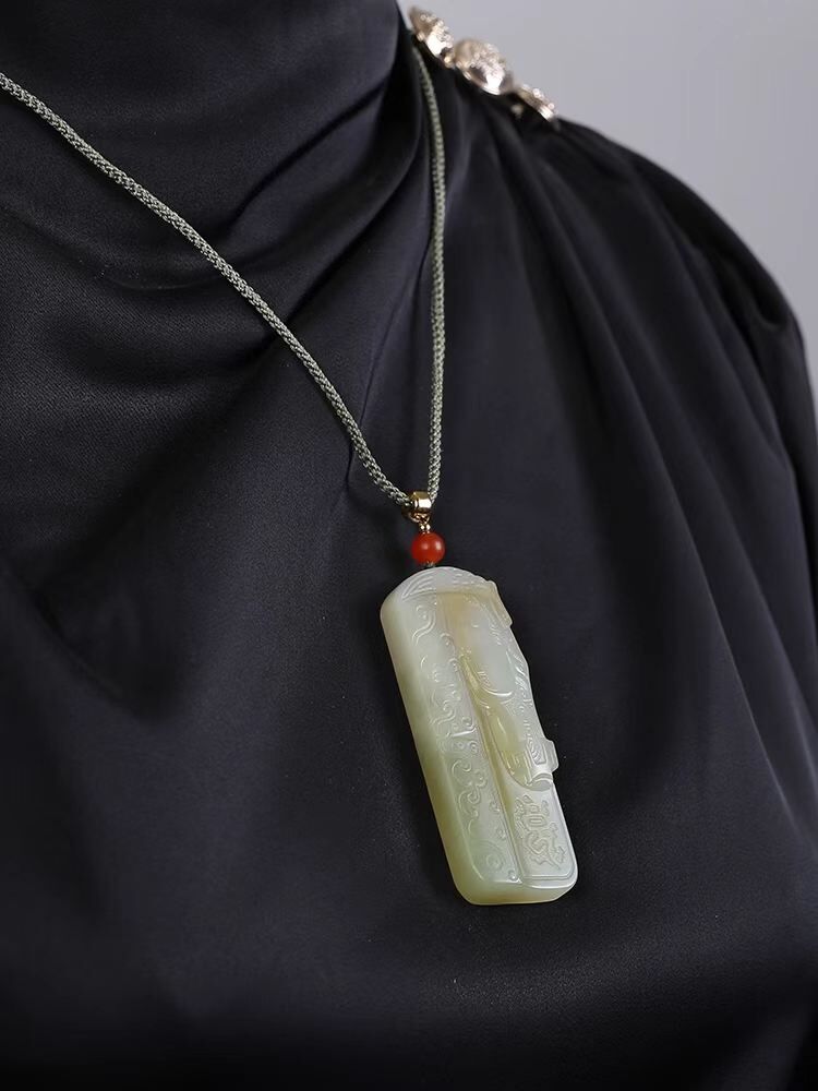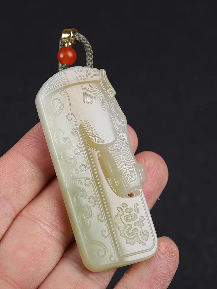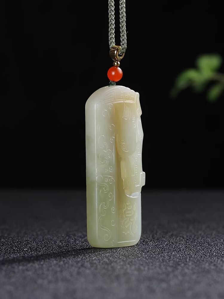• 和田玉糖白玉帶翠仿古生肖馬牌子掛件,天然和田玉軟玉