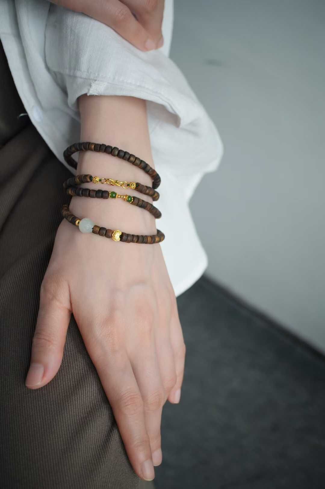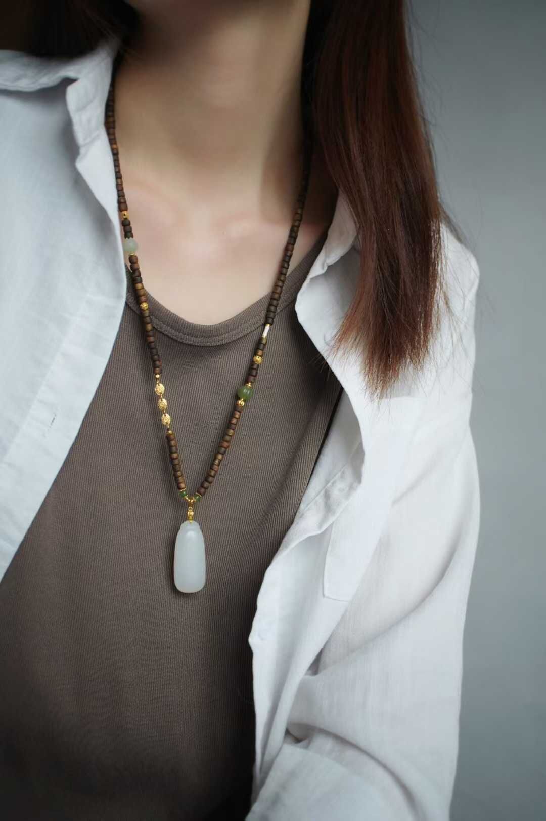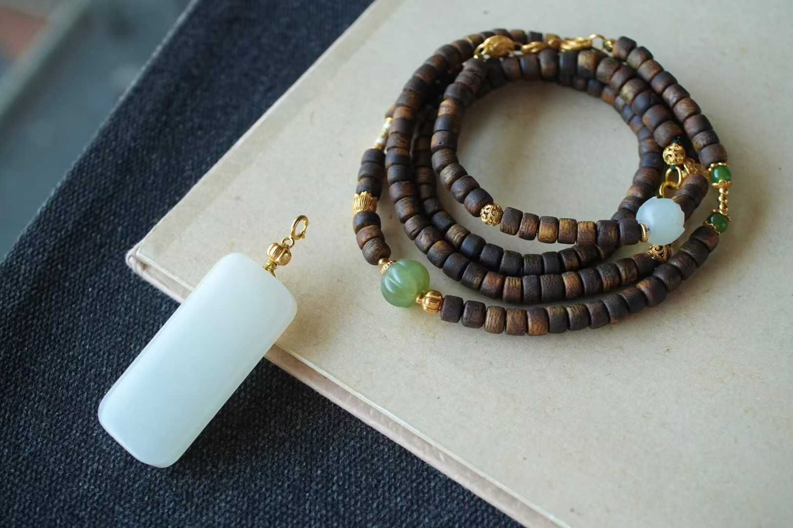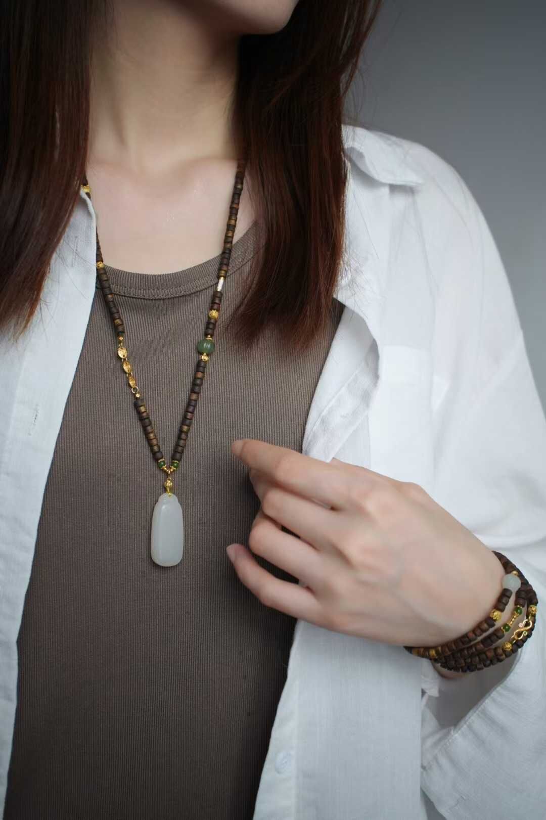 搭配油性飽滿天然綠奇楠沉香珠鏈(約4.5-5mm),點綴晴水南瓜珠、白玉蓮花珠、碧玉圓珠,吊墜可拆卸,可單獨做項鏈或多圈手鏈佩戴,清幽柔和的味道,觀聞之下,都能讓人沉靜,配飾均為925純銀鍍金。