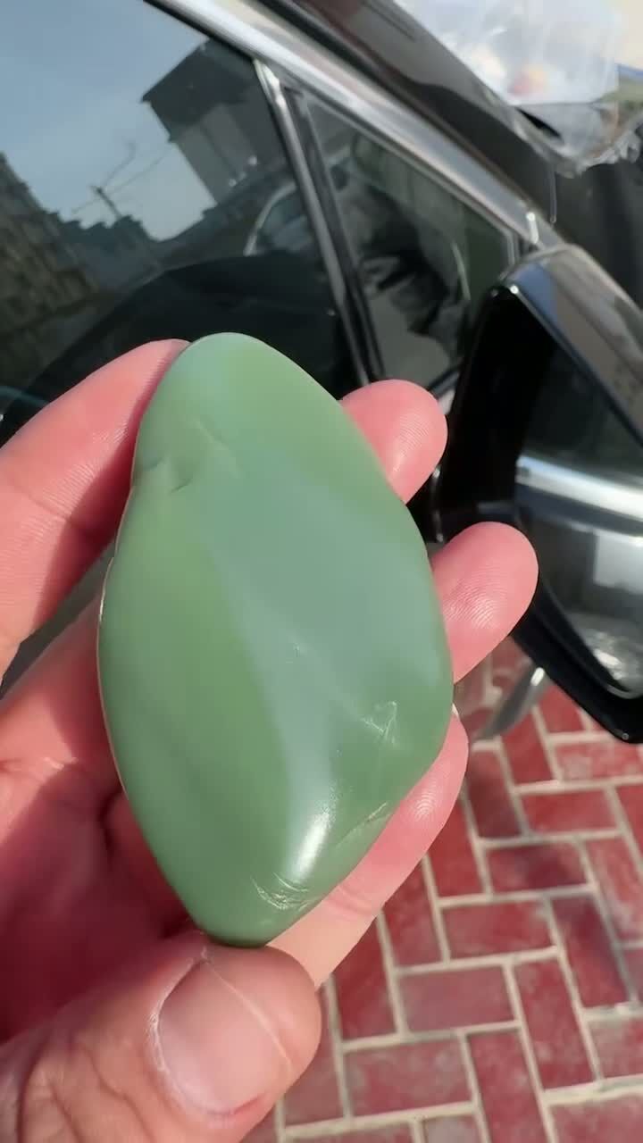 天然和田玉,極佳色系沙棗青原籽,色澤翠綠,肉質過燈,正面無瑕疵,背面略有小磕碰瑕疵,原籽,油性極佳。