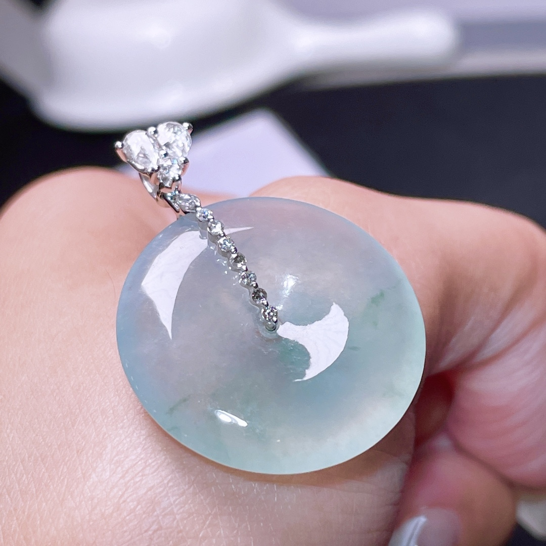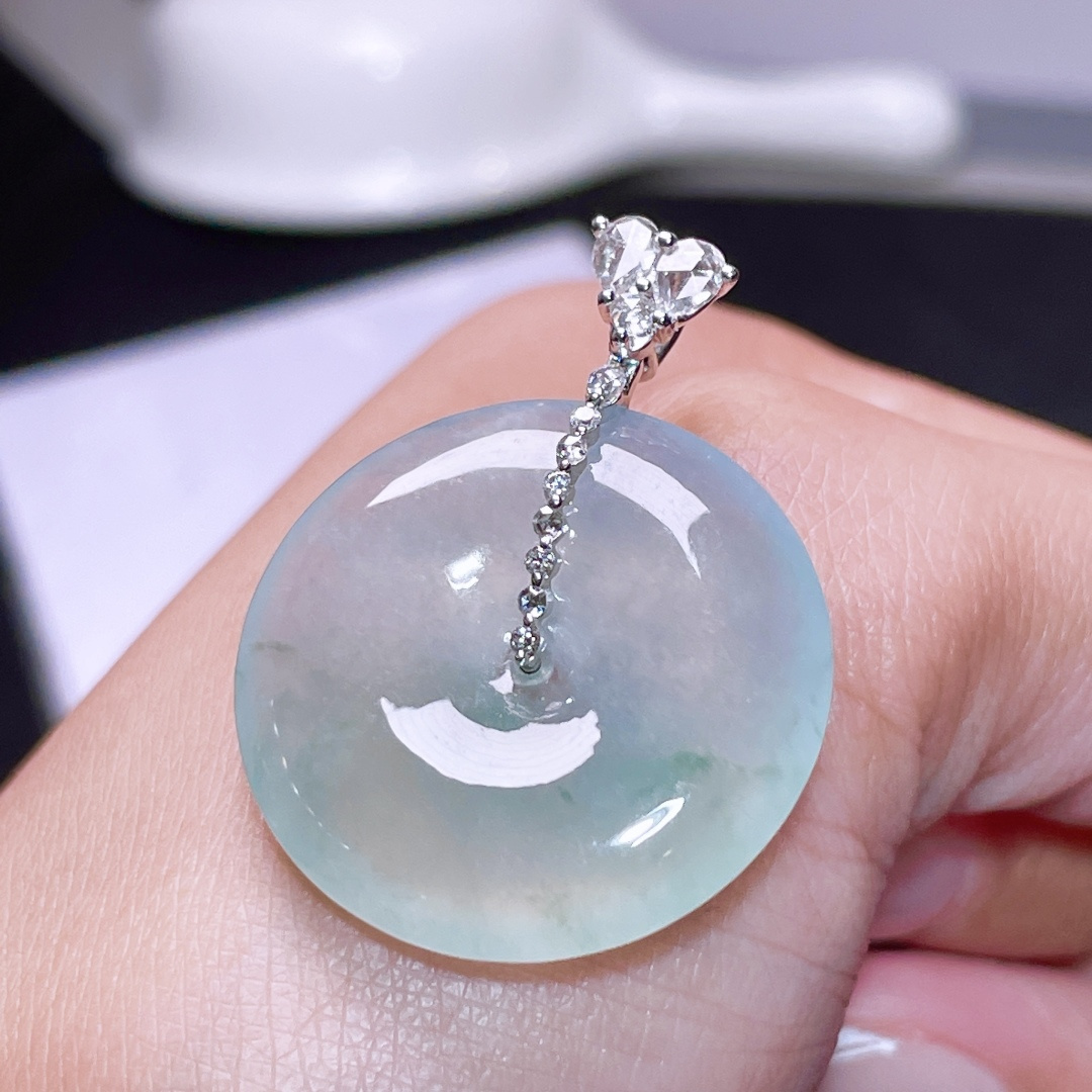 天然翡翠A玉,緬料,老坑冰種,冰透水潤,18K金鑲嵌。