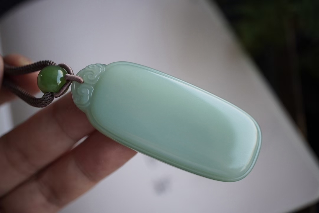 • 和田玉稀有瓷藍底粉青平安無事牌掛件,天然和田玉軟玉