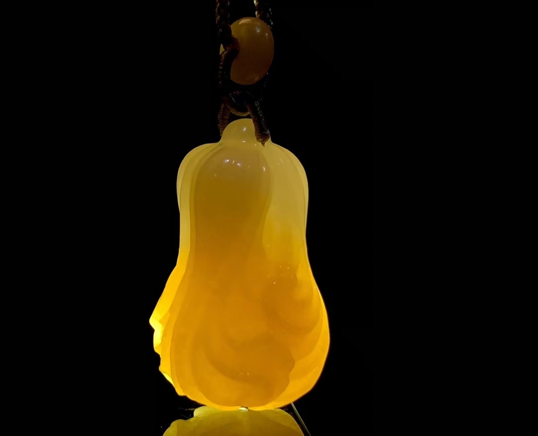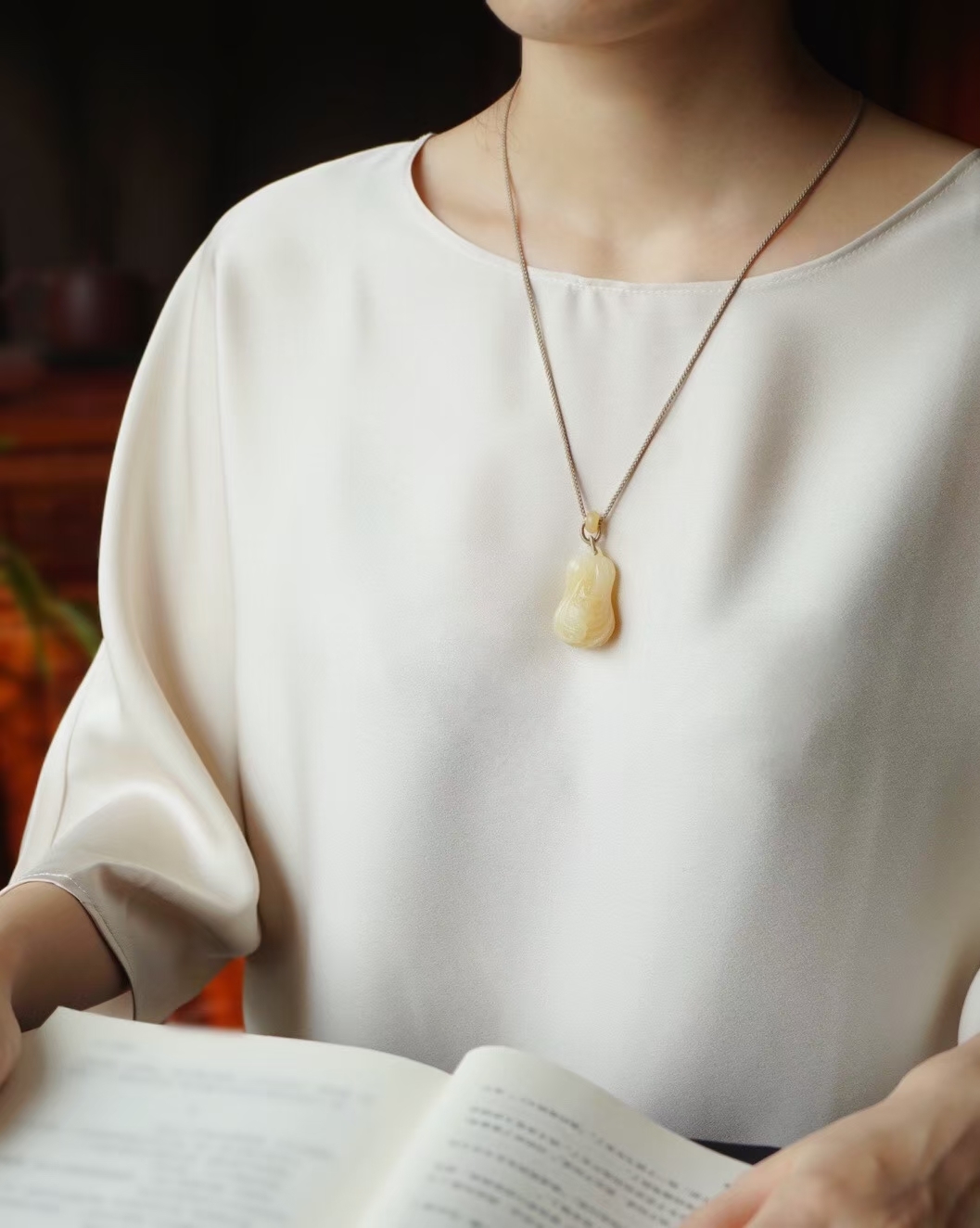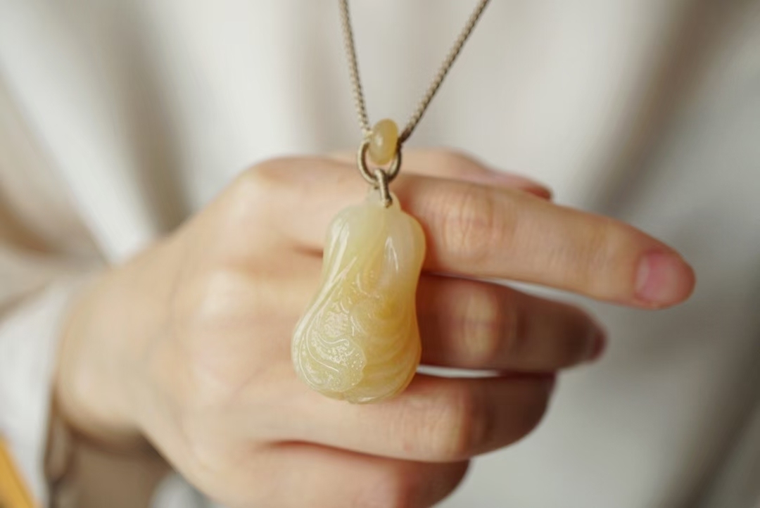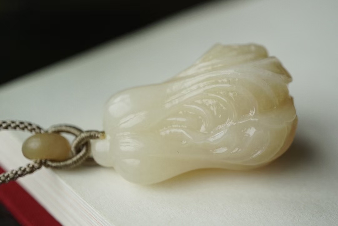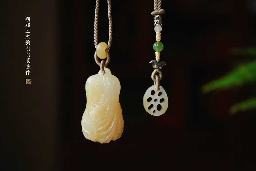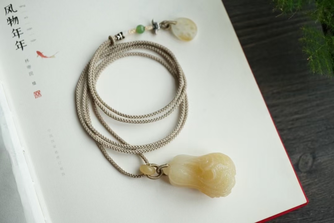 型體飽滿厚實,蘇工立體精雕一顆大白菜,葉片等細節纖微畢現,有聚財、招財、百財聚來的美好寓意。搭配純手工製作繩,糖白蓮藕作尾墜,純銀元寶做背雲,碧玉南瓜珠,白玉圓珠,純銀小配件連接糖料隔珠點綴,佩戴典雅大方。
