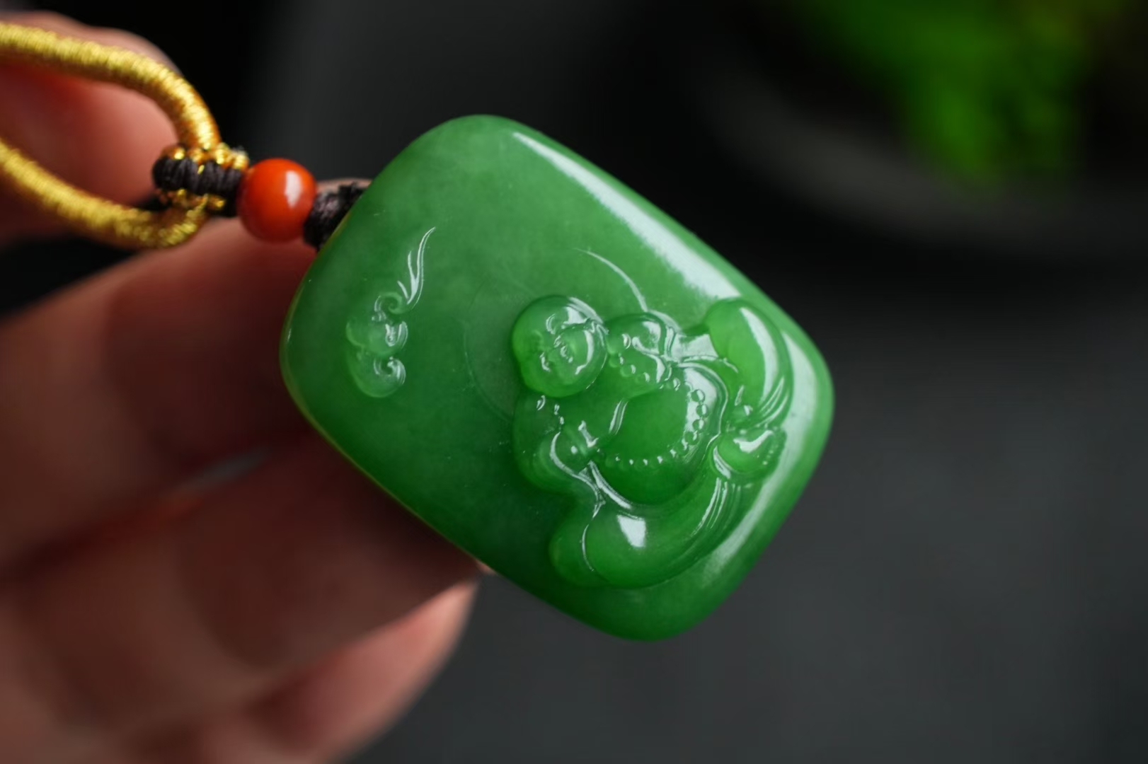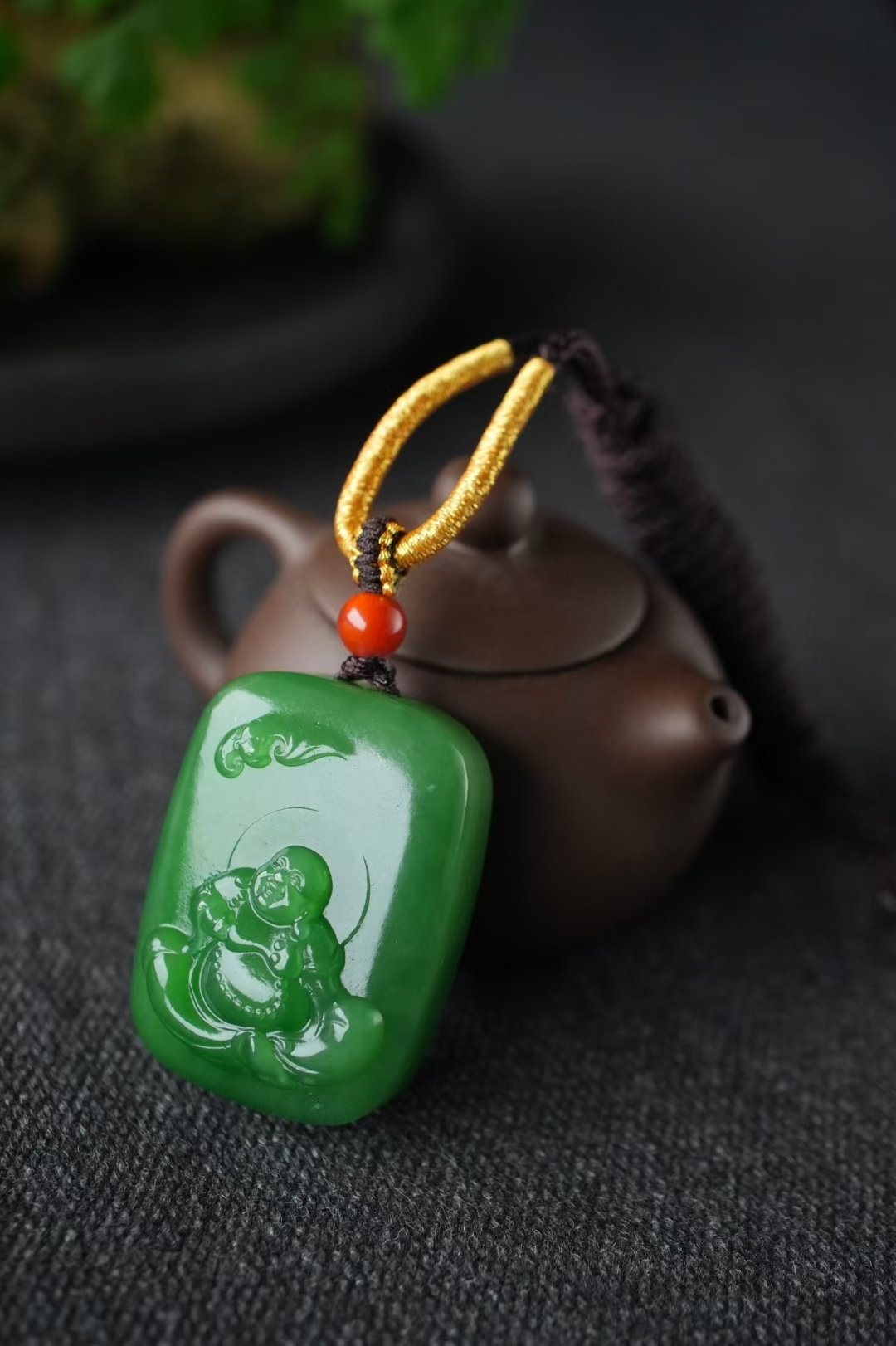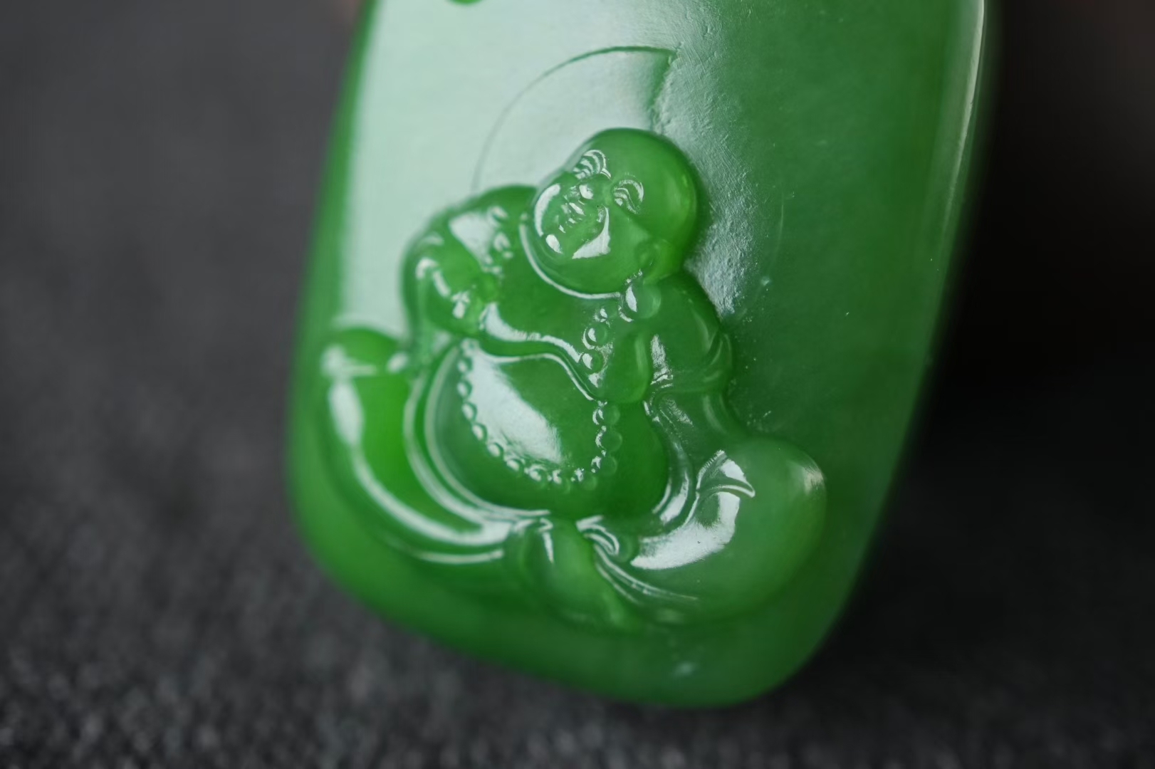 • 和田玉濃郁果綠笑口常開彌勒佛掛件,天然和田玉軟玉