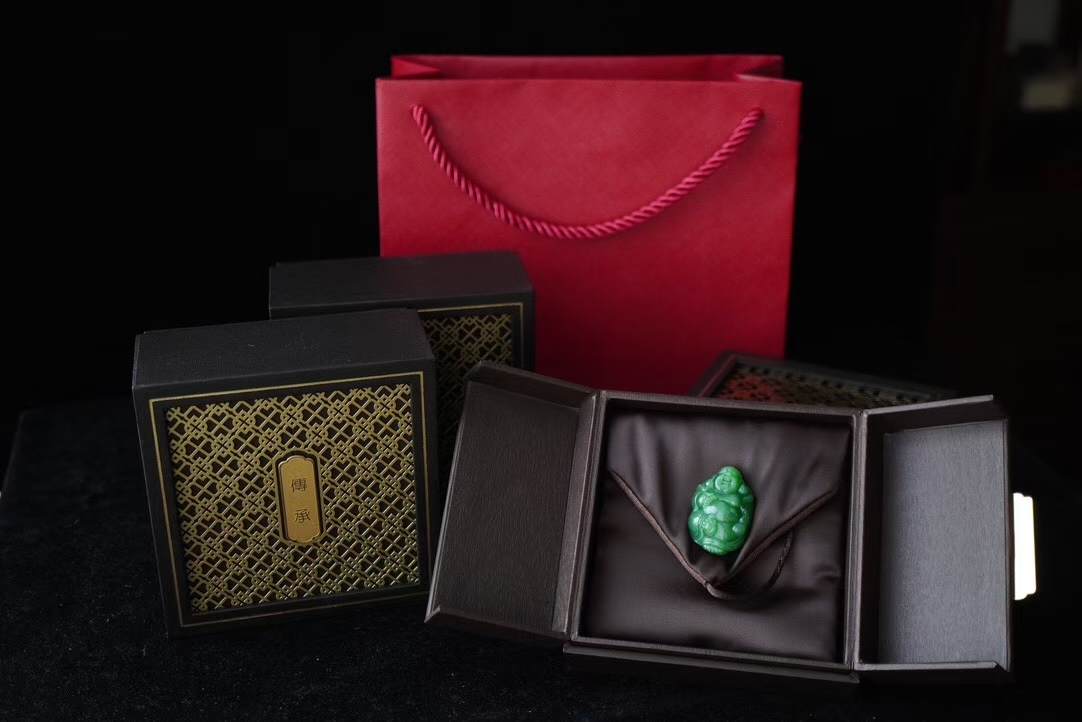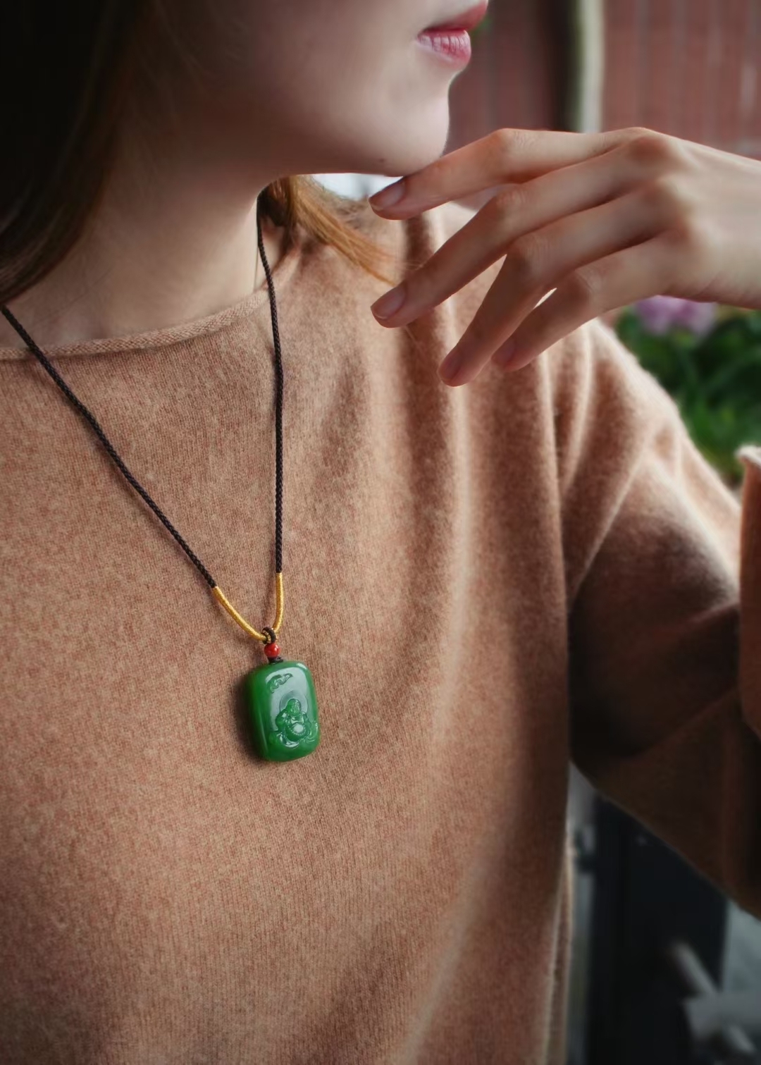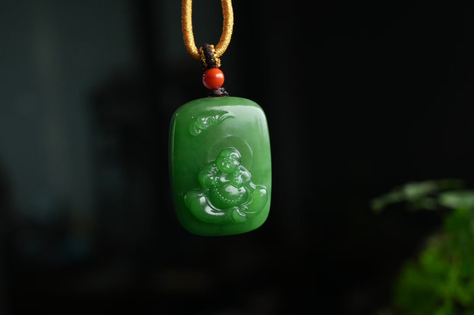• 和田玉濃郁果綠笑口常開彌勒佛掛件,天然和田玉軟玉