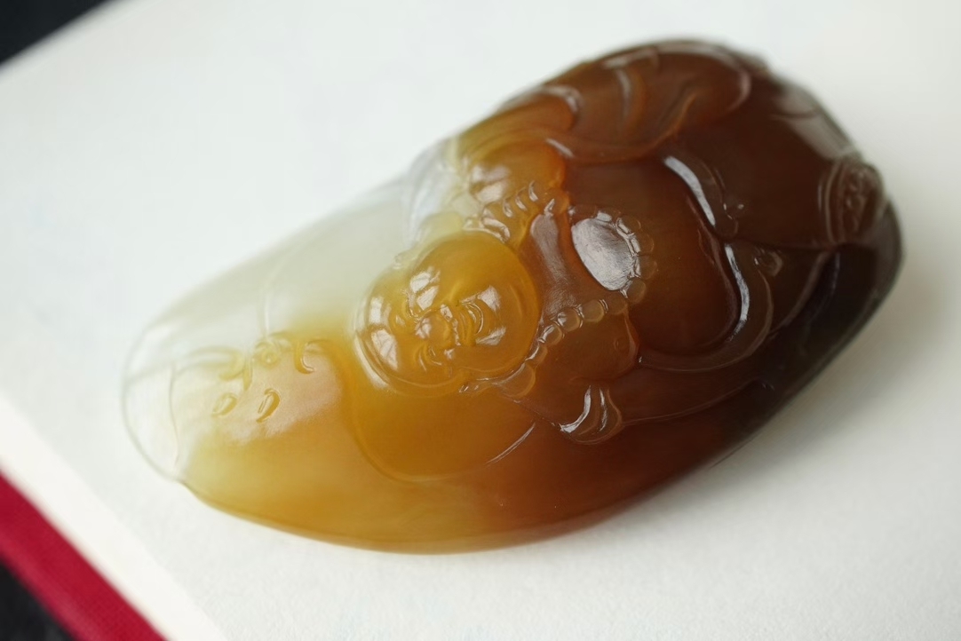糖色部分俏色巧雕彌勒佛一尊,彌勒開臉喜氣,手提福袋姿態閒適,衣褶五官纖微畢現,雕刻線條流暢圓潤,整體寓意笑口常開,福到眼前,小精品值得收藏。