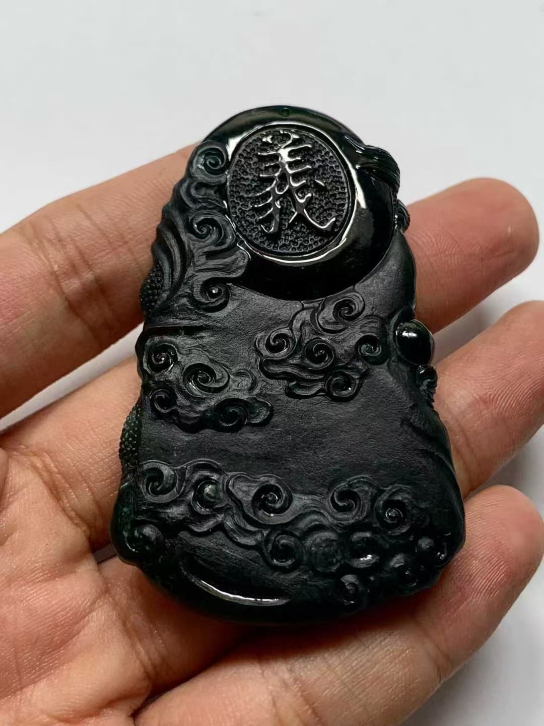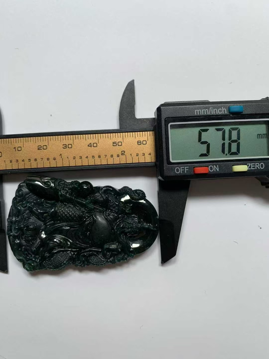 天然翡翠A玉,緬料莫西沙老料子,黑度好,底色純綠乾淨,滿滿一整件起冰起膠,罕見品質,燈照透綠,完美無紋裂,雕工精美。