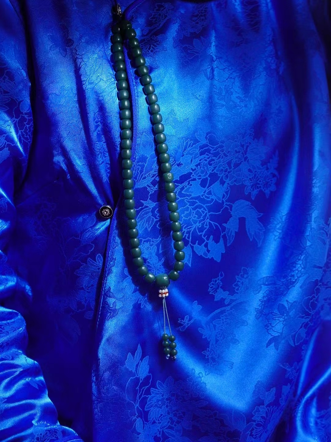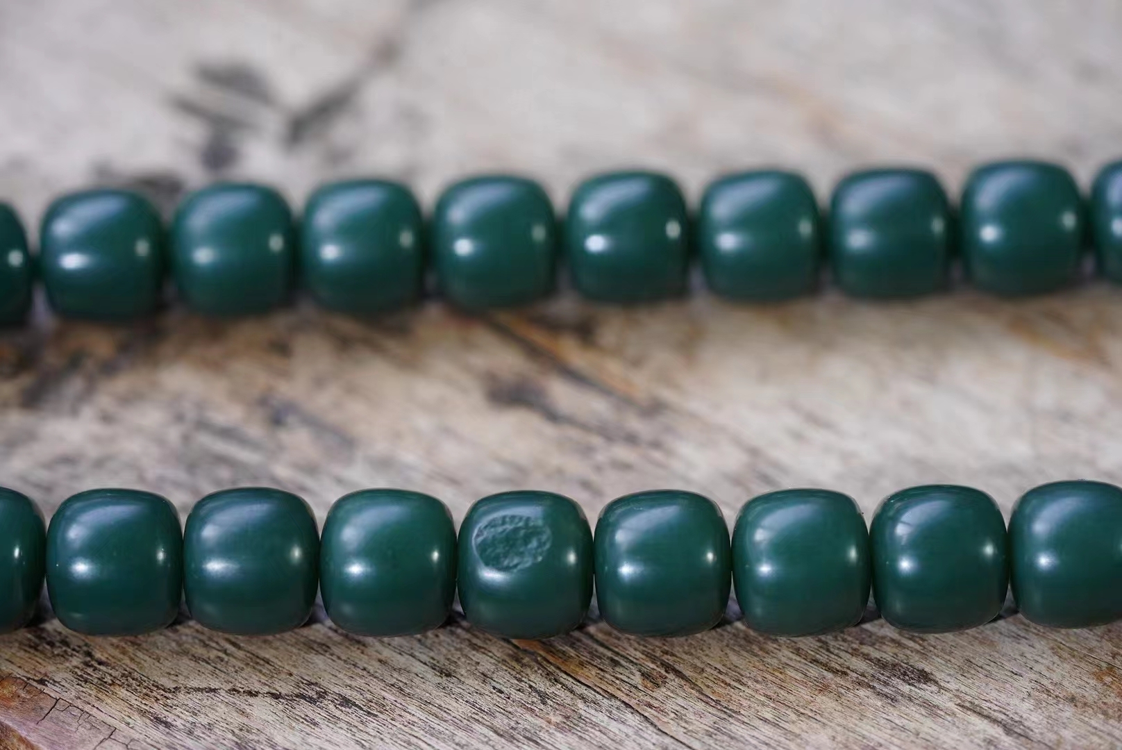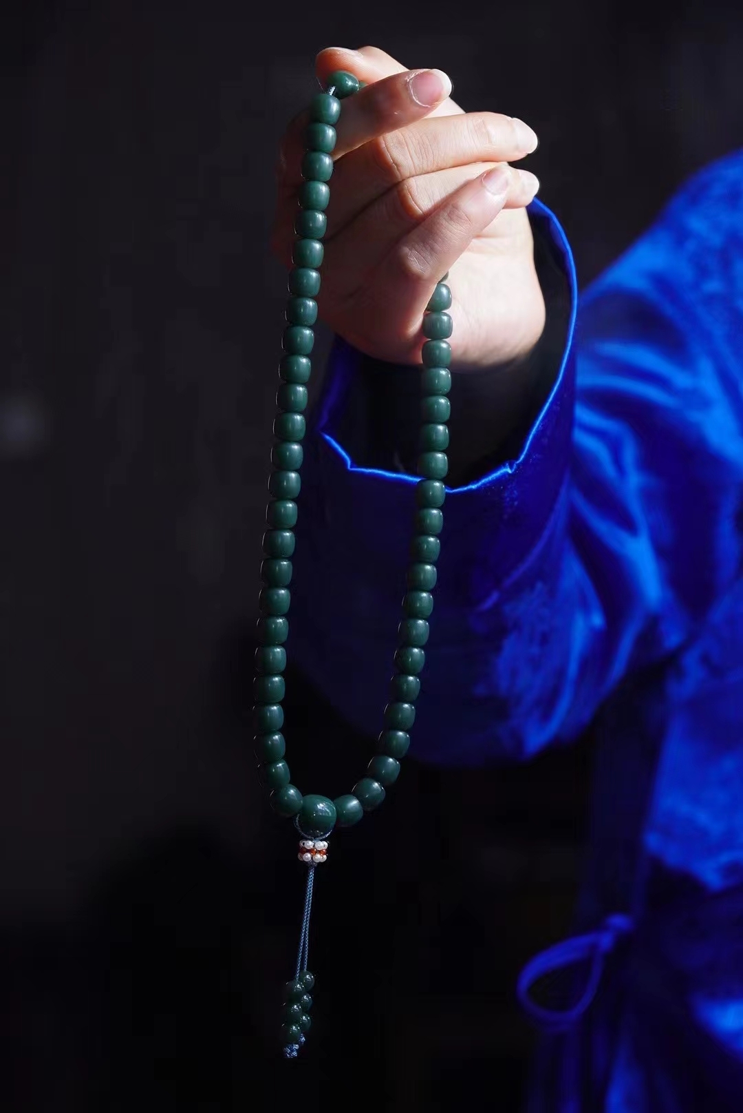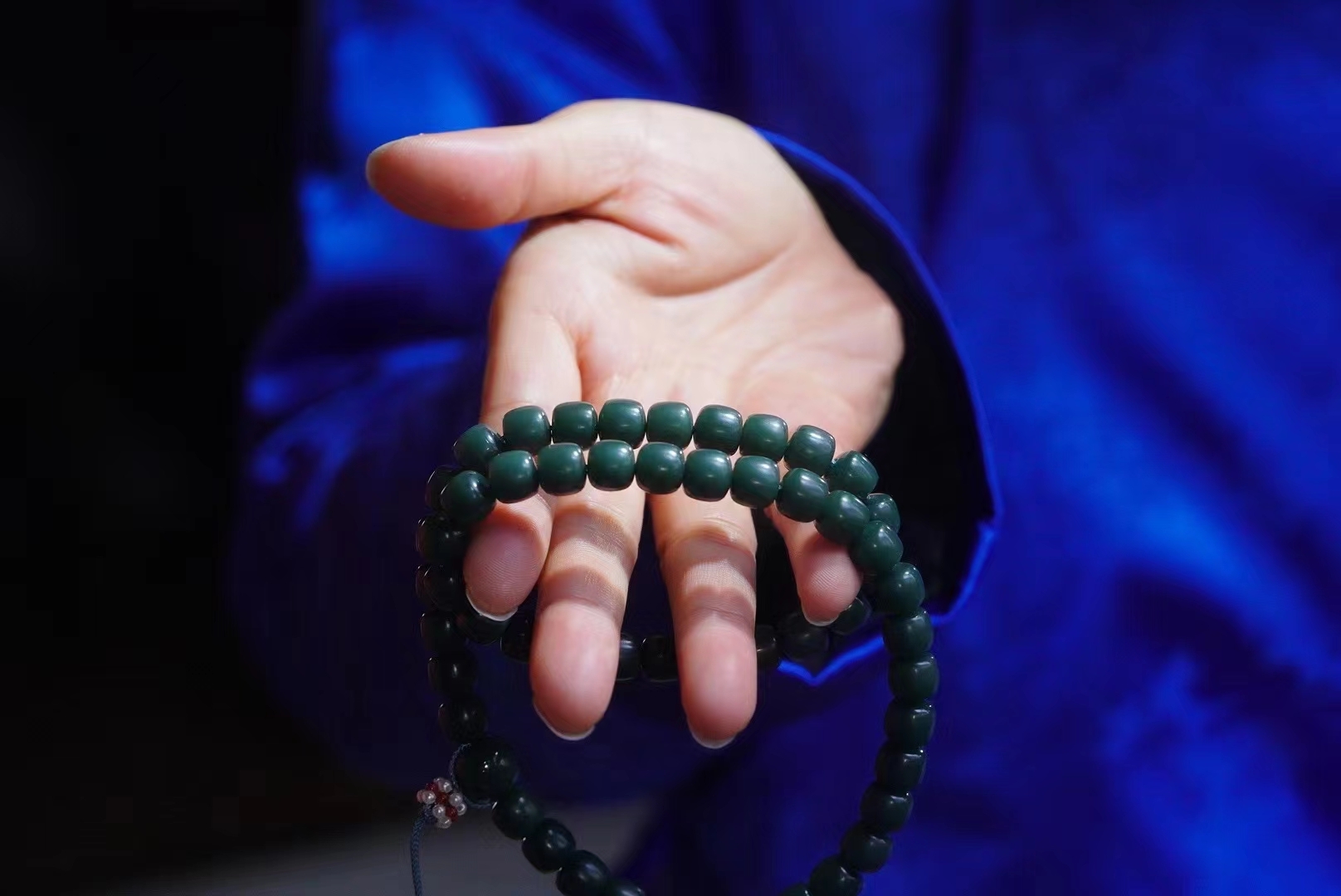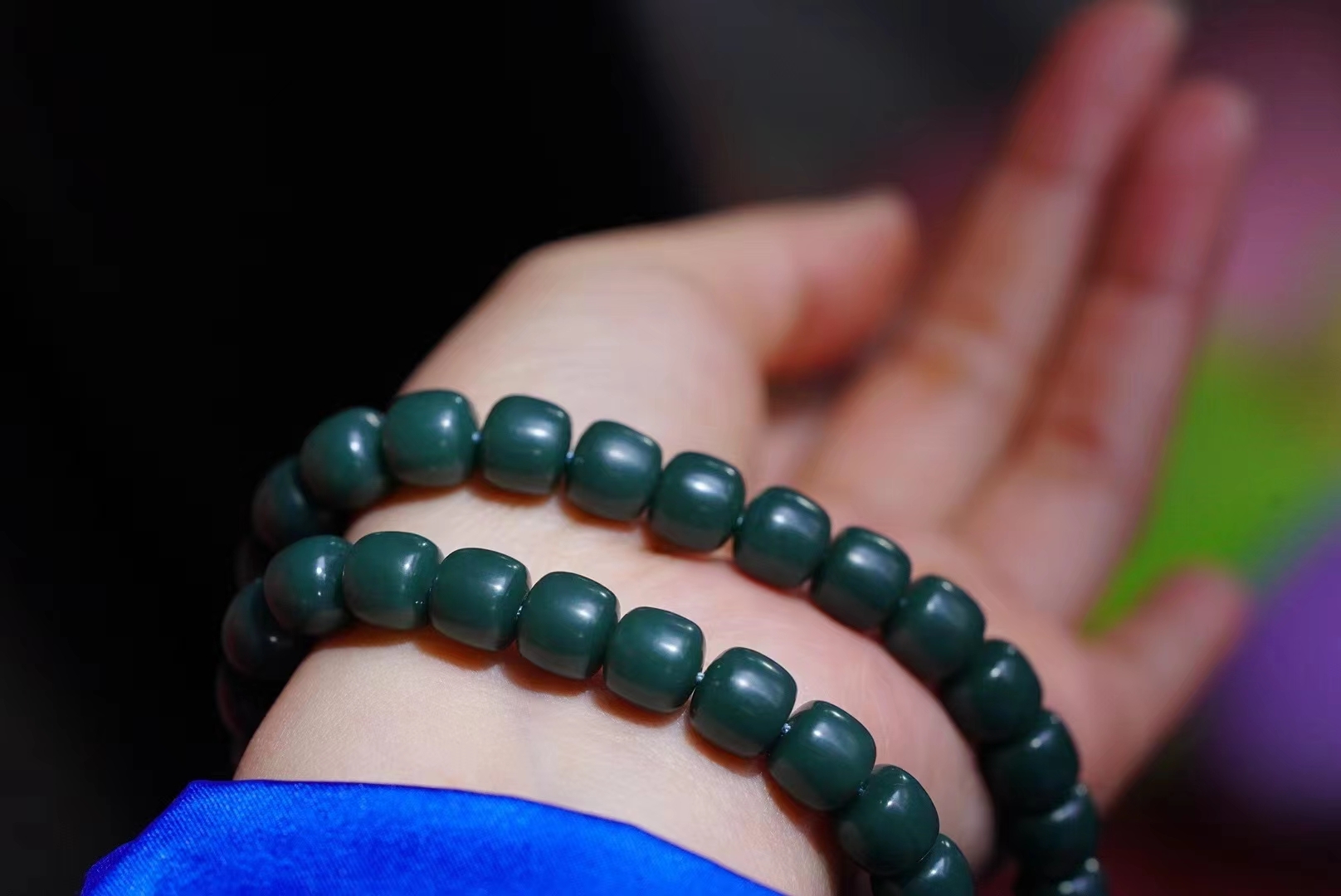 新疆和田玉戈壁旱籽手串手持。稀有戈壁料沙棗青帶皮,油潤潤的手感非常舒服,帶藍調色。性價比超高。
