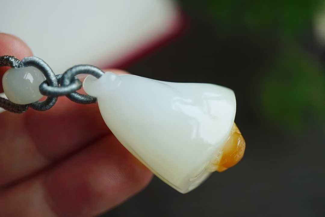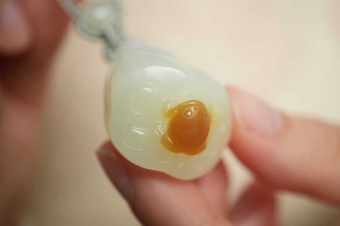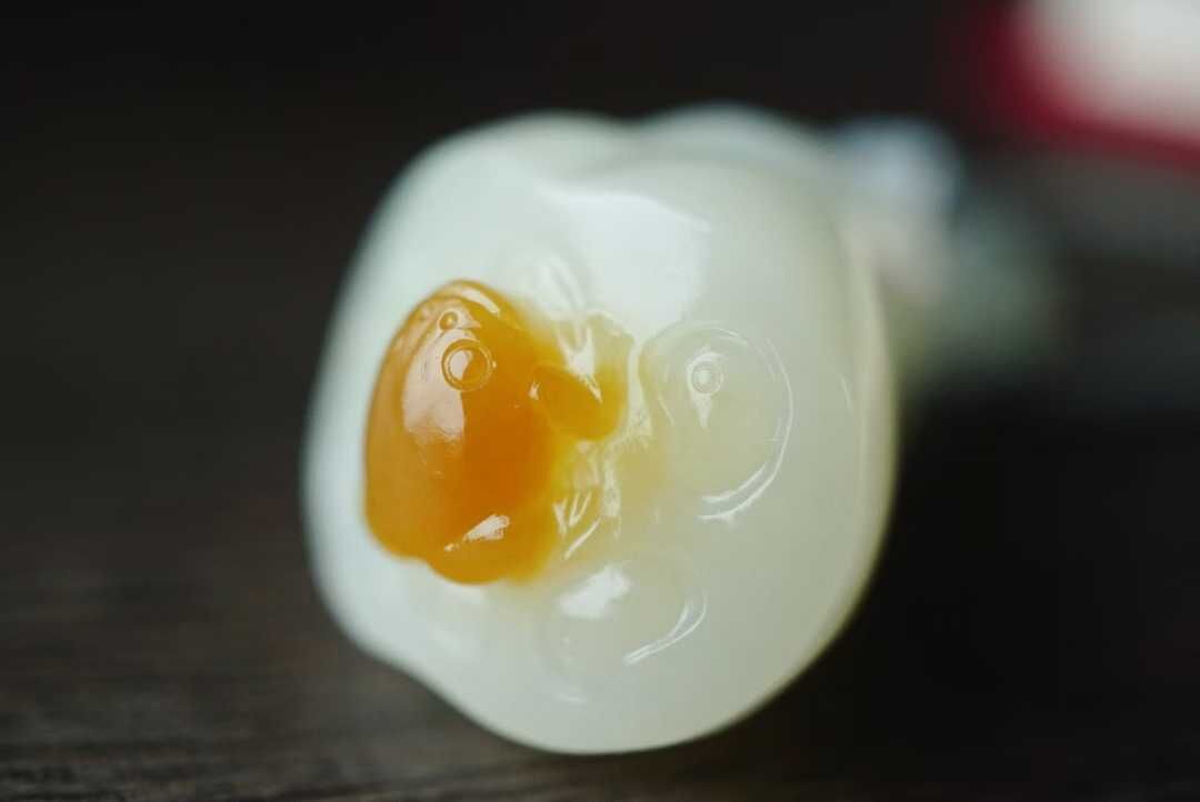 天然和田玉,且末老坑糖白料,純手工俏色巧雕。天然糖色明艷,白肉部分達到羊脂白,料子油潤凝實手推出油的細膩感,達到過燈純淨,無棉無水線,無雜無裂完美品相。