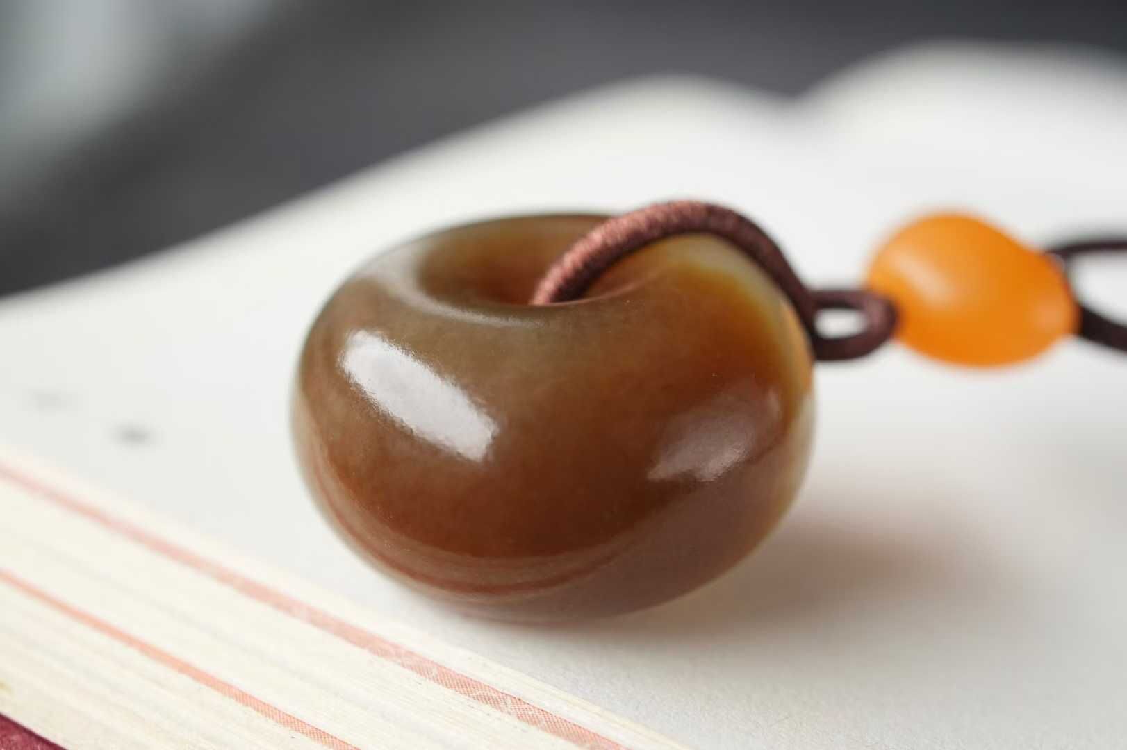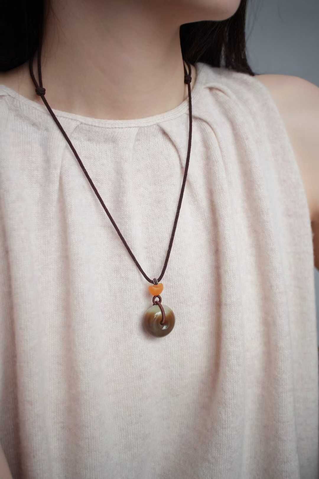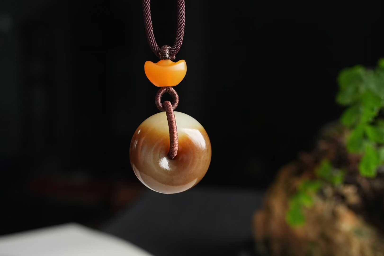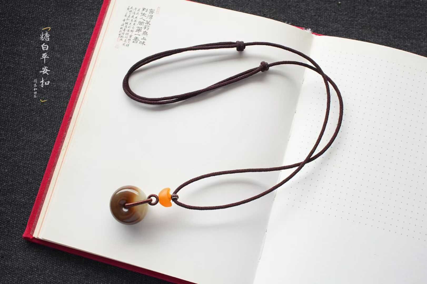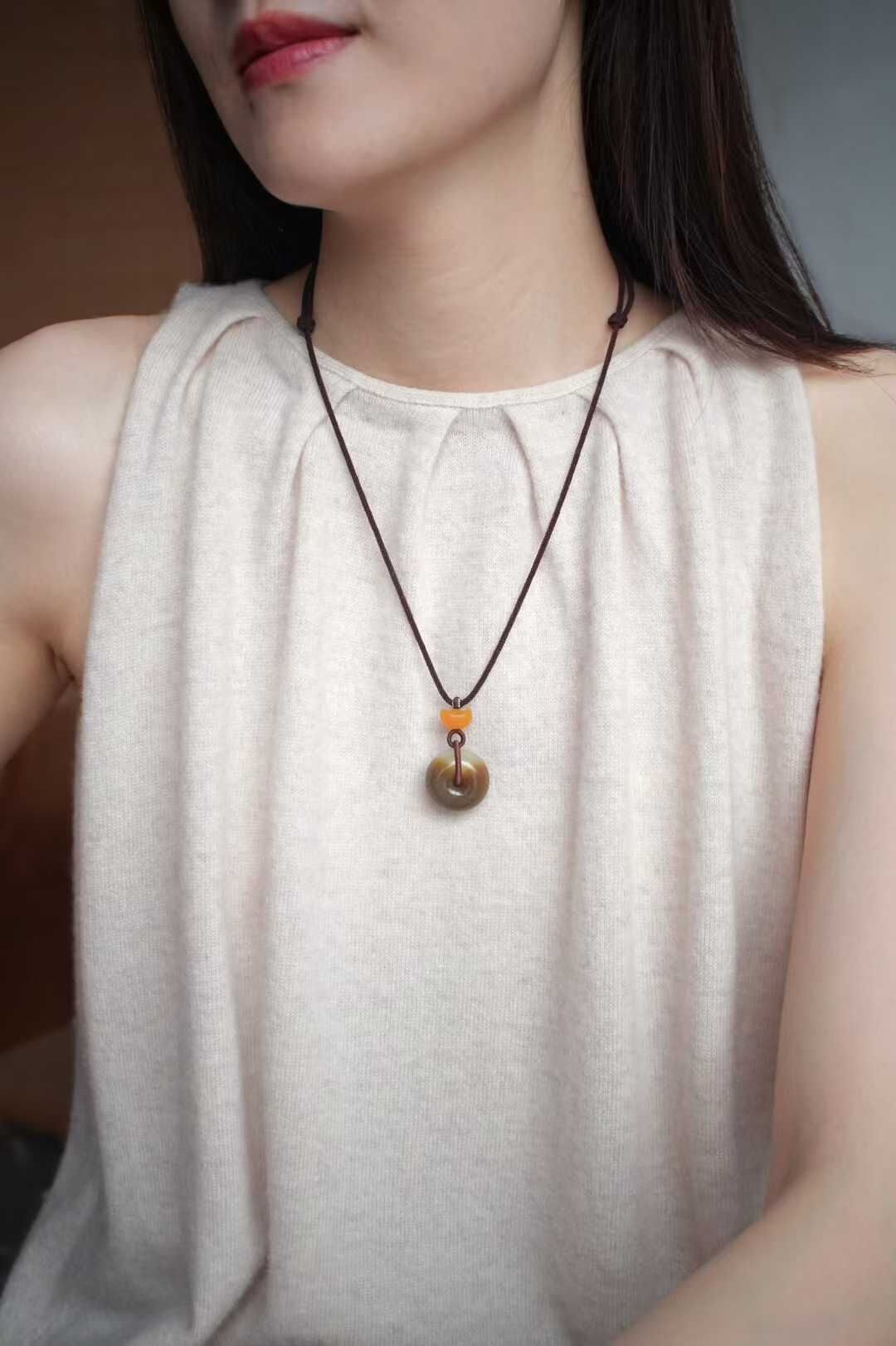 平安扣寓意平安圓滿,雙面皆可佩戴。搭配純手工制作繩,點綴緬黃元寶,財氣福氣兩手抓!