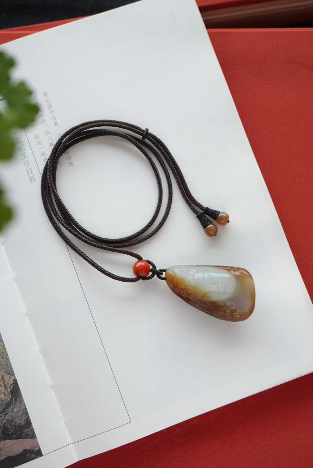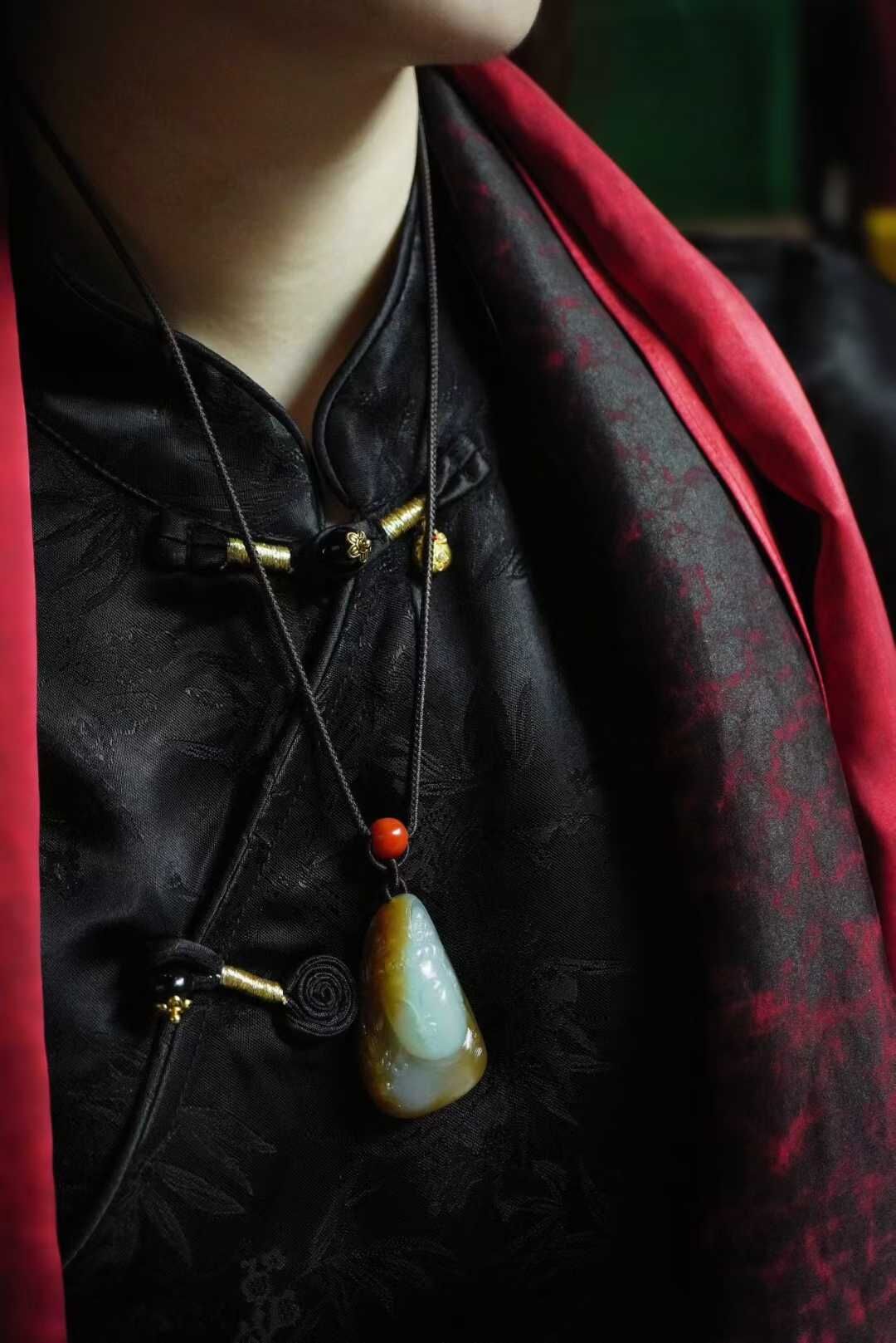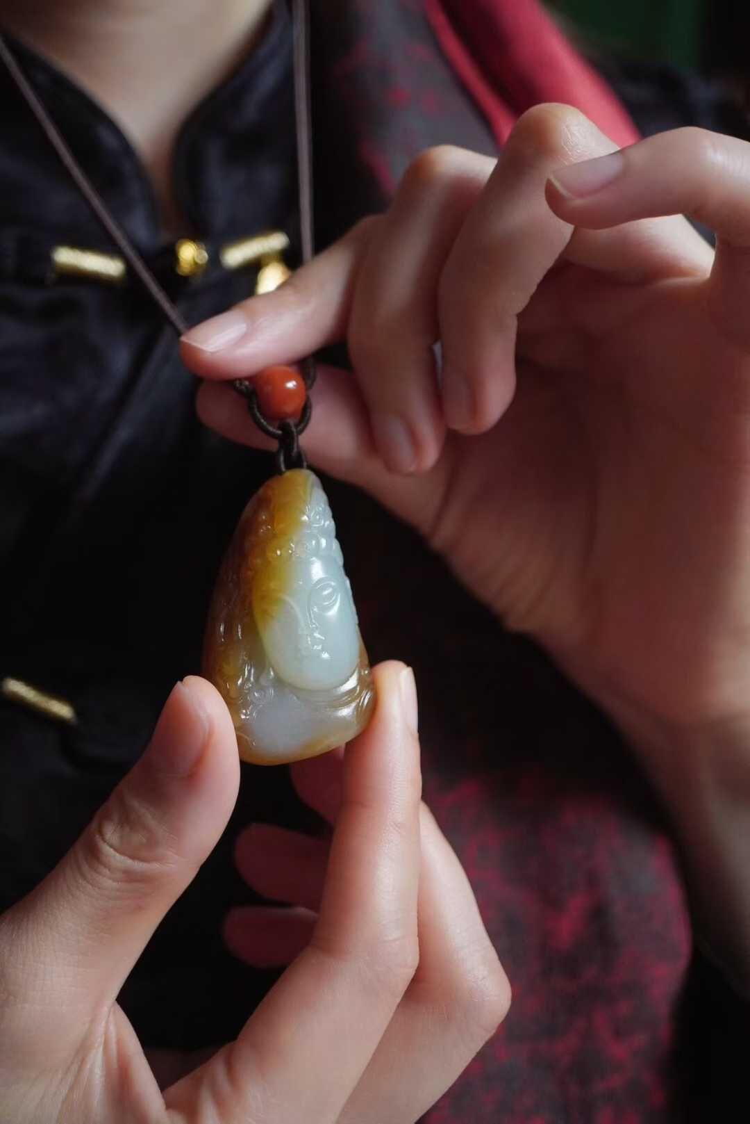 降龍觀音代表了智慧勇敢和大慈大悲的化身,寓意驅邪避煞保平安。搭配純手工制作繩,繞線精緻牢固,黑檀木鈴鐺連接純糖老型珠作尾墜,滿肉南紅路路通點綴,佩戴典雅大方。