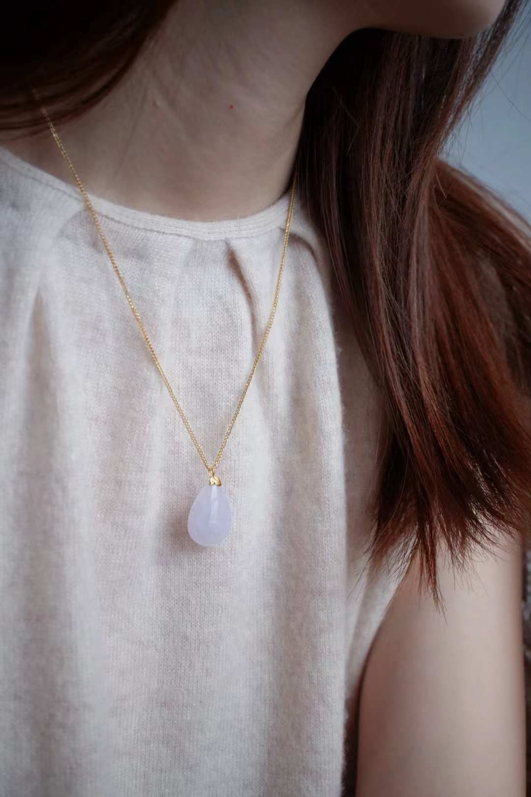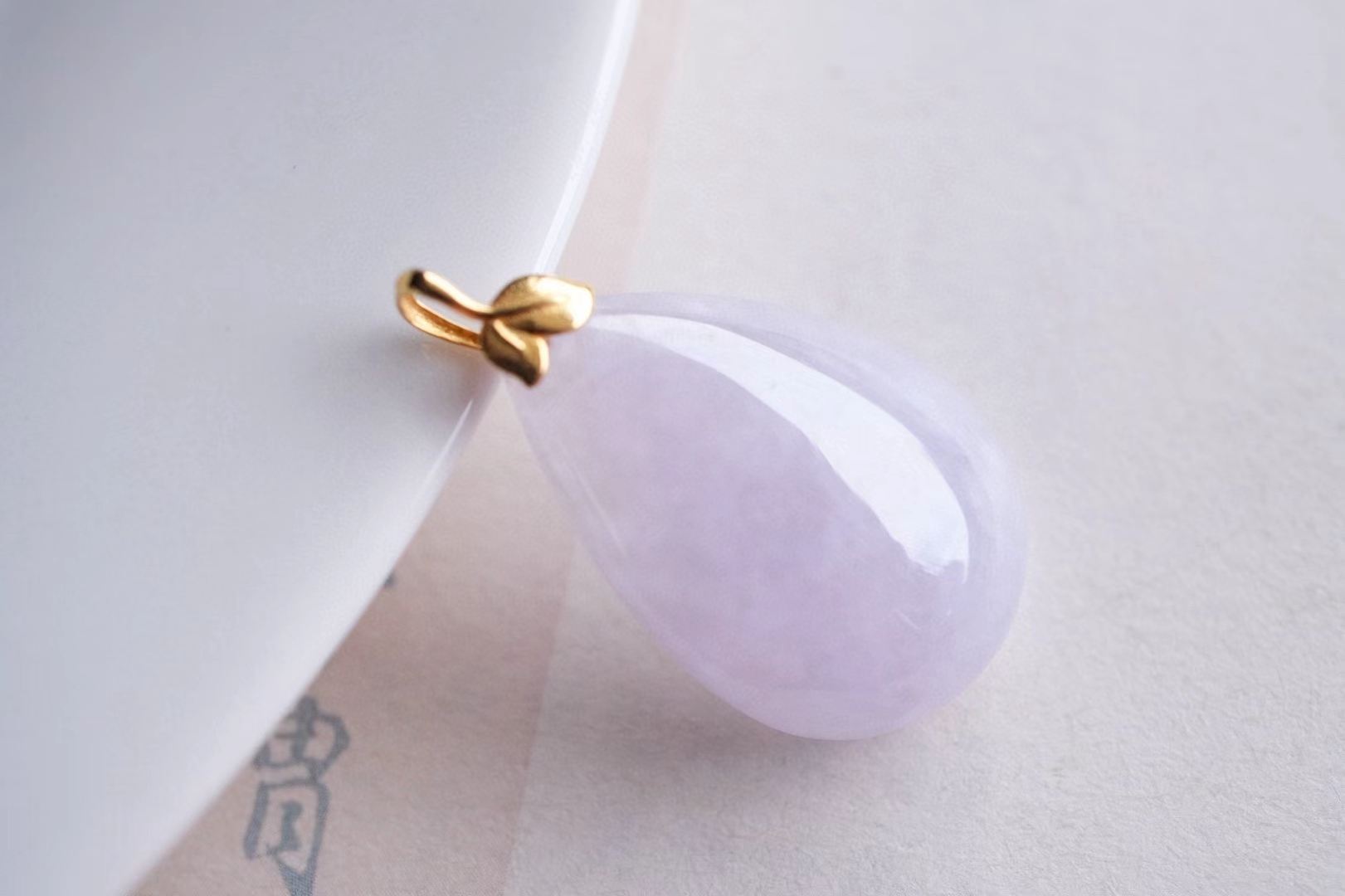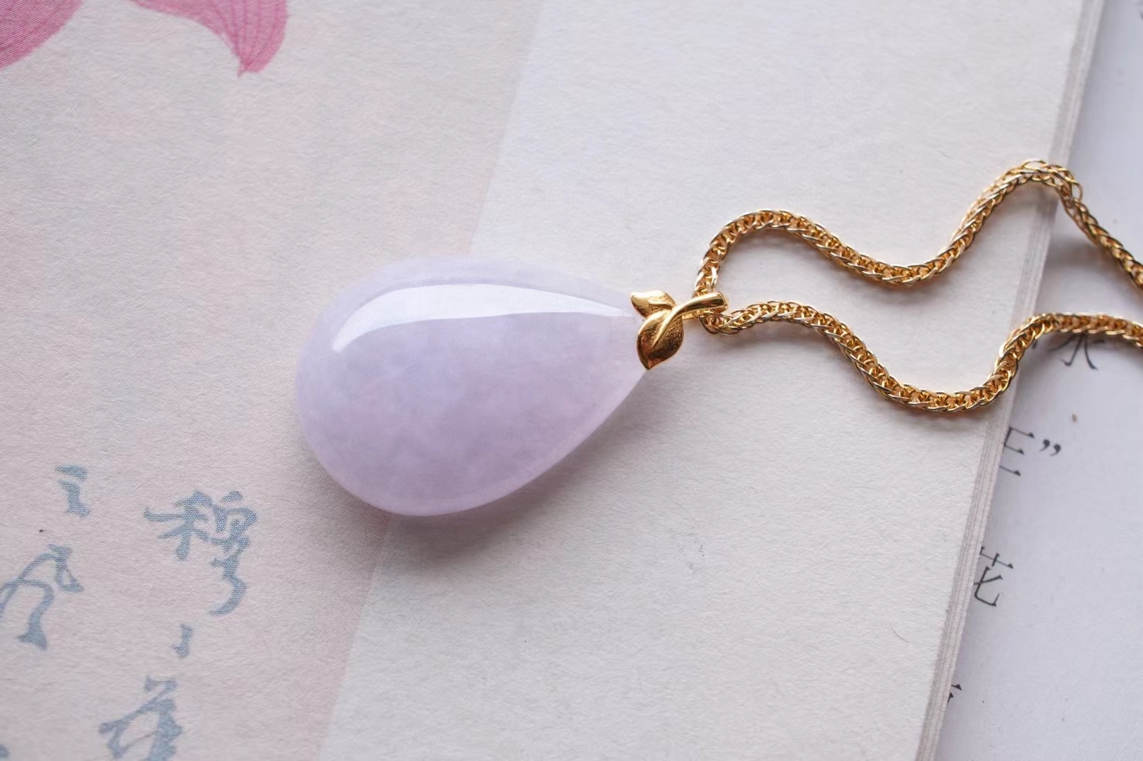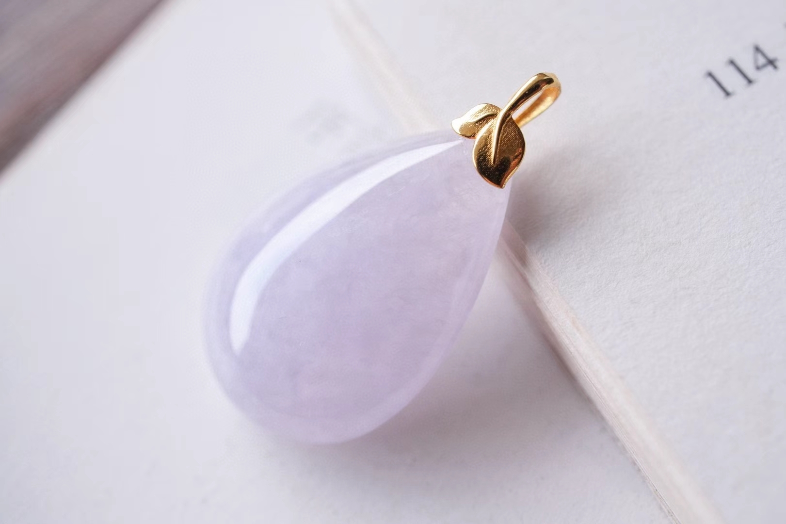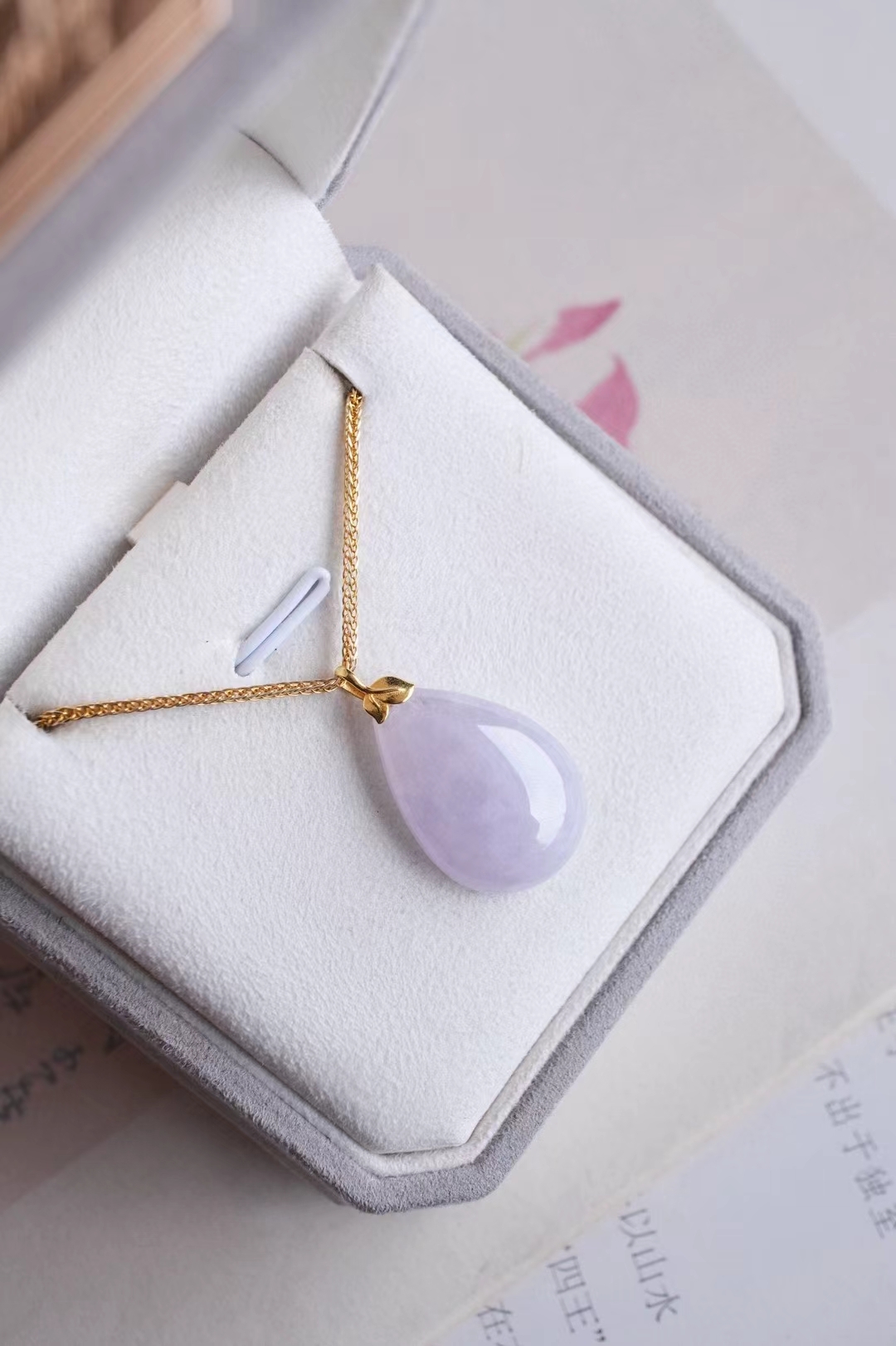 天然翡翠A玉,緬料,潤潤的胖水滴,像一塊年糕,粉紫色調,上身很美好,給人輕聲慢語的溫柔感覺。18K金精工鑲嵌。