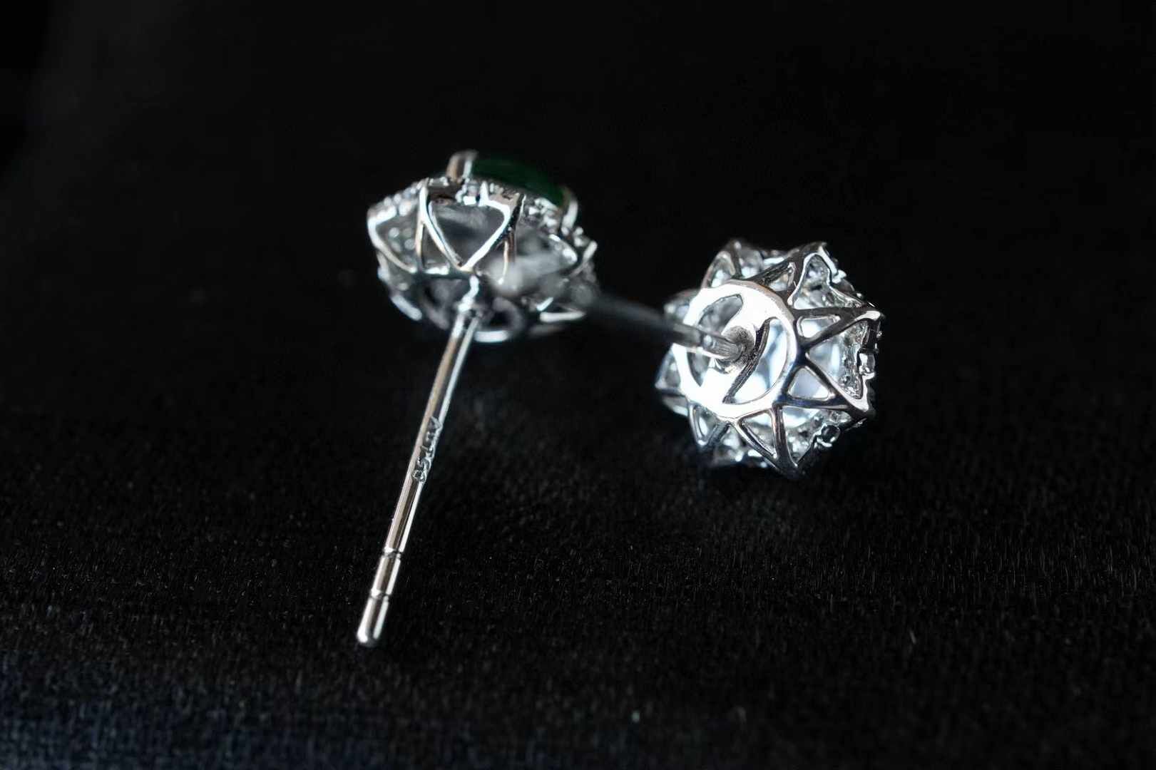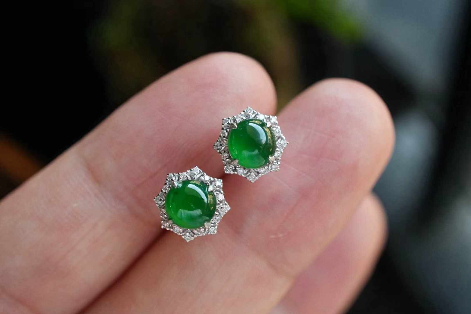 • 翡翠冰陽綠蛋面耳釘,天然翡翠A玉, 緬甸玉, Jade, Jadeite