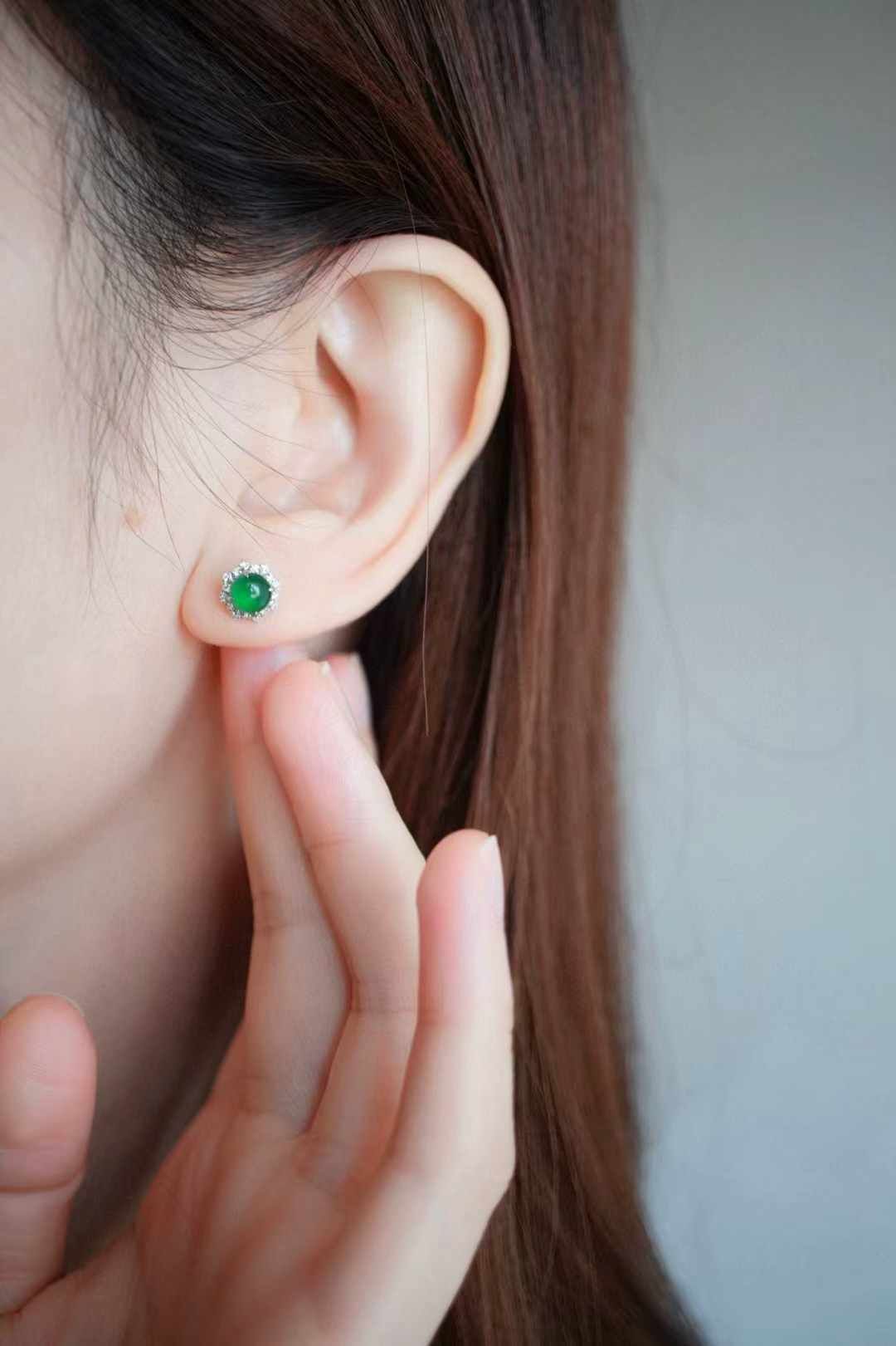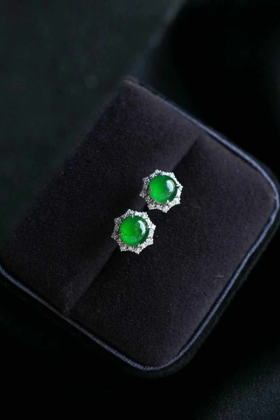 天然翡翠A玉,裸石品質絕了,冰陽綠,種色俱佳上耳非常有靈氣,性價比十足!18K金鑽石鑲嵌,強烈推薦!