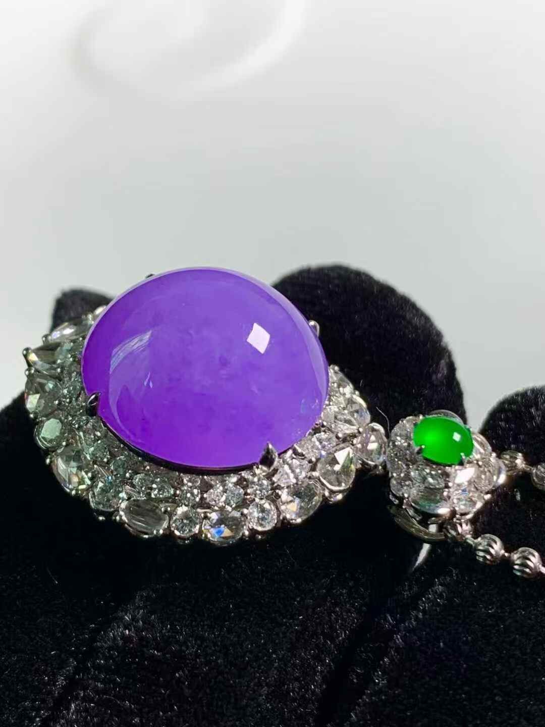 天然翡翠A玉,紫色濃郁,18K金鑲嵌,光彩亮麗迷人。